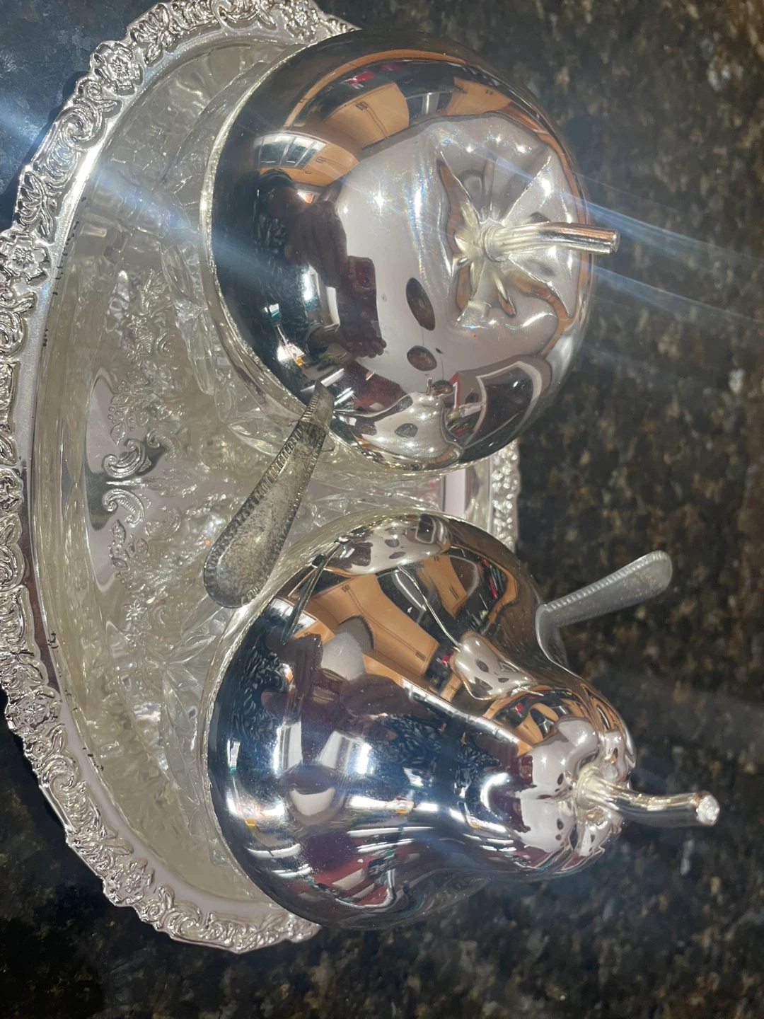 This set features two decorative containers, shaped like an apple and a pear, with silver-tone lids. It also includes two spoons and sits on an ornate tray. The containers are made of clear, cut crystal glass.