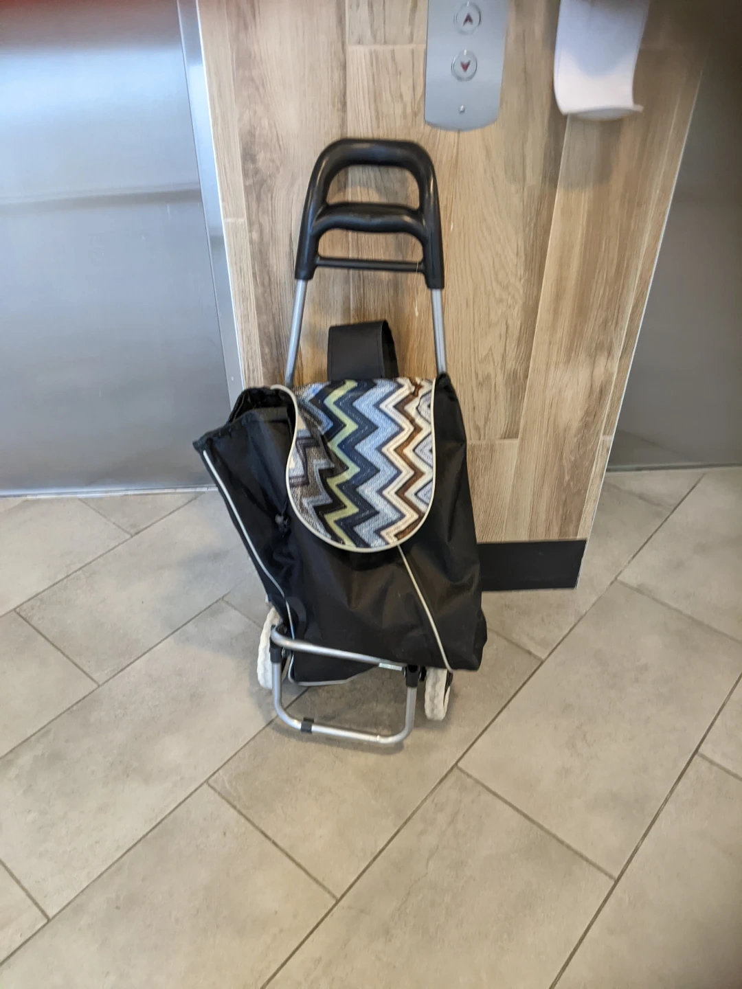 Black shopping trolley bag with a decorative chevron pattern flap. It has a sturdy frame and two wheels for easy transport. This bag is handy for groceries or market trips.