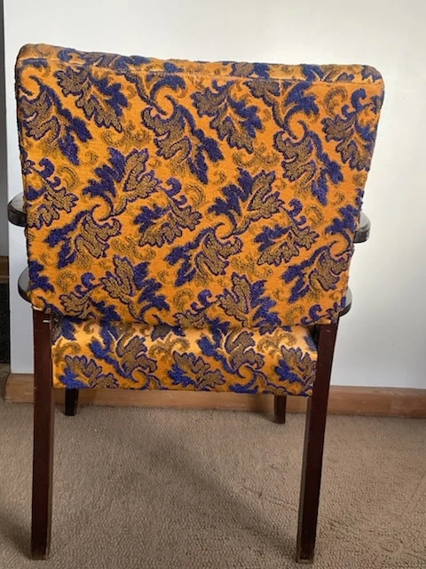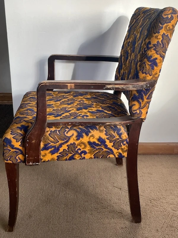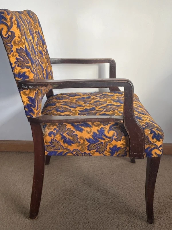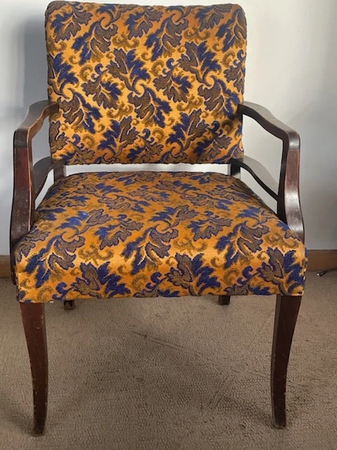 This vintage reupholstered accent chair features a striking gold, blue, and brown damask-style pattern on its upholstery. It has dark wood arms and legs, showing some signs of wear consistent with its age. This chair would make a great addition to a living room or bedroom.