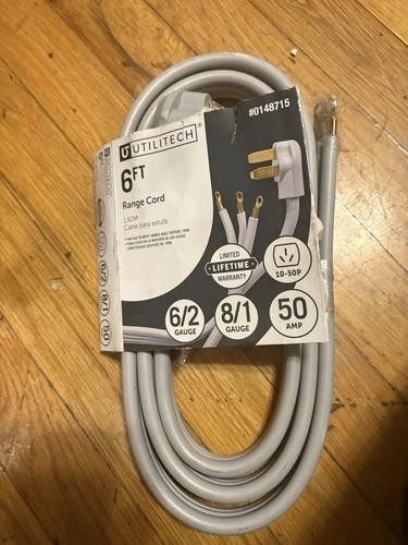 This is a 6-foot range cord with a 3-prong plug, designed for electric convection and conventional ovens/stoves. It's compatible with brands like Utilitech, Kenmore, Whirlpool, Hotpoint, and Samsung. Suitable for freestanding installation. Includes the necessary wire for installation.