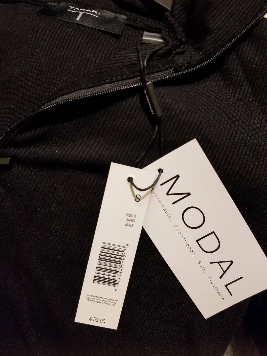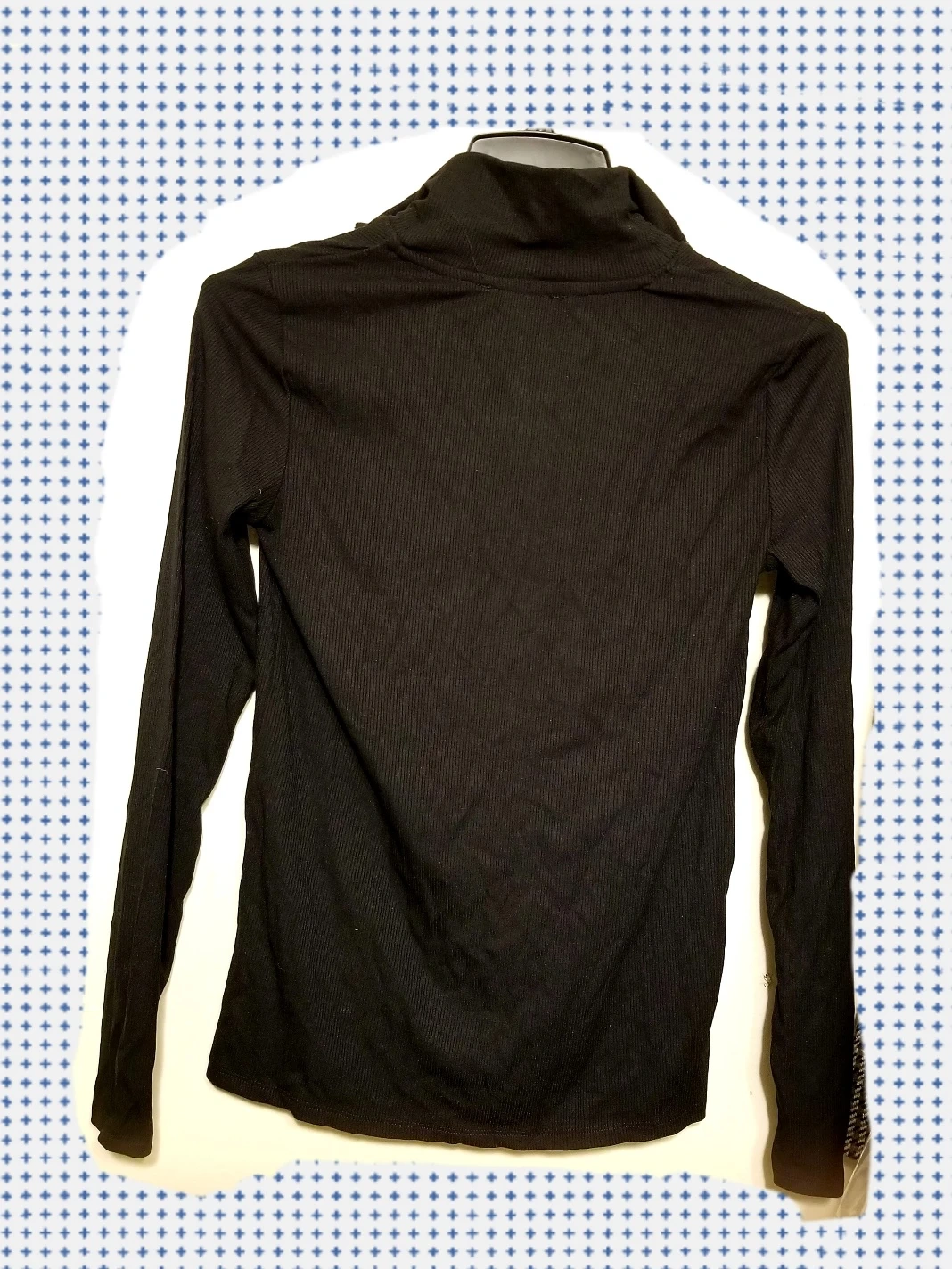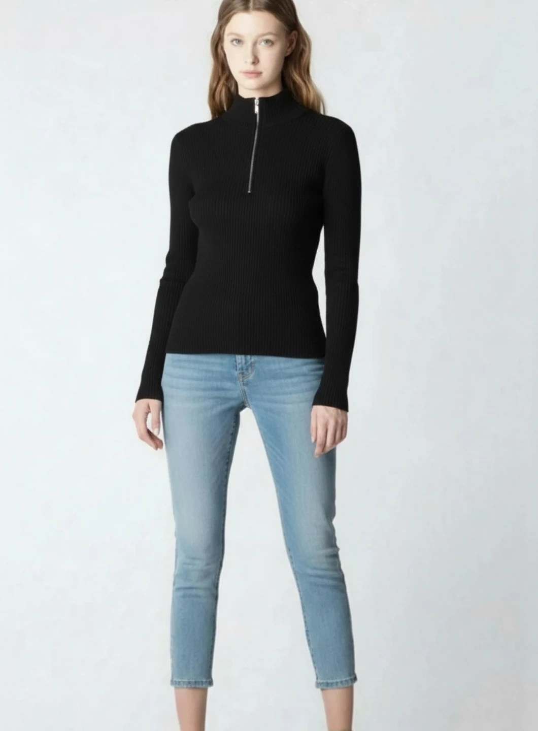 Tahari black ribbed sweater with a mock neck and zipper closure. Made from 91% Modal and 9% Spandex. This breathable fabric is soft and moisture-wicking.
