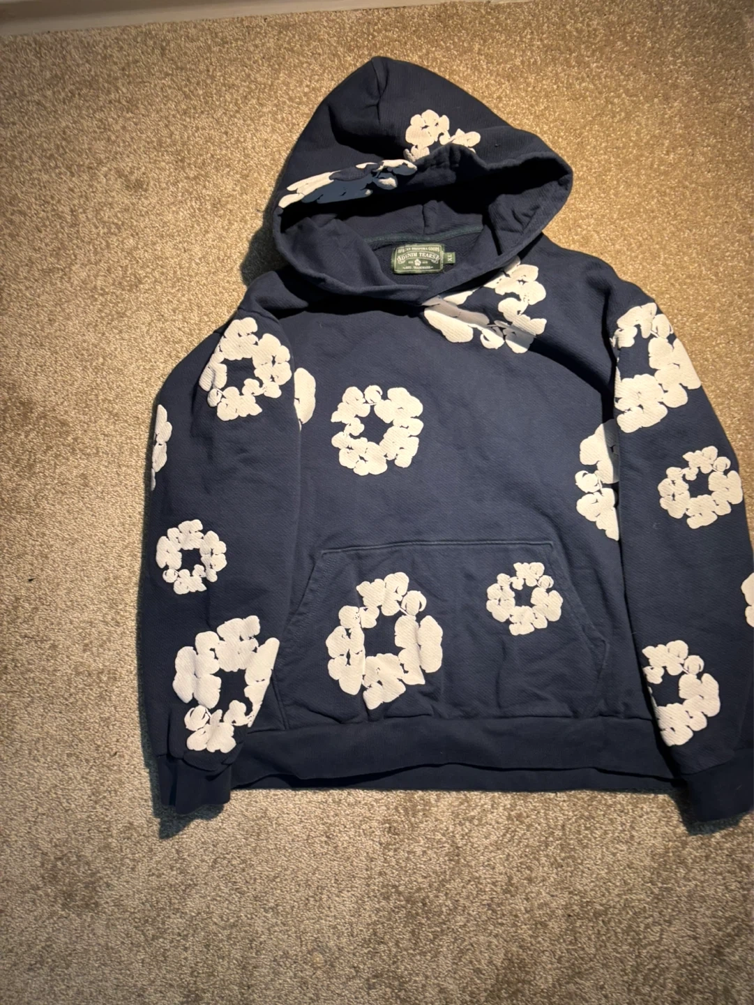 Kapital blue hoodie with a white floral pattern all over. It's a comfortable pullover style with a front pouch pocket. This hoodie is great for casual wear or layering during cooler weather.