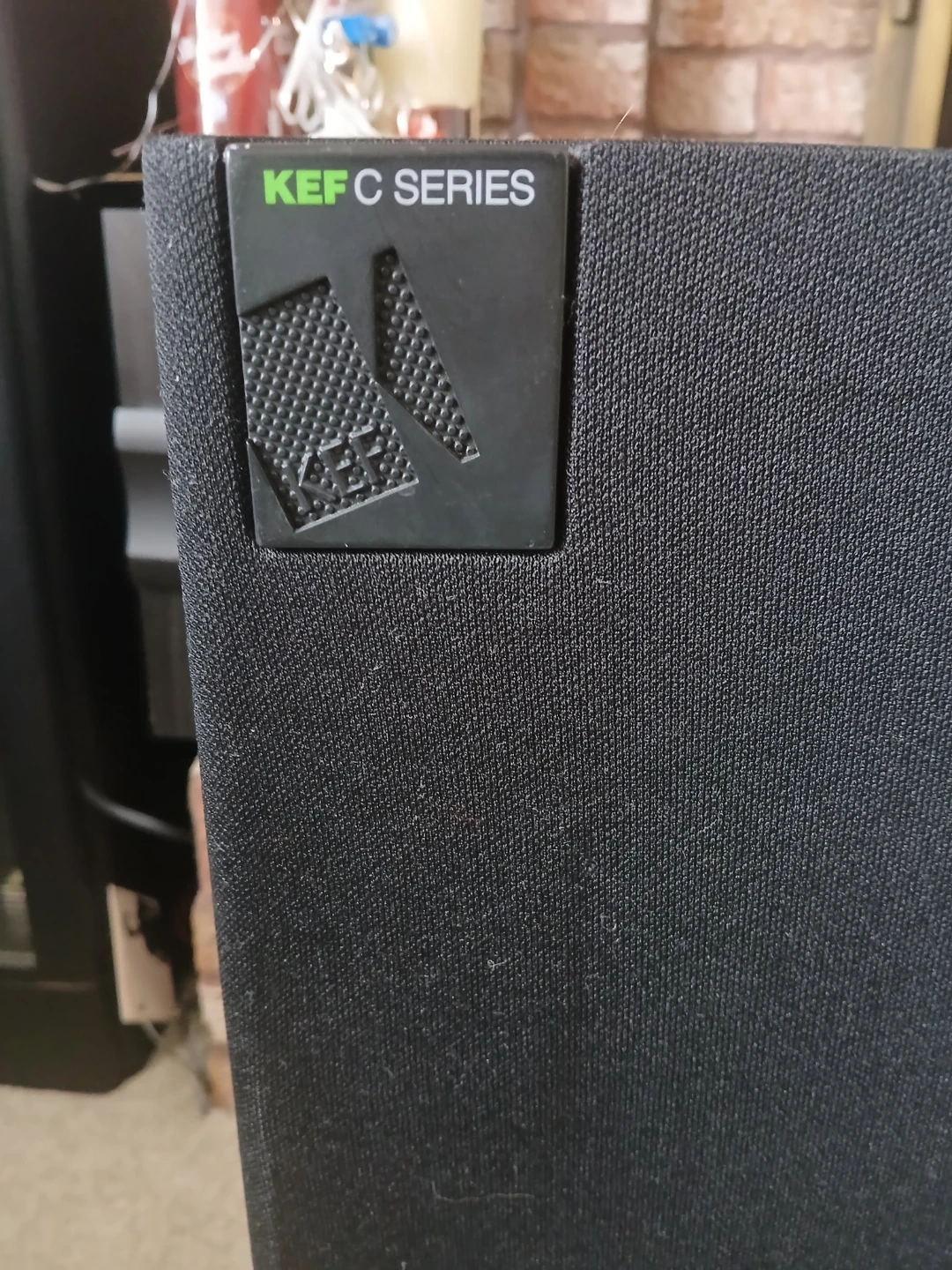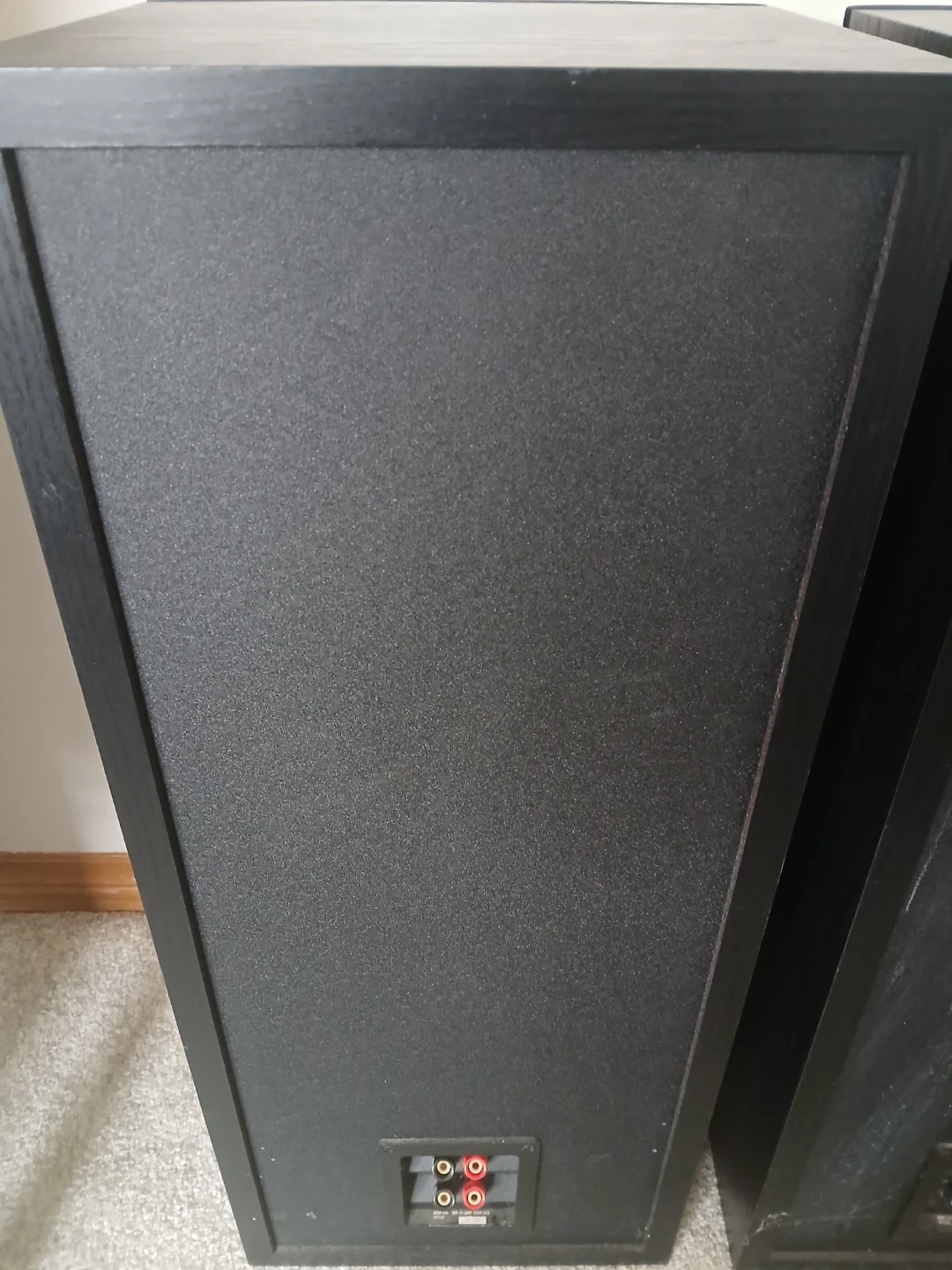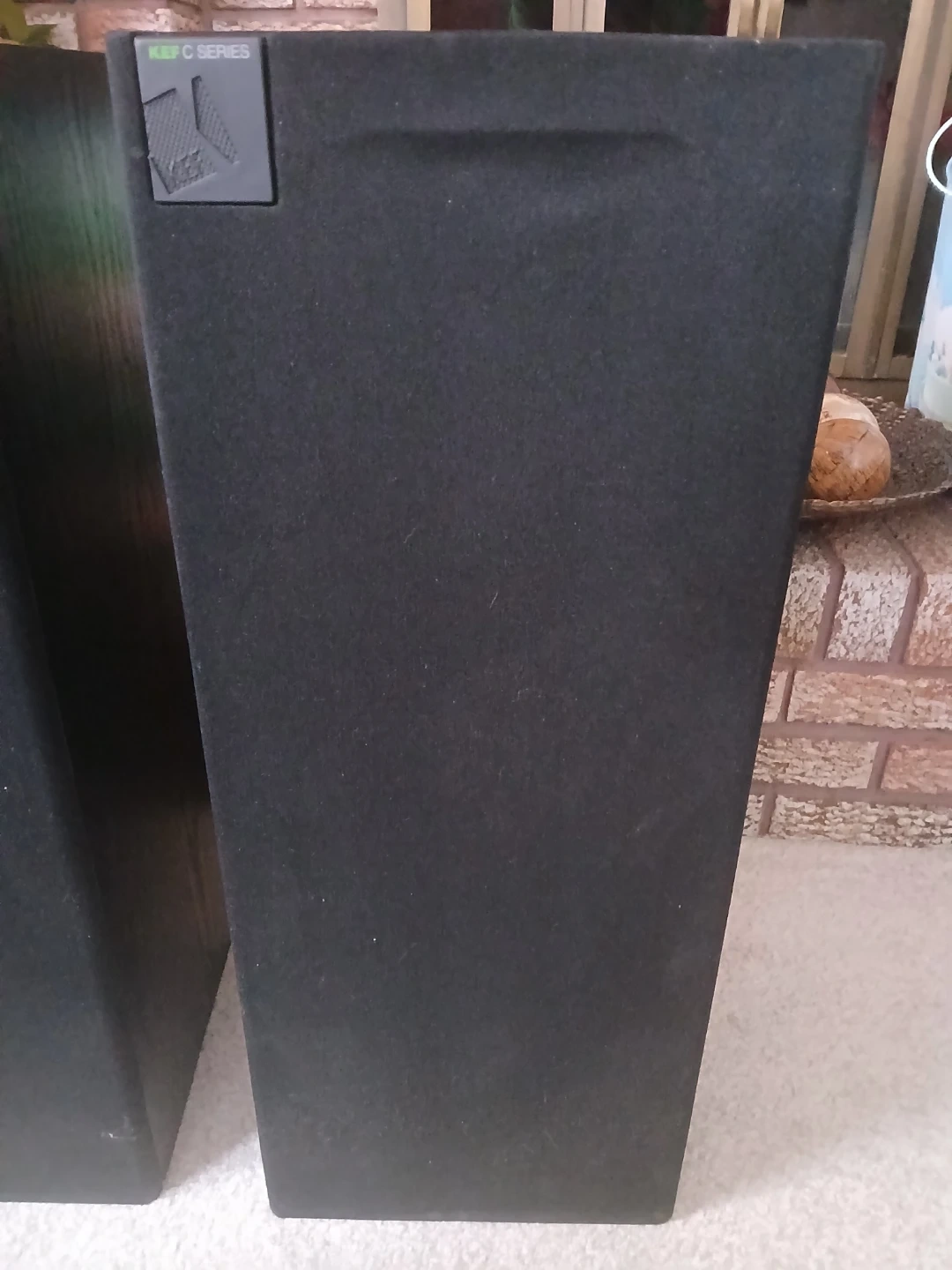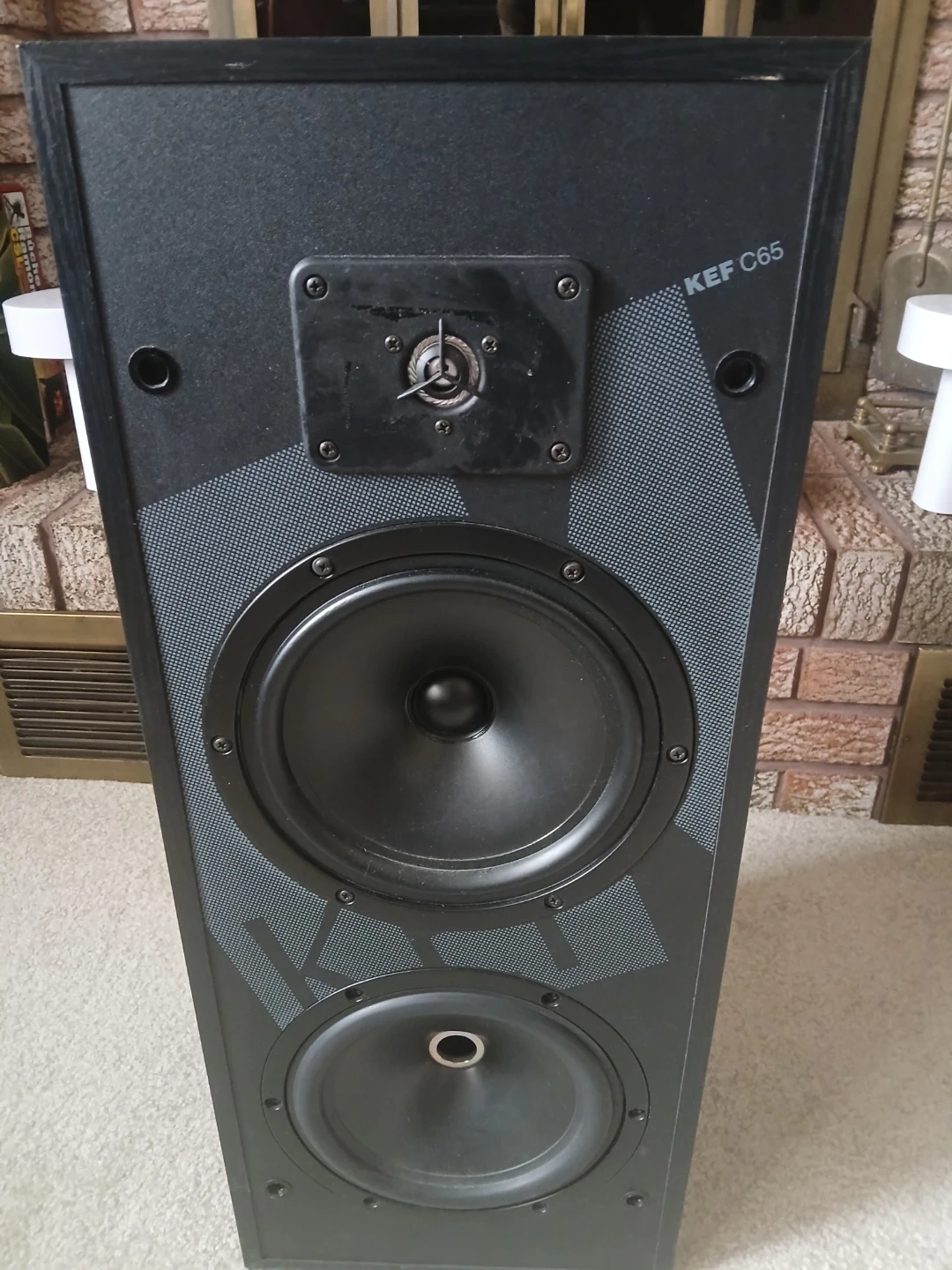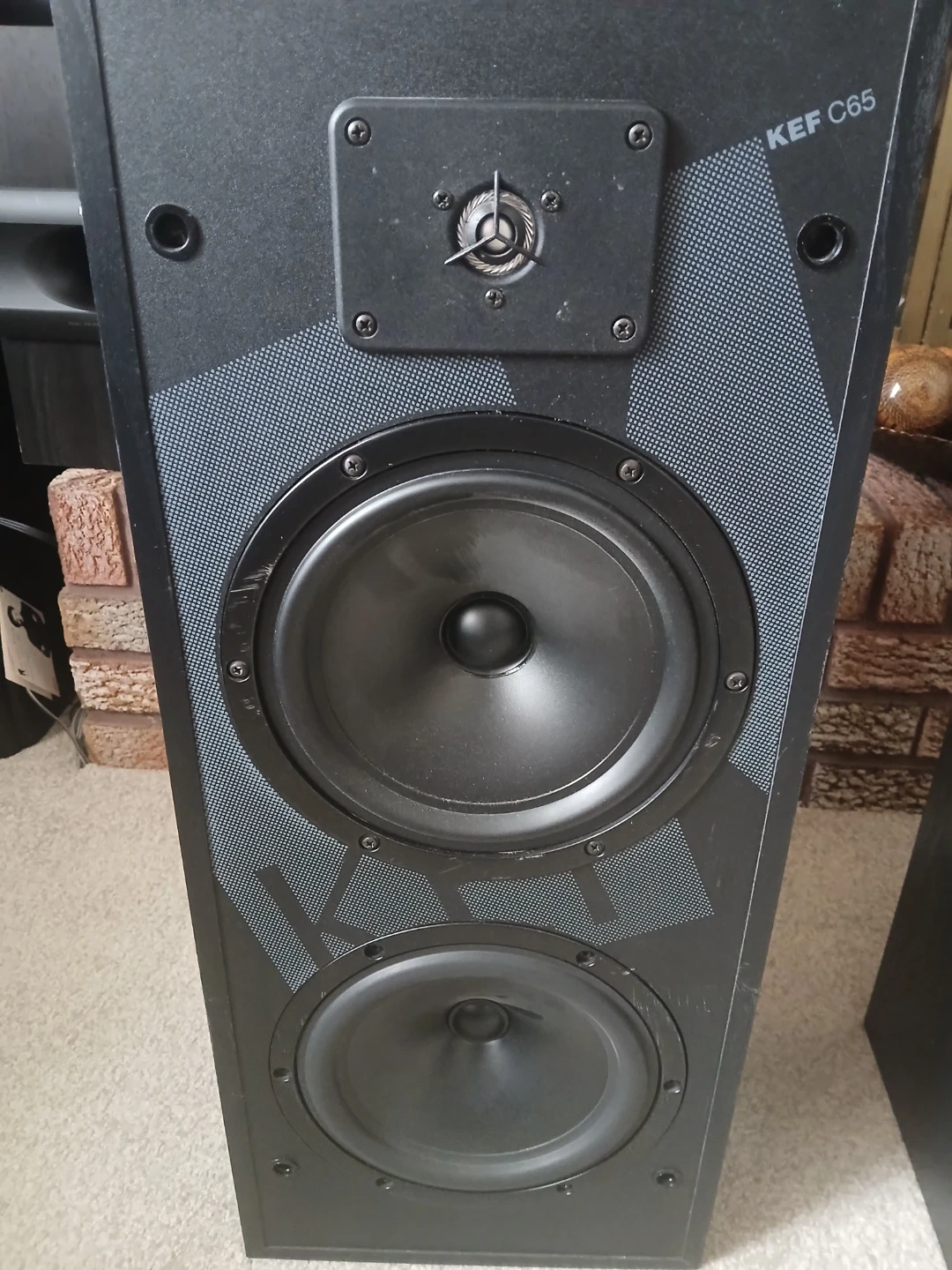 This pair of KEF C65 floorstanding speakers is in good working order. They have a sleek black finish and are designed for a rich audio experience. Each speaker features a tweeter, mid-range driver, and a bass driver.