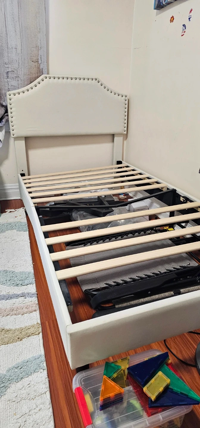 This twin bed frame features a white upholstered headboard with nailhead trim. It includes a wooden slat support system for a mattress. A fitted sheet is also shown covering the mattress area.