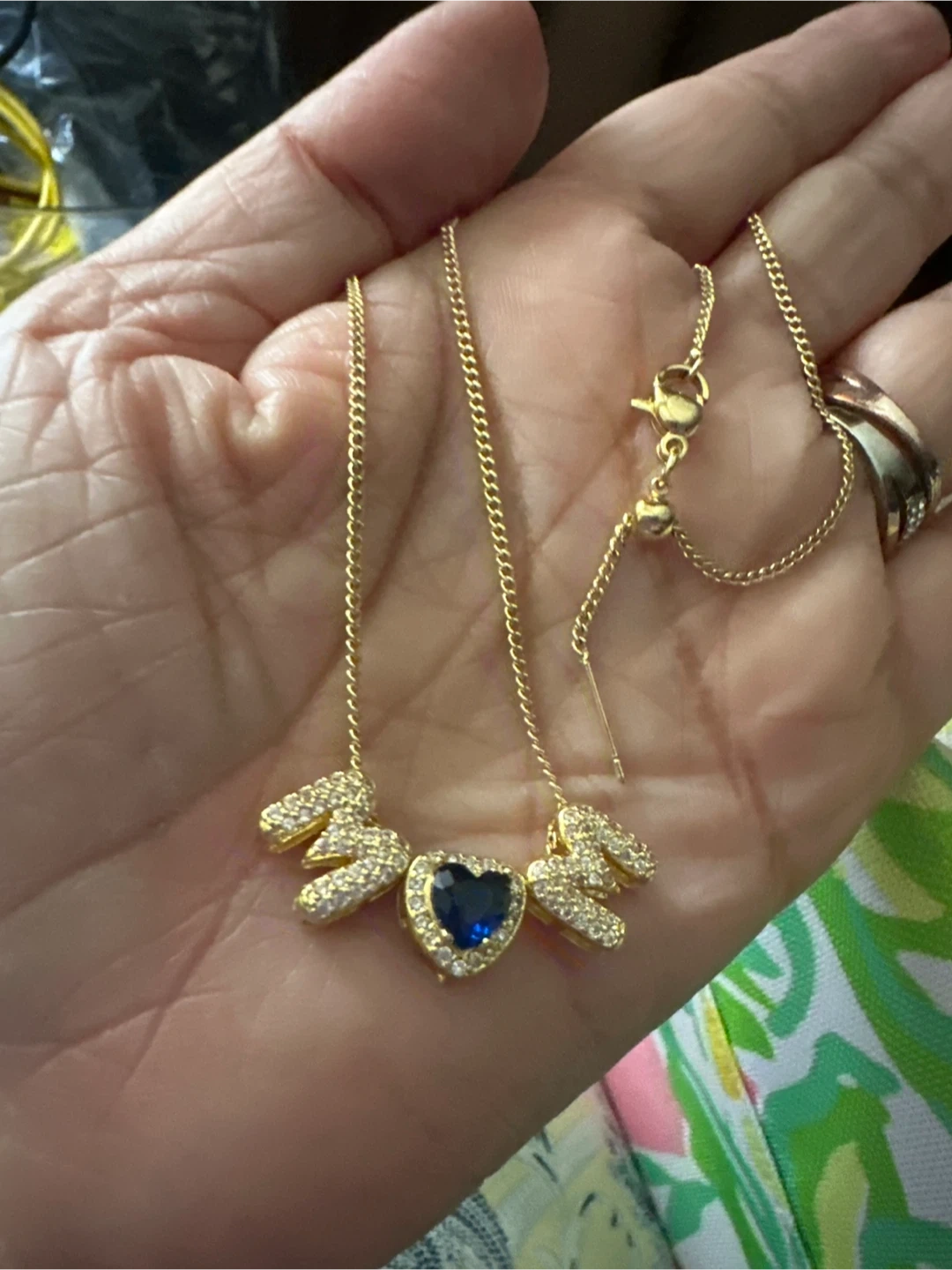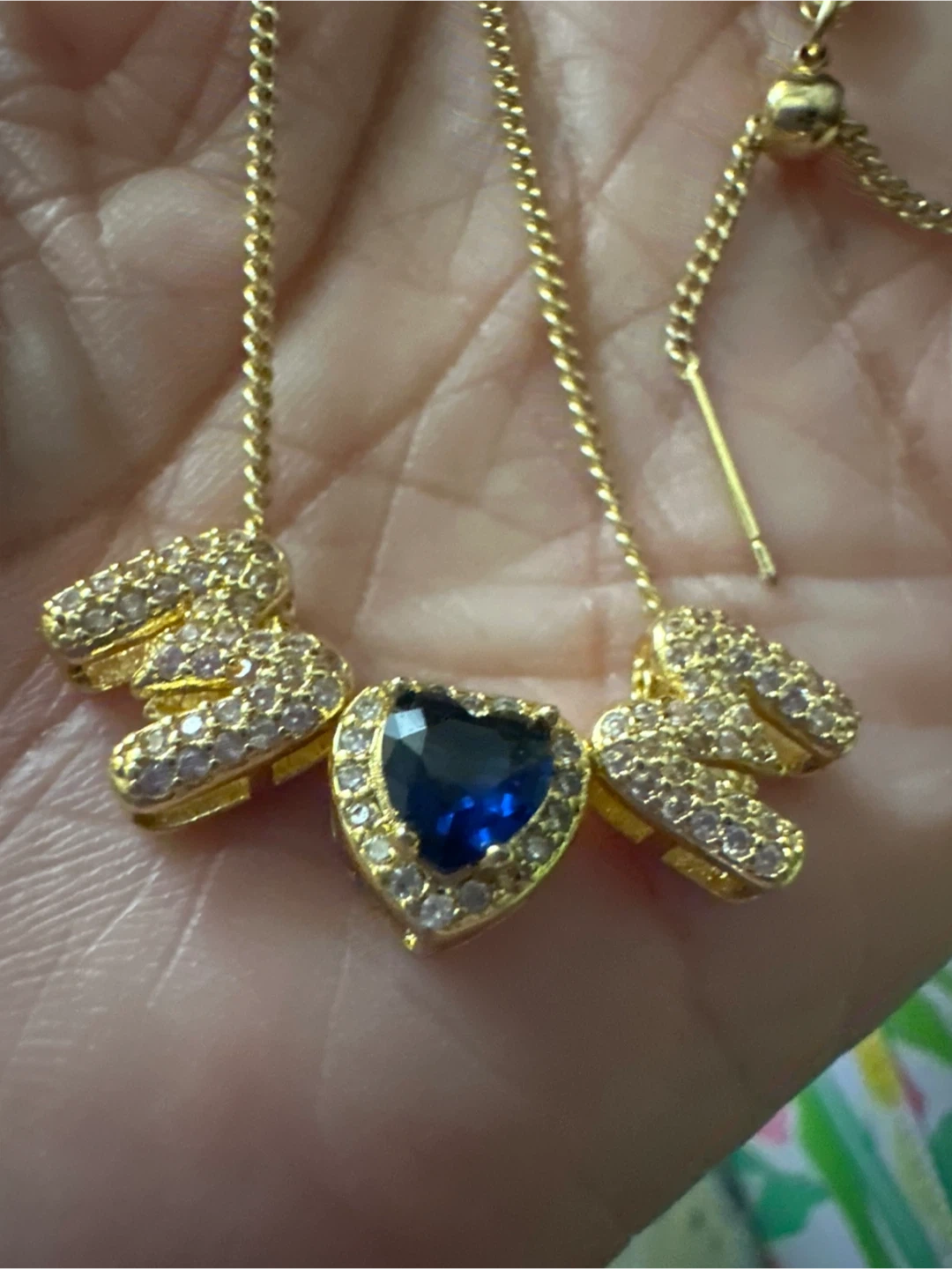 14k gold laminated necklace features a striking blue heart-shaped pendant surrounded by small clear crystals. It has a delicate chain with an adjustable clasp for a perfect fit. It's a beautiful accessory for adding a pop of color to any outfit!