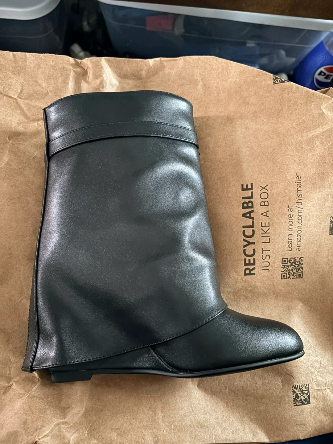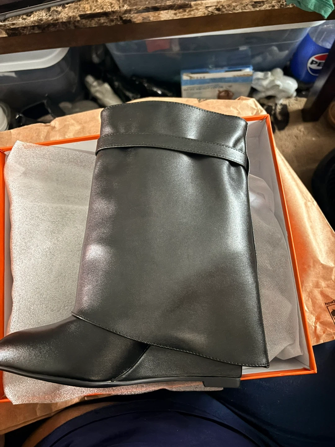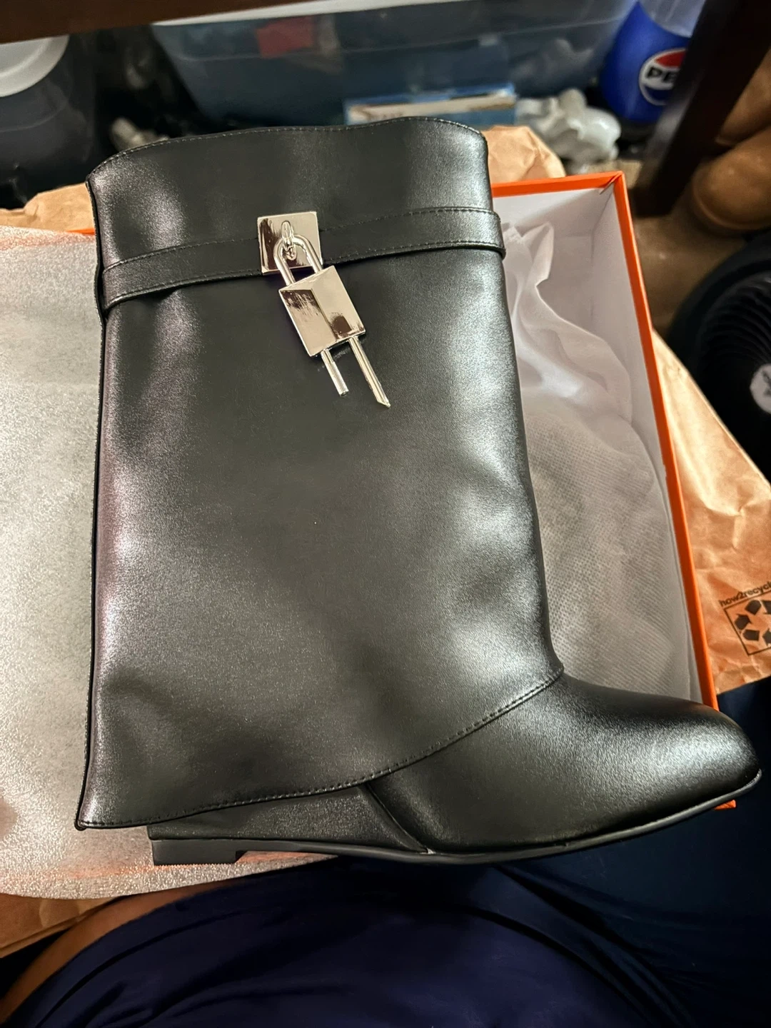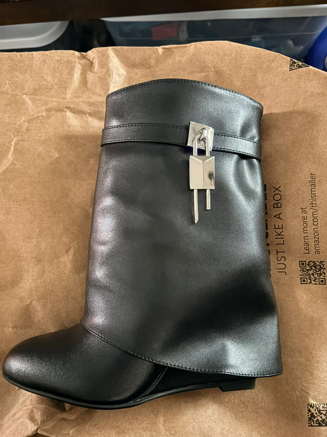Black wedge boots in a slip-on style. Features a decorative lock accent at the ankle strap. Wedge heel and black sole. Includes original box.