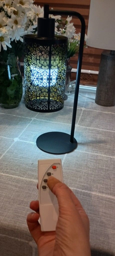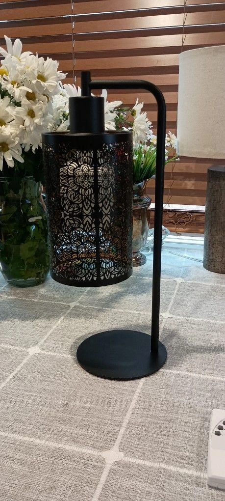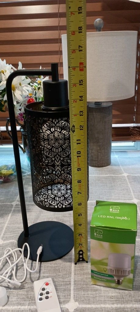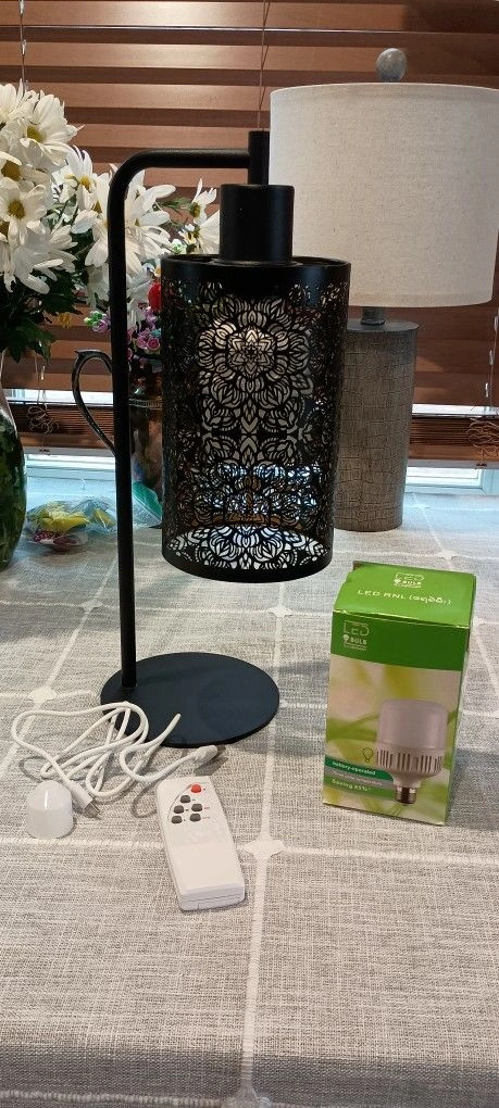 Cute little lamp. Perfect for small spaces. Does not need an electrical outlet, so you can put it literally anywhere. It comes with the remote control and rechargeable LED light bulb. Features: Dimmable, Remote control. Color: Black. Style: Modern. Type: Desk lamp.
