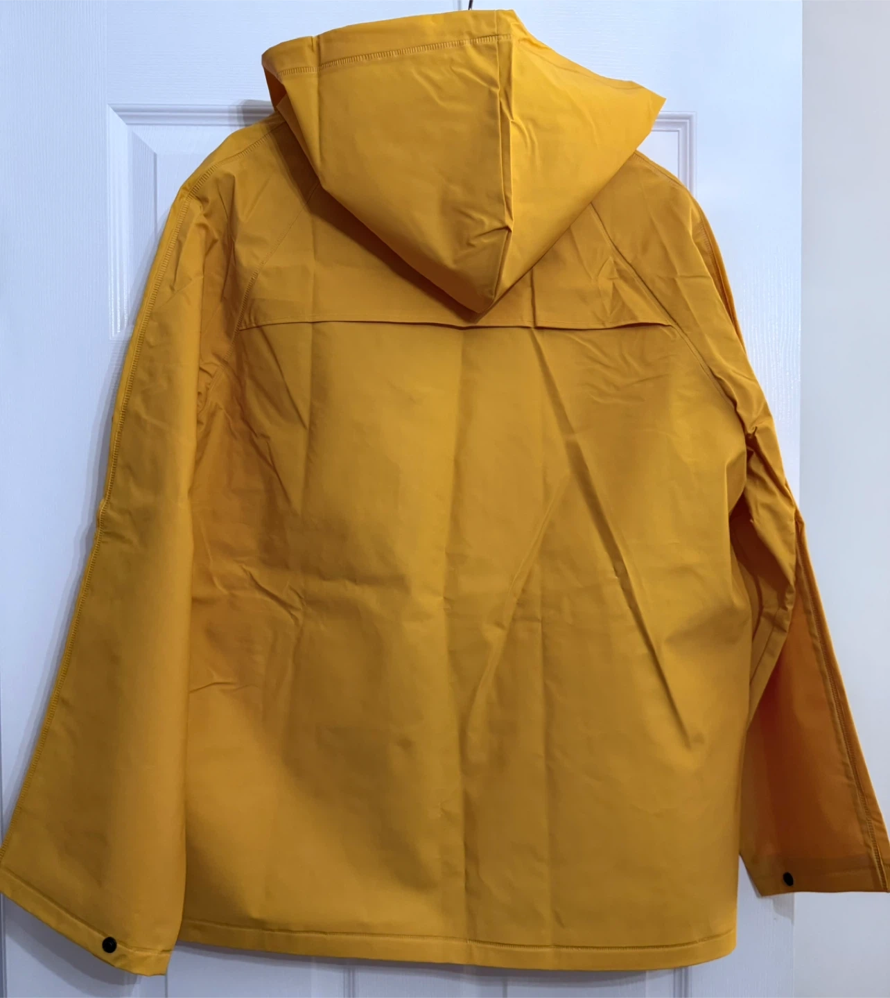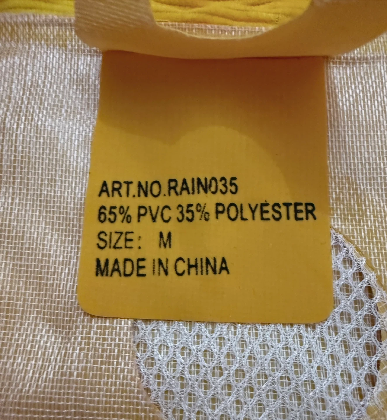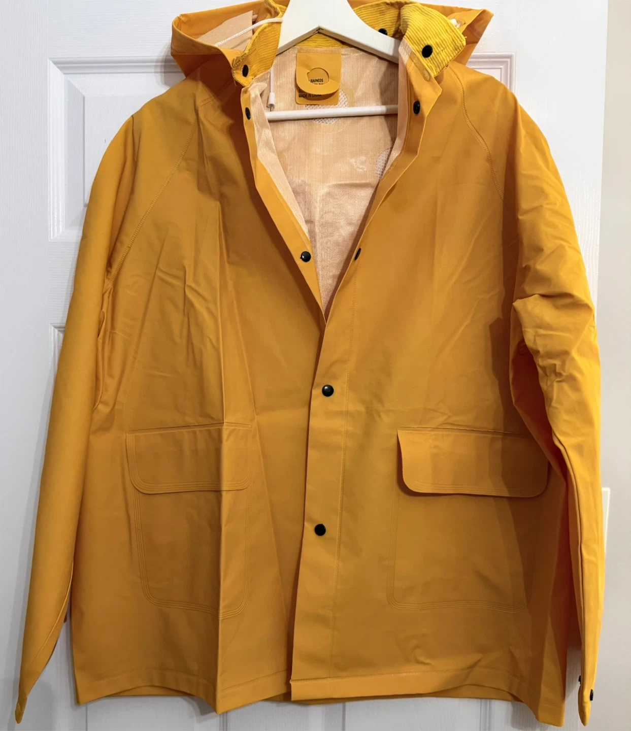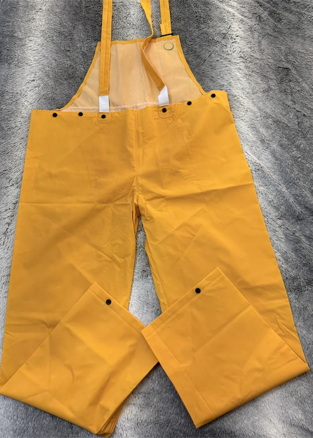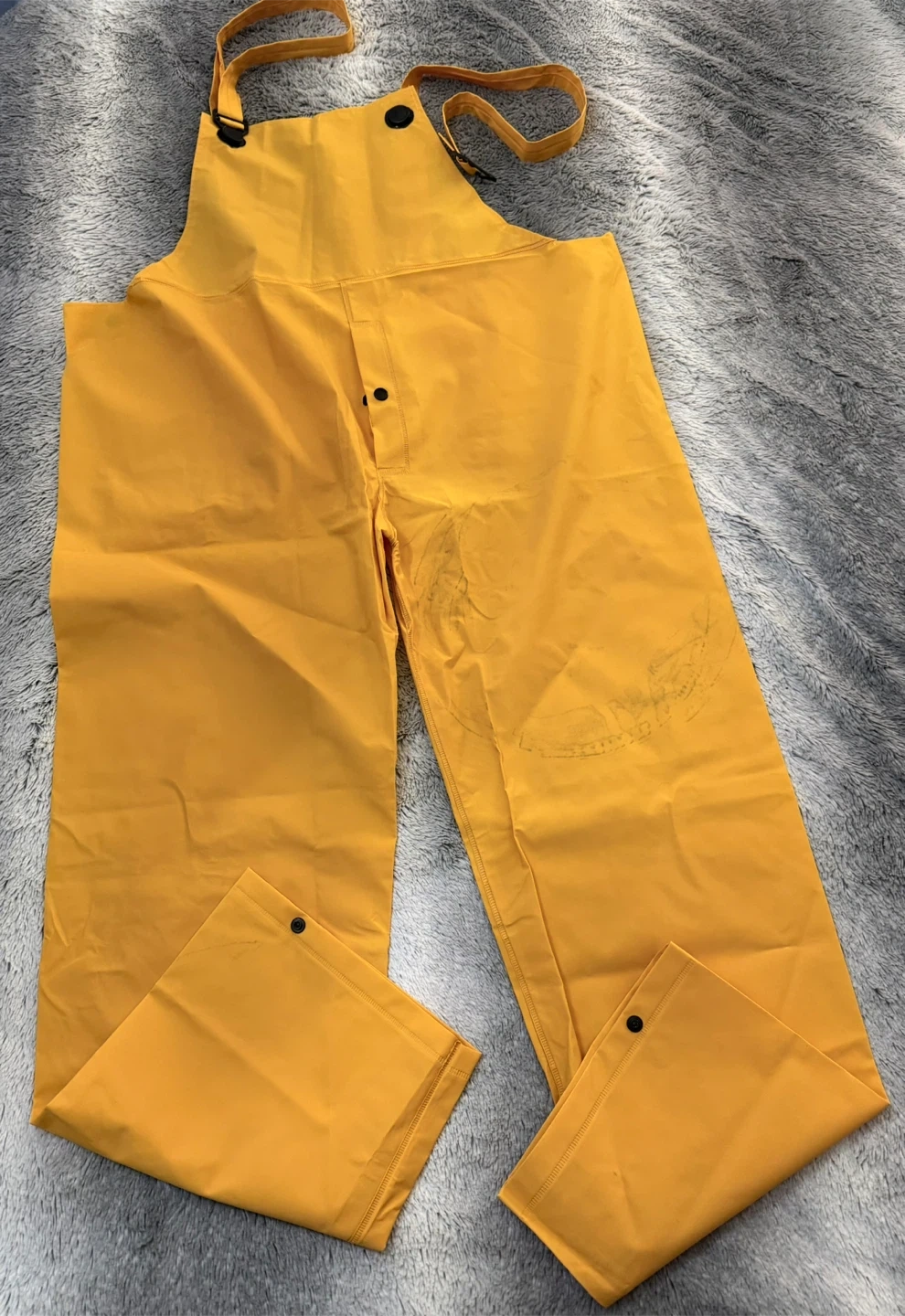 Waterproof yellow rain jacket and bib pants set. Made with 65% PVC and 35% polyester. Size medium. Hooded jacket with two front pockets and snap closures. Bib pants with adjustable straps and snap closures at the ankles.
