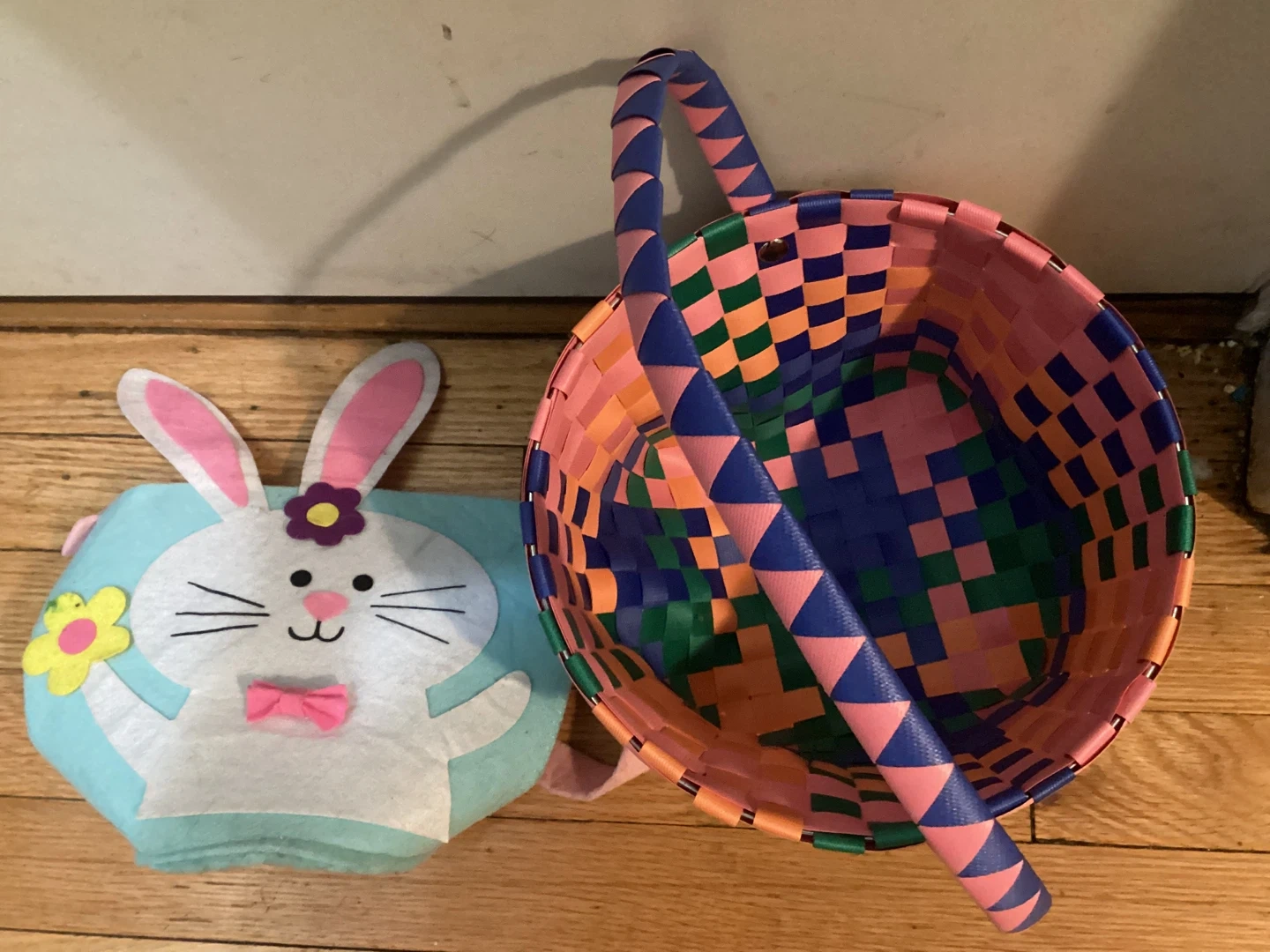 This set includes a cute fabric Easter bag shaped like a bunny and a colorful woven basket with a handle. Both are perfect for collecting Easter eggs or carrying treats. The basket's woven design features pink, blue, green, and orange.