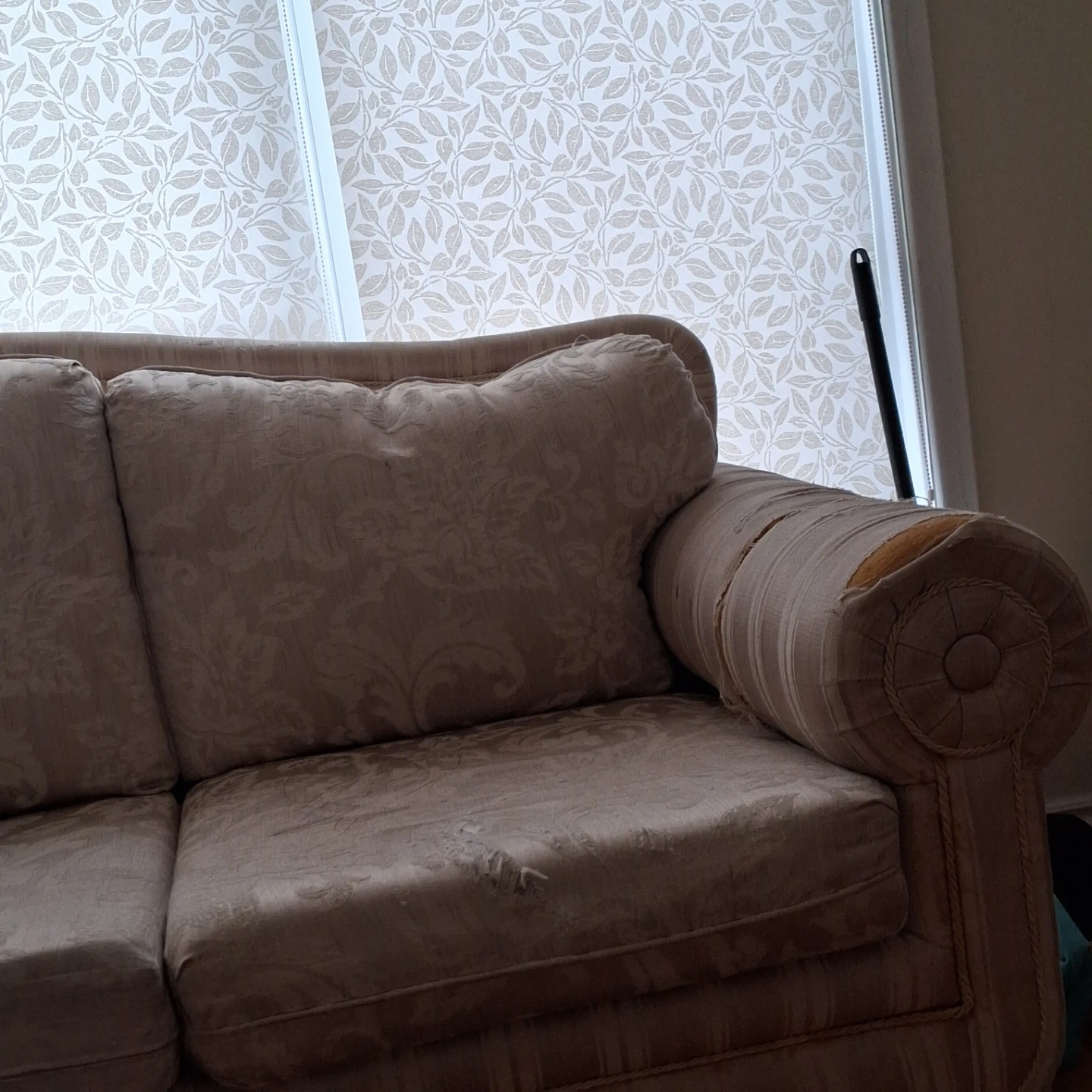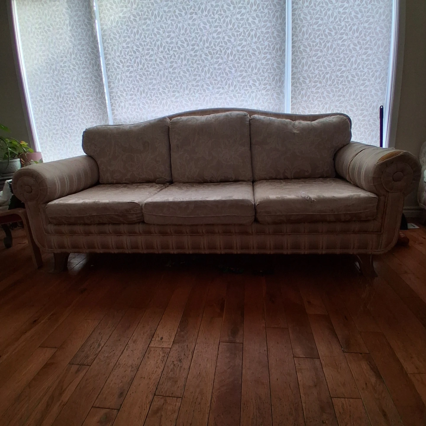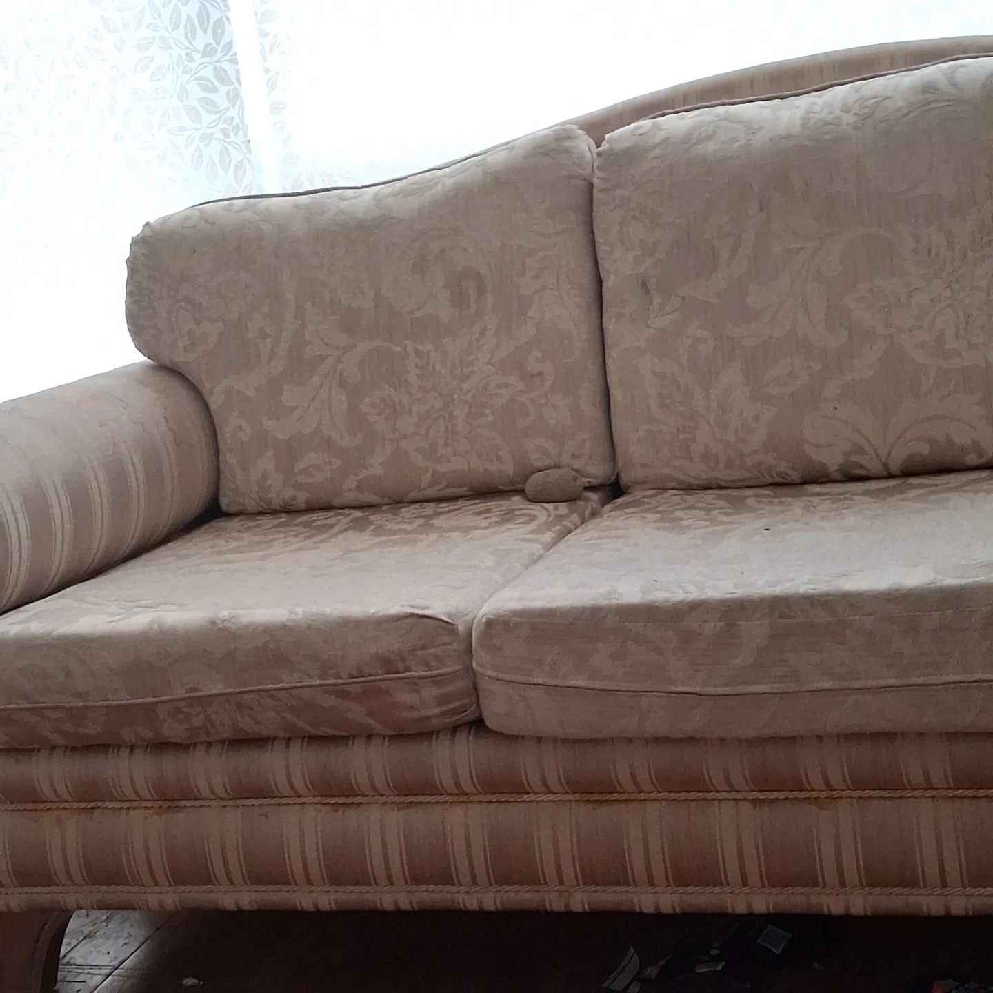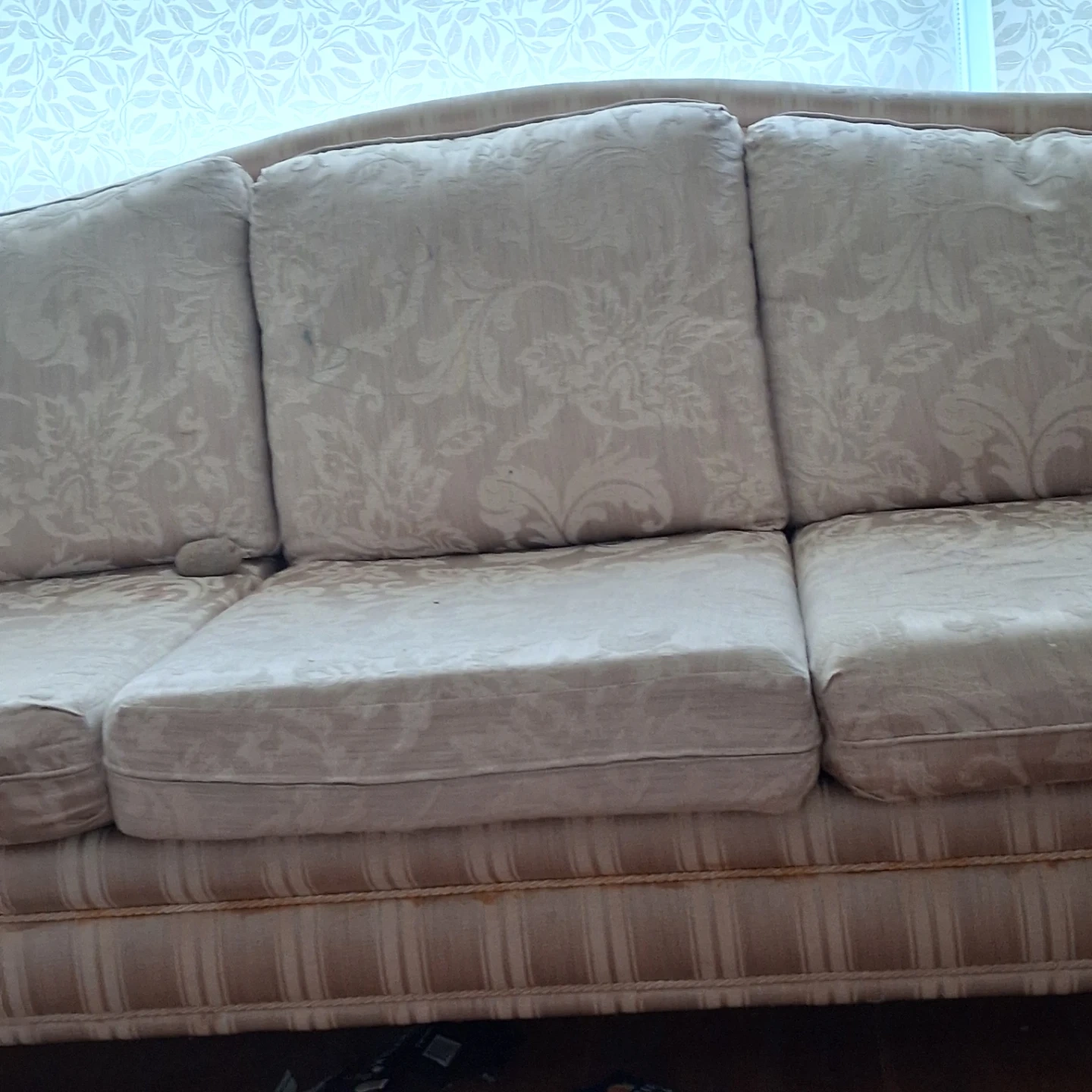 Classic 3-seater sofa featuring a light-coloured floral damask fabric. It has three seat cushions and a gently curved back. Some wear and tear evident on the arms and seat cushions.