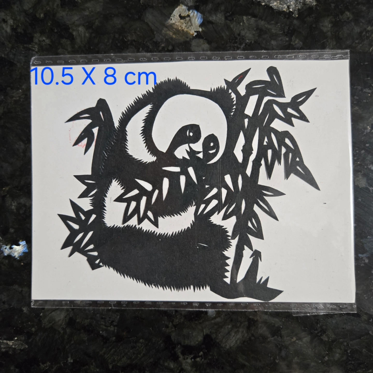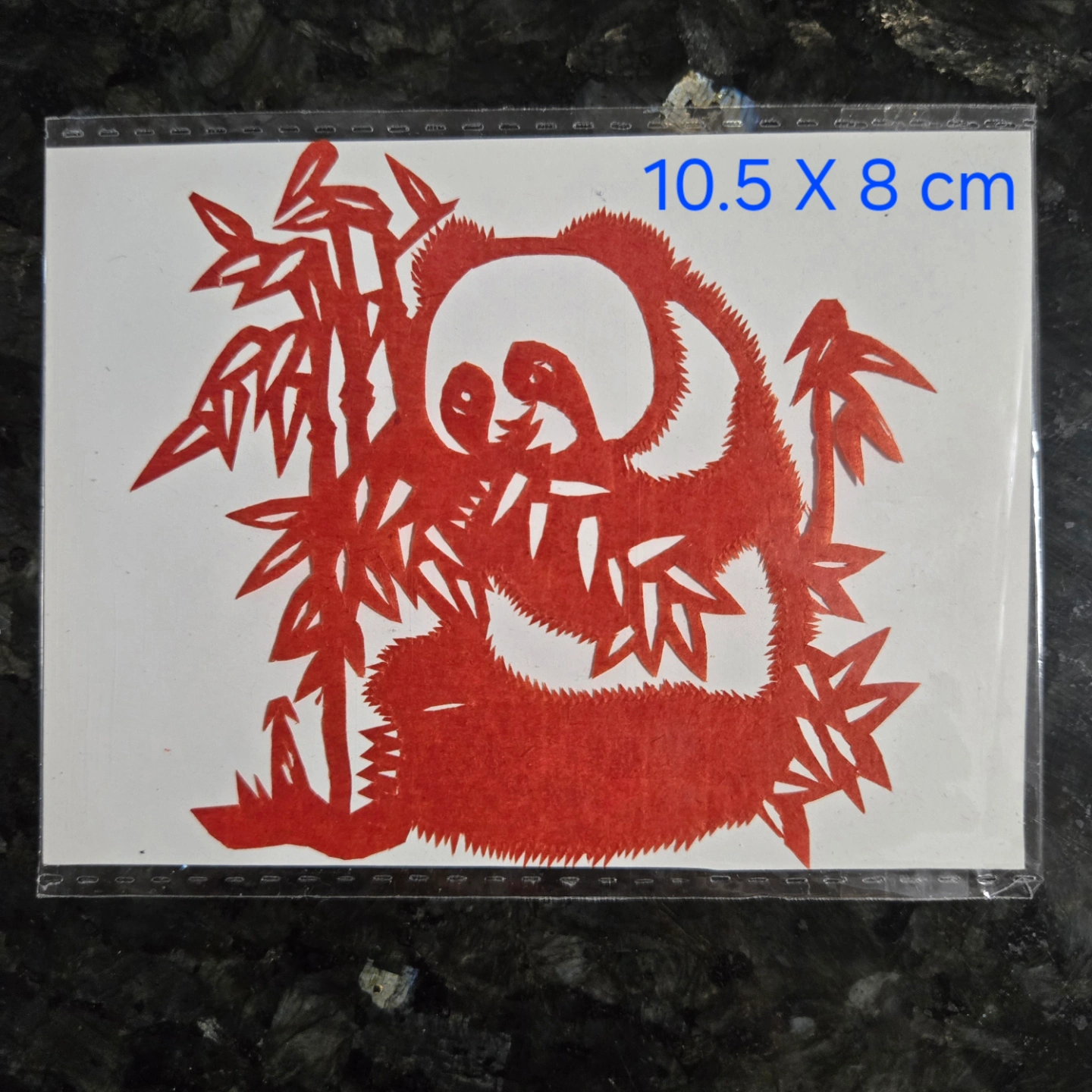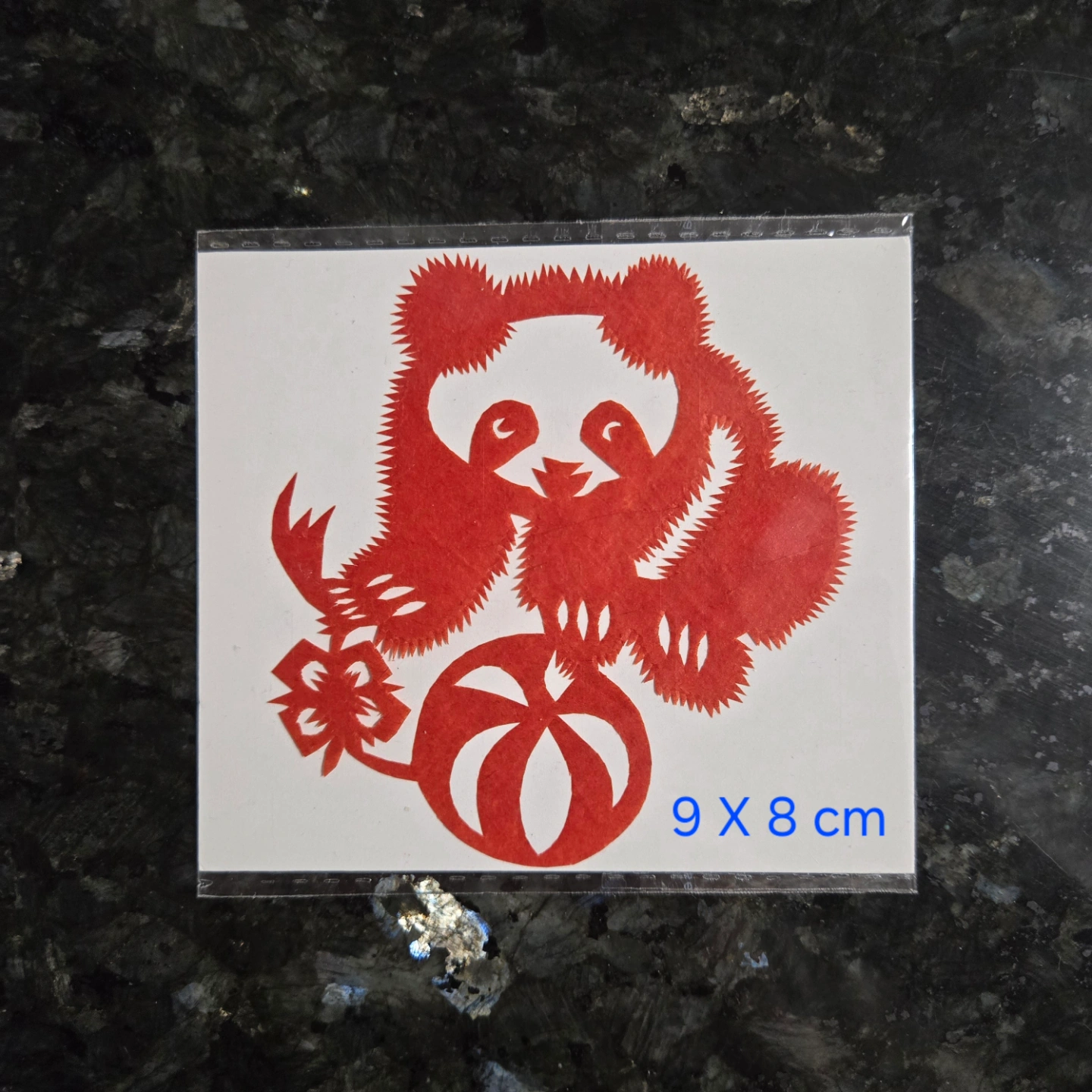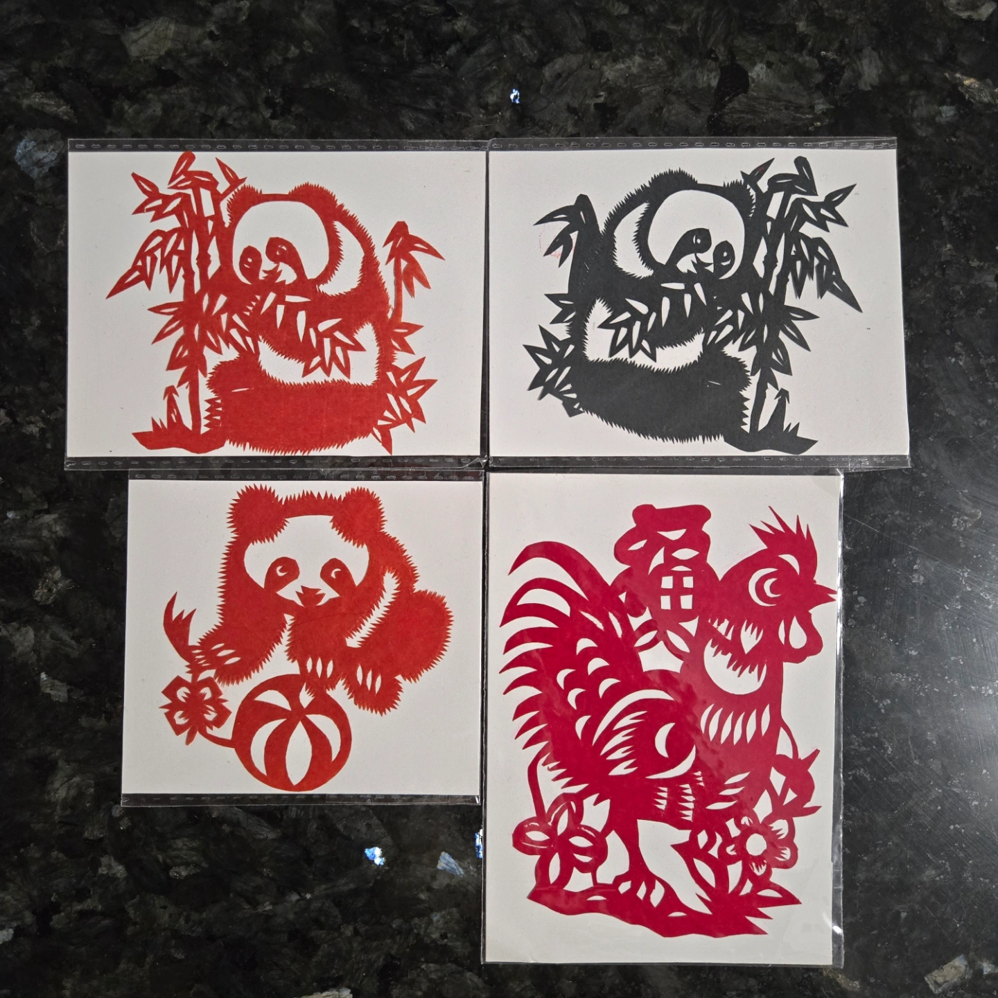 Four unique paper-cut designs. Two pandas, one with bamboo, one with a ball. A rooster and another panda. Red and black. Various sizes.