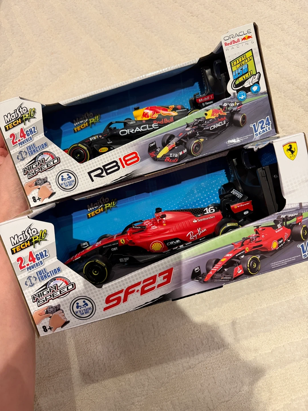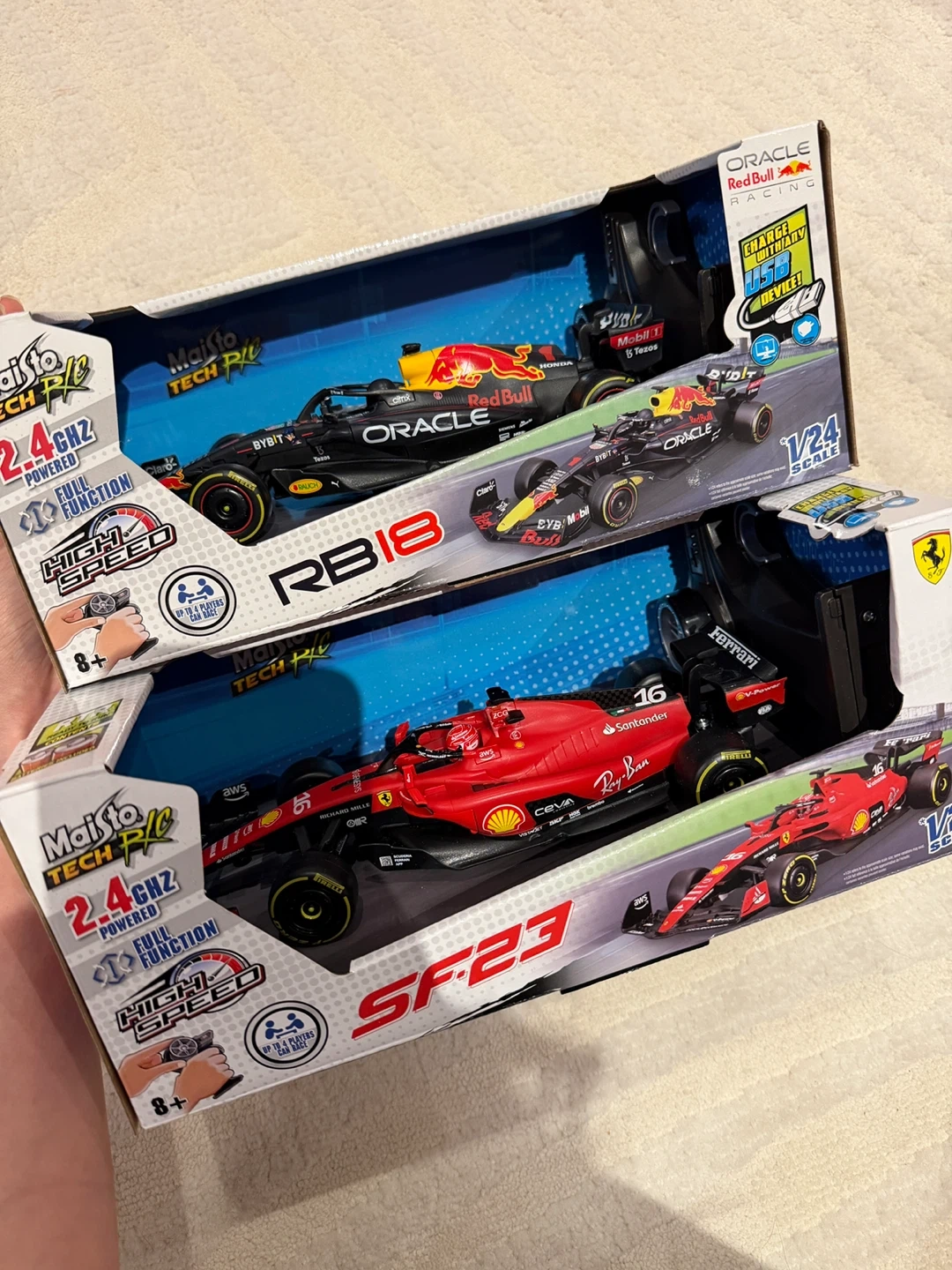 $30 each. These are two Maisto Tech R/C 1:24 scale remote control Formula 1 cars. One is the Red Bull RB18 and the other is the Ferrari SF-23. Both are 2.4GHz powered and feature full function high speed control. Suitable for ages 8 and up.