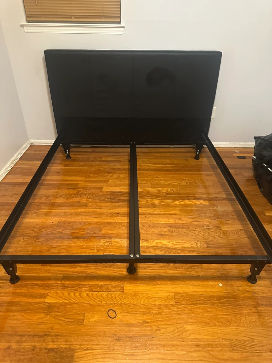 Selling a black bed frame that comes with a headboard. It's in good condition and ready for a new home. Perfect for adding a touch of modern style to your bedroom