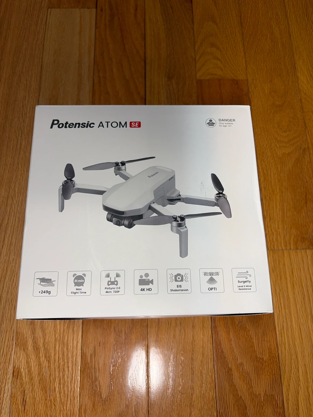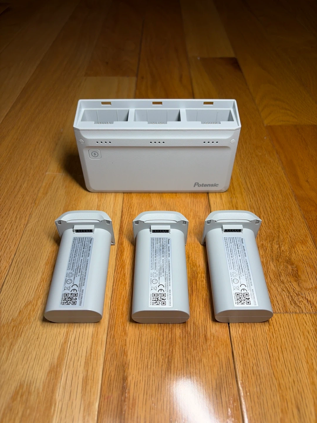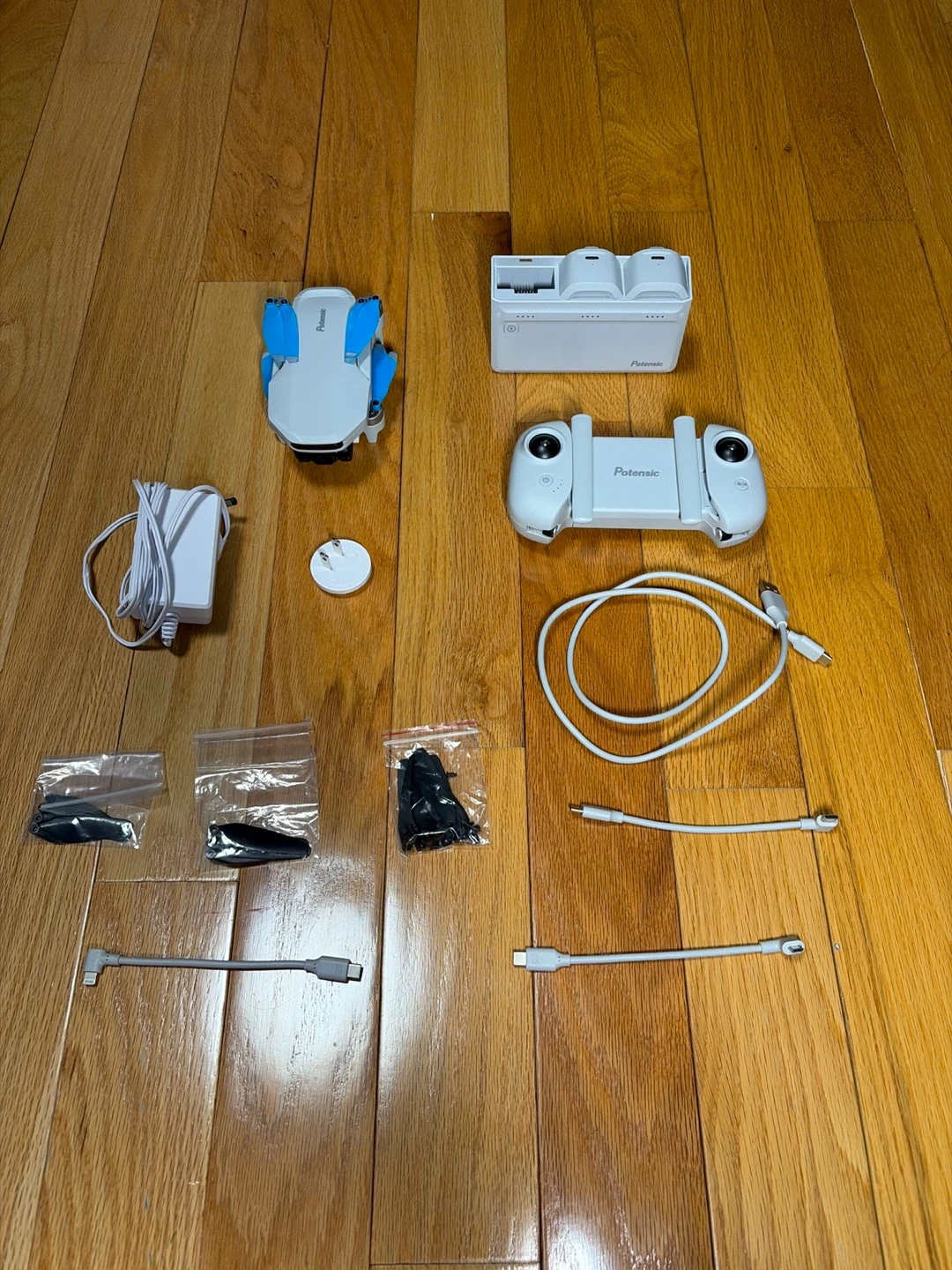 Potensic Atom Se and remote controller. It comes with a charging hub, three batteries, and charging cables. Includes a cary bag with original packaging