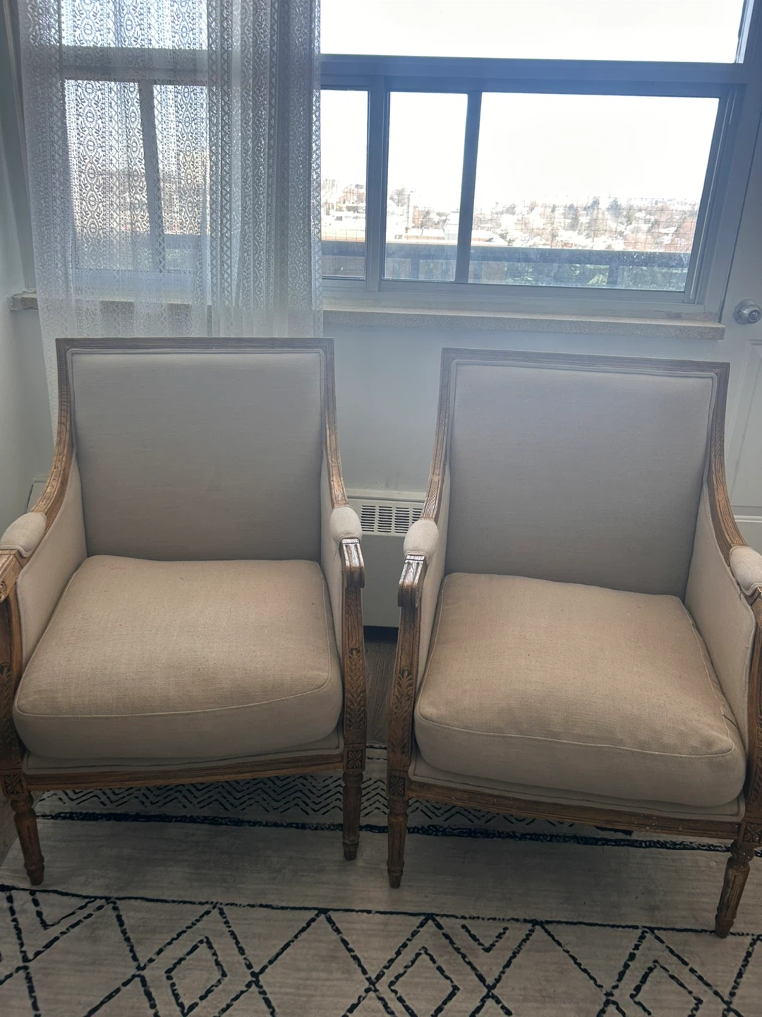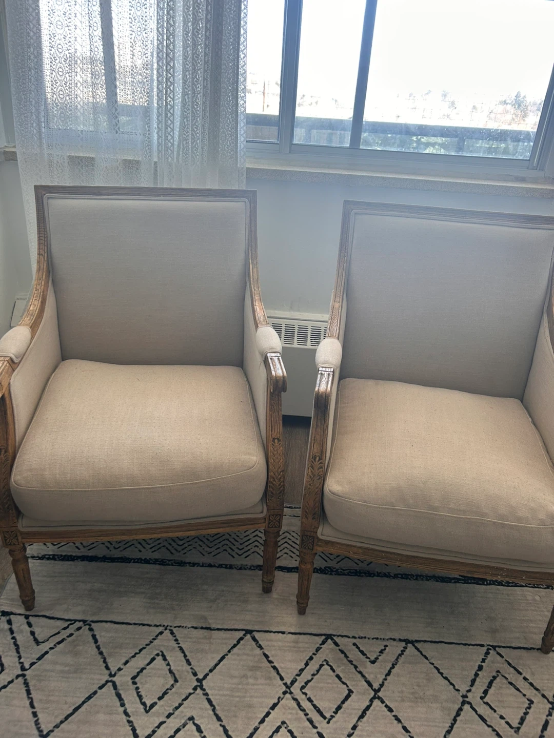 Two elegant accent chairs featuring upholstered seats and backs. The wooden frames have intricate carved details. These chairs would add a touch of classic style to any room.