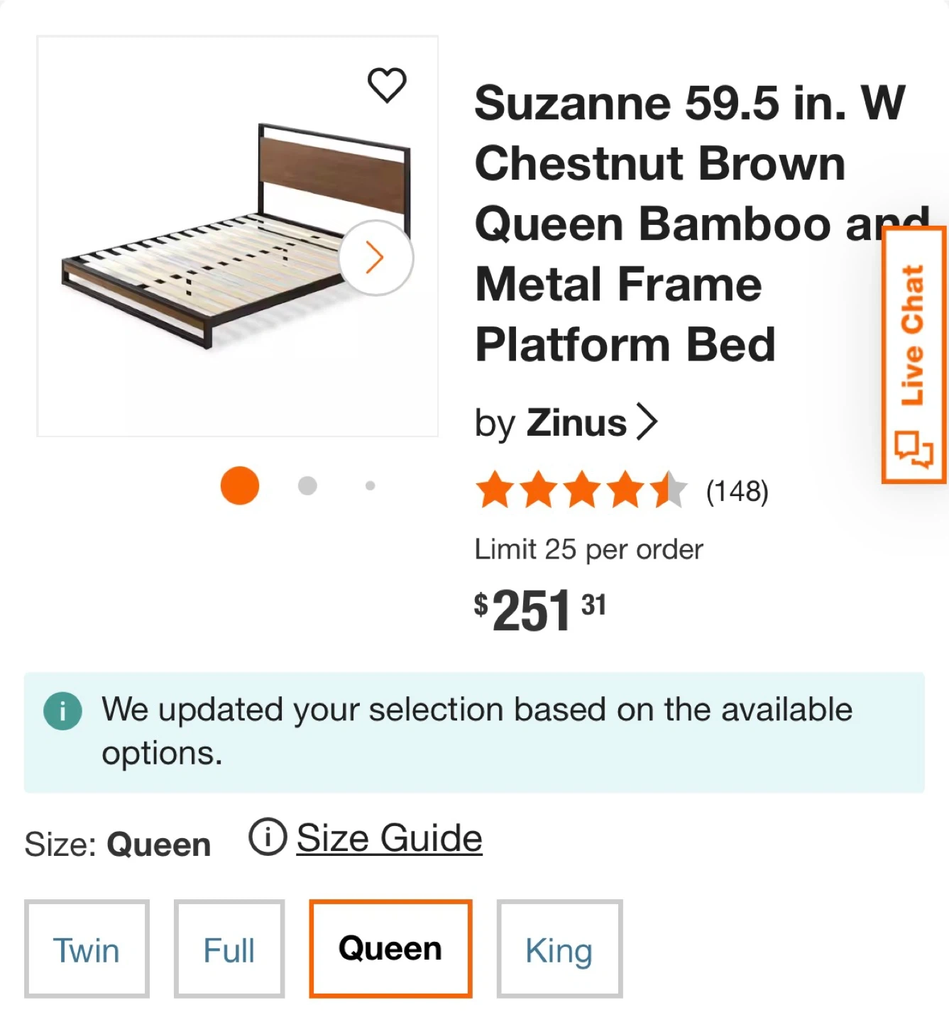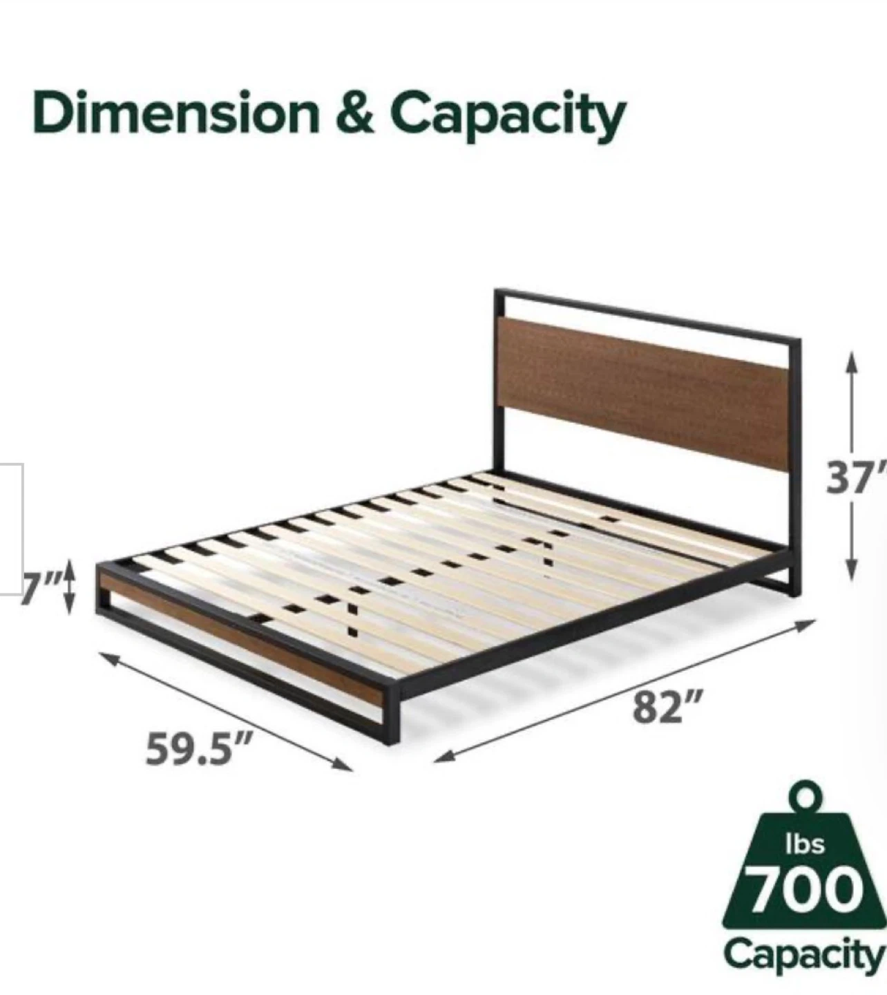 10Selling a Zinus Suzanne 59.5 inch wide Queen platform bed frame in chestnut brown! This bed frame features a bamboo and metal frame. The dimensions are 82" in length and 37" in height. It has a weight capacity of 700 lbs