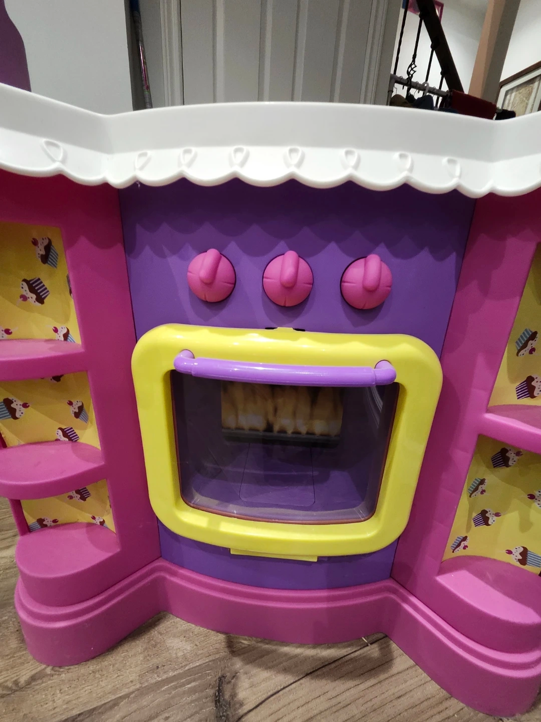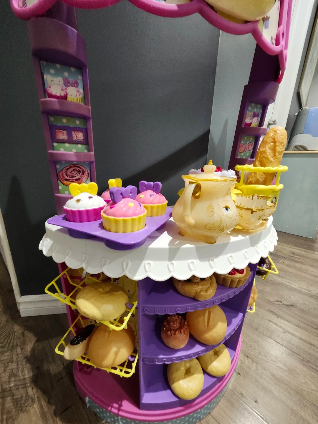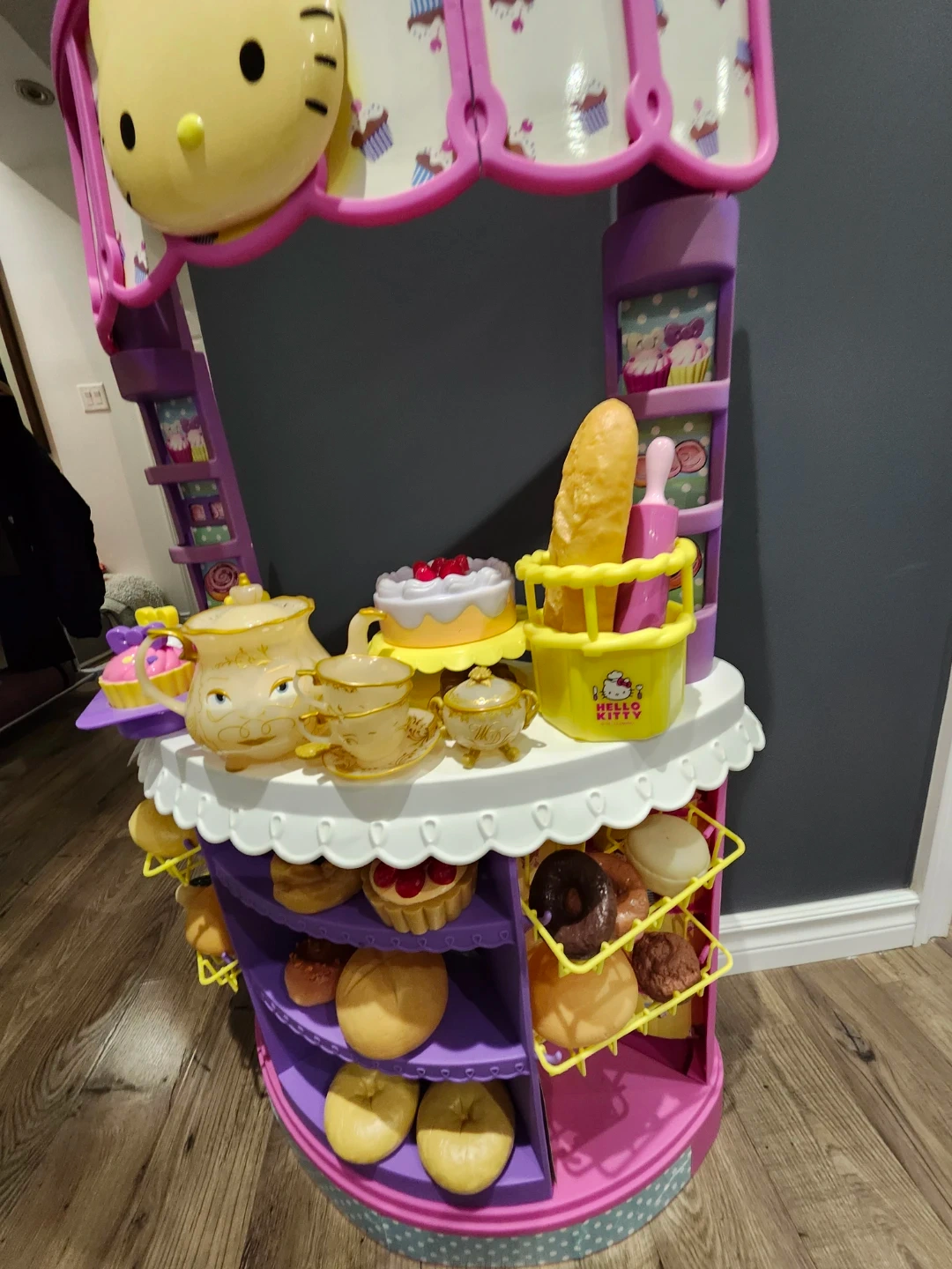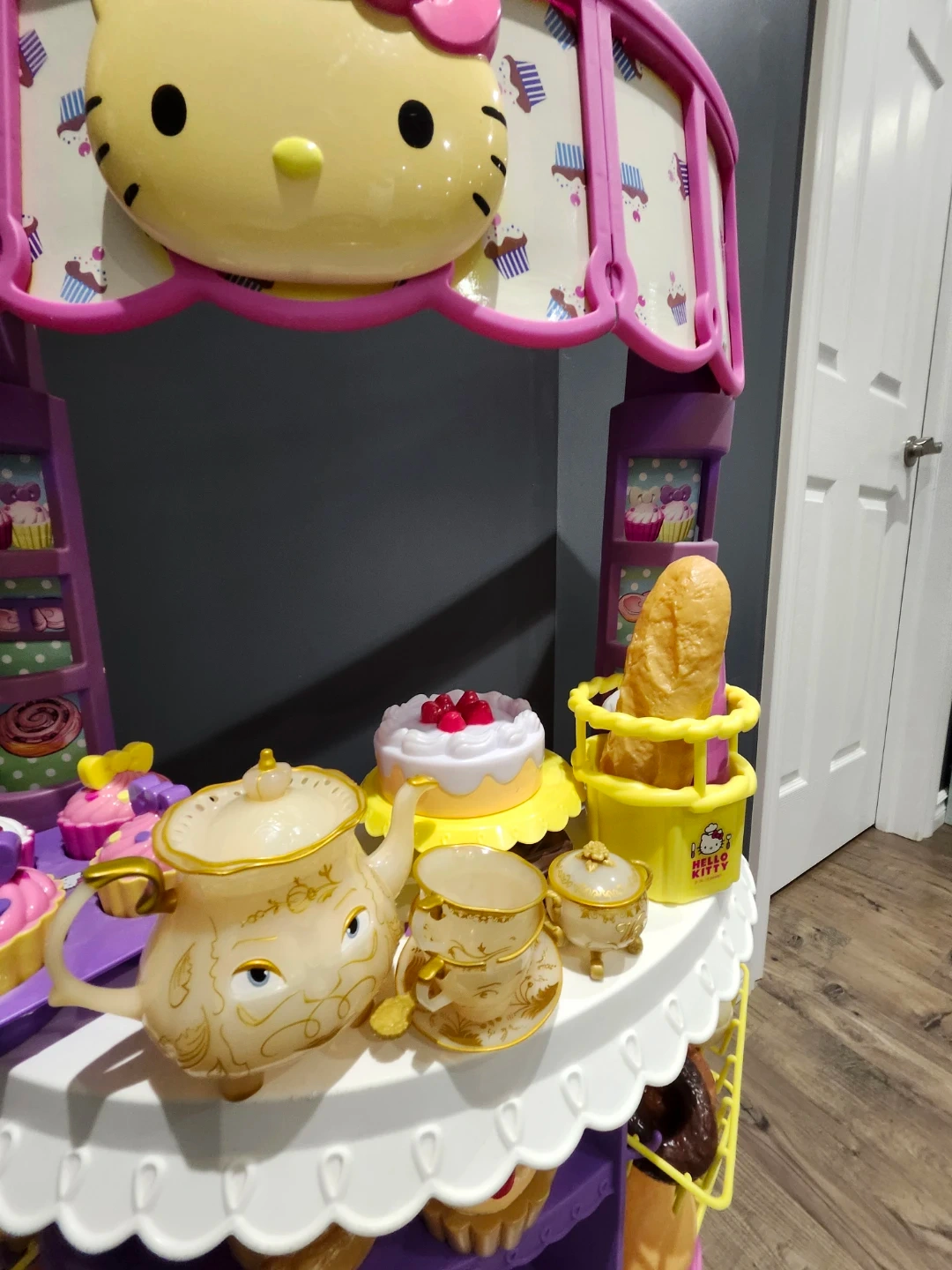 Selling a cute Hello Kitty market , bakery stand playset! It comes with all the accessories you see in the pictures, including the baked goods, Beauty and the Beast tea set, and Hello Kitty container. Perfect for little ones who love to play pretend!
