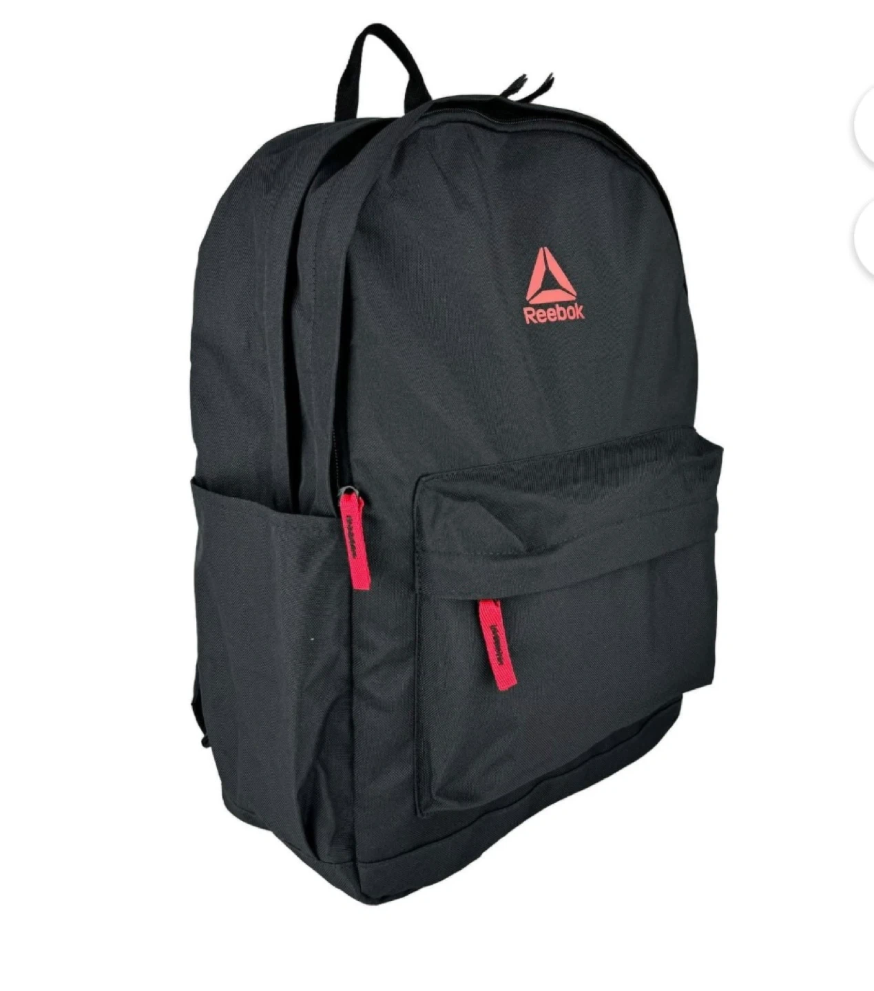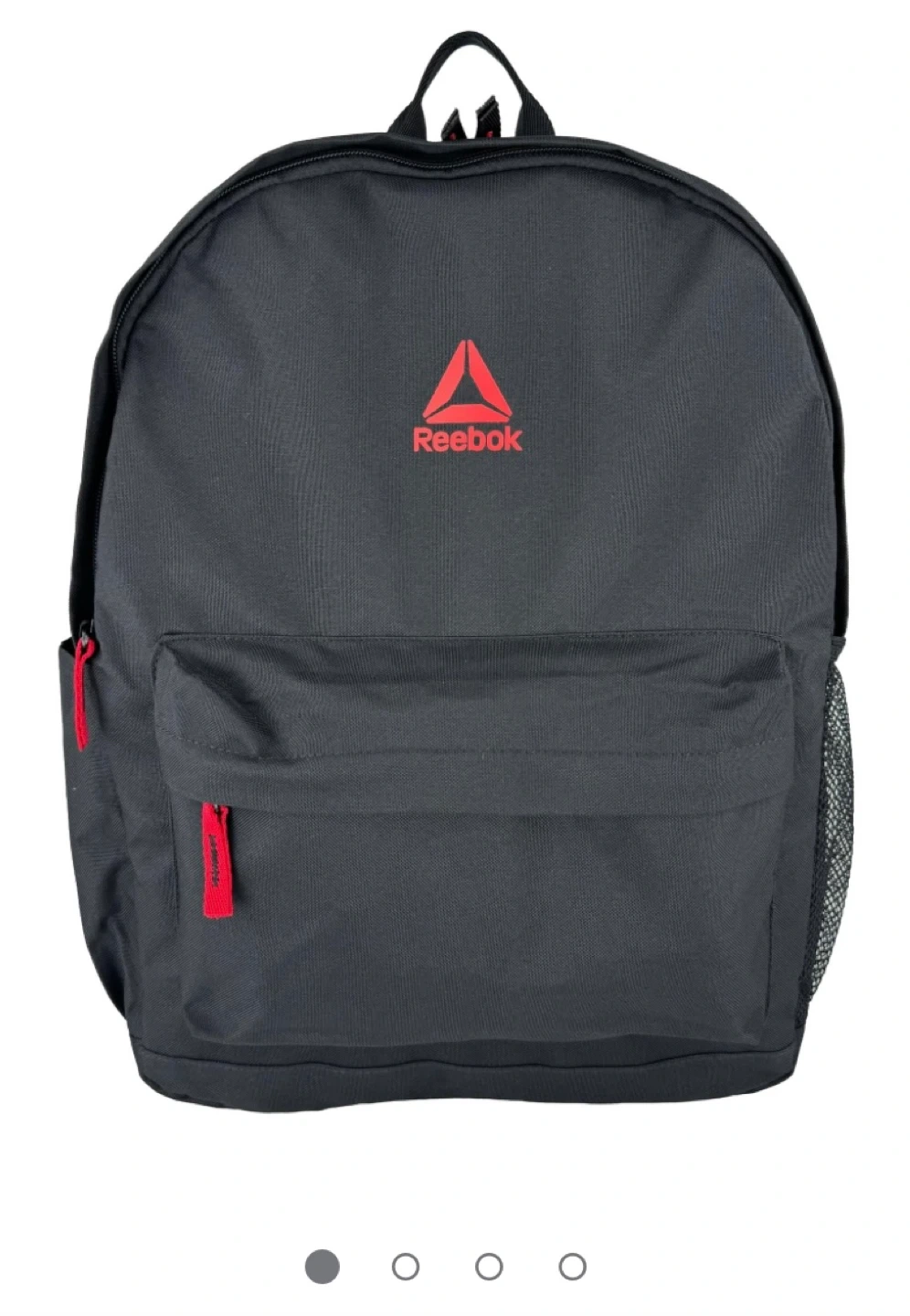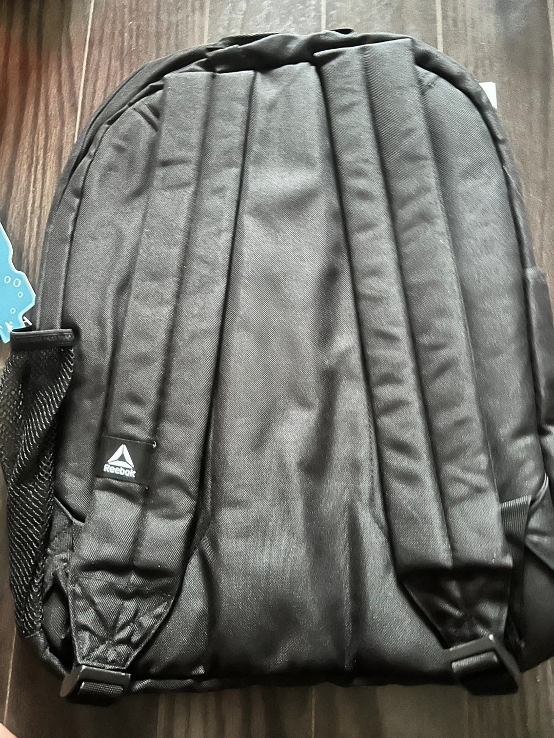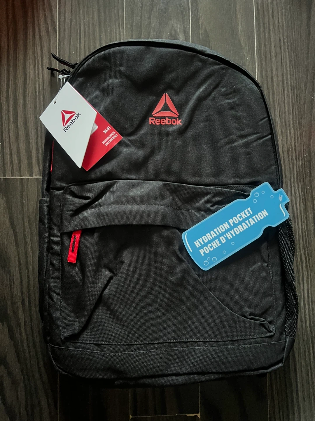 This black Reebok backpack has a front zippered pocket and a side mesh pocket. It includes a hydration pocket tag. The backpack is made of durable material.