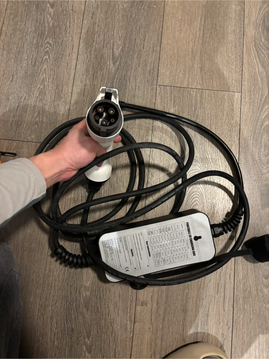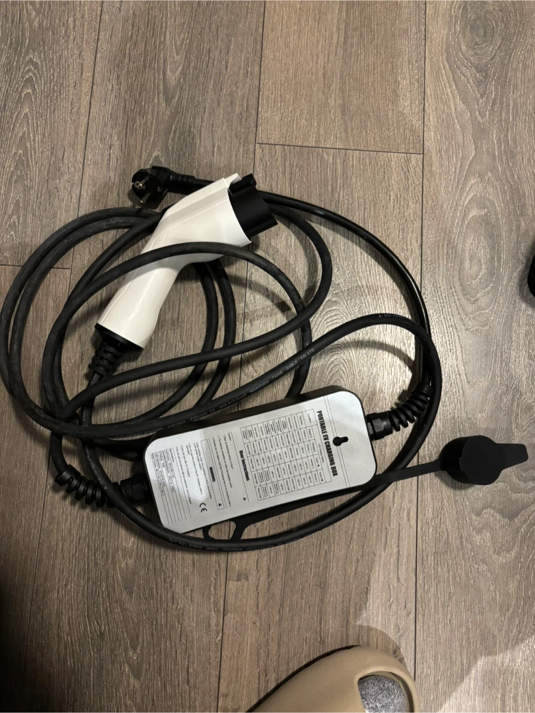 This is a portable EV charging box with a Type 1 connector. It's designed for electric vehicles. The unit has a coiled cable for easy storage. Includes a wall plug and the charging connector.