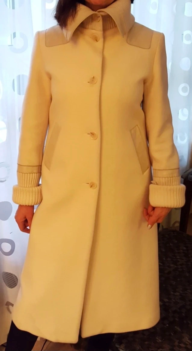 This stylish cream Mackage coat features a classic design with a wide collar and contrasting ribbed cuffs. It's made from a wool blend material. Two front pockets are included for convenience. The coat leather and knitted decor, and was wore only twice. This coat is perfect for layering during cooler weather!