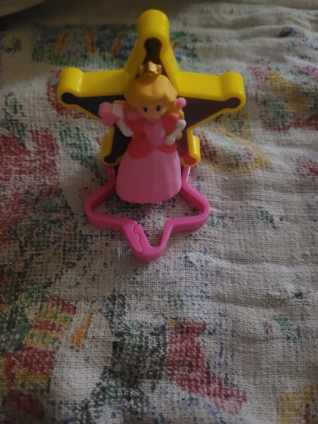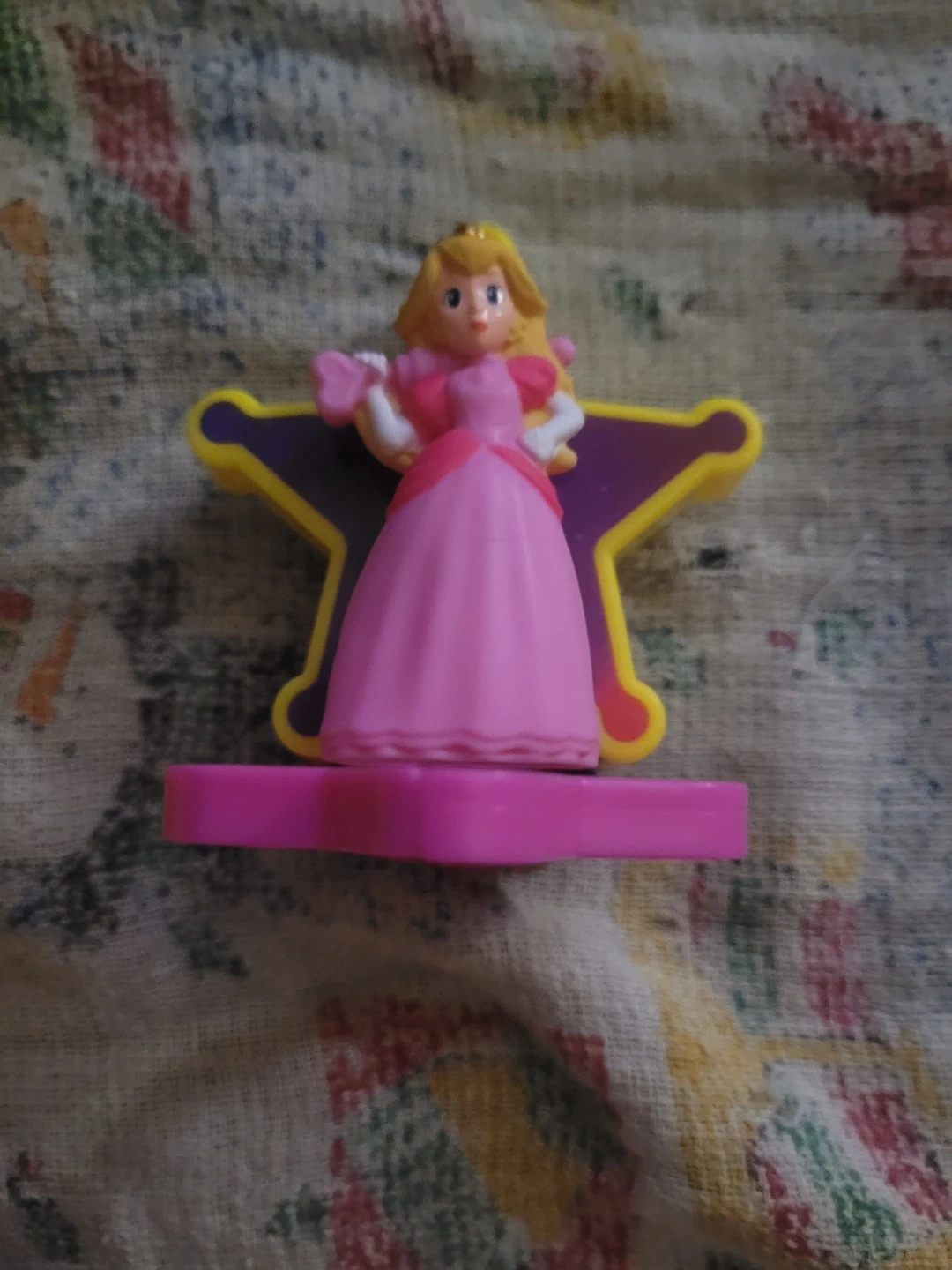 This is a Princess Peach figure from Nintendo. It's attached to a star-shaped stand. A fun collectible for fans!