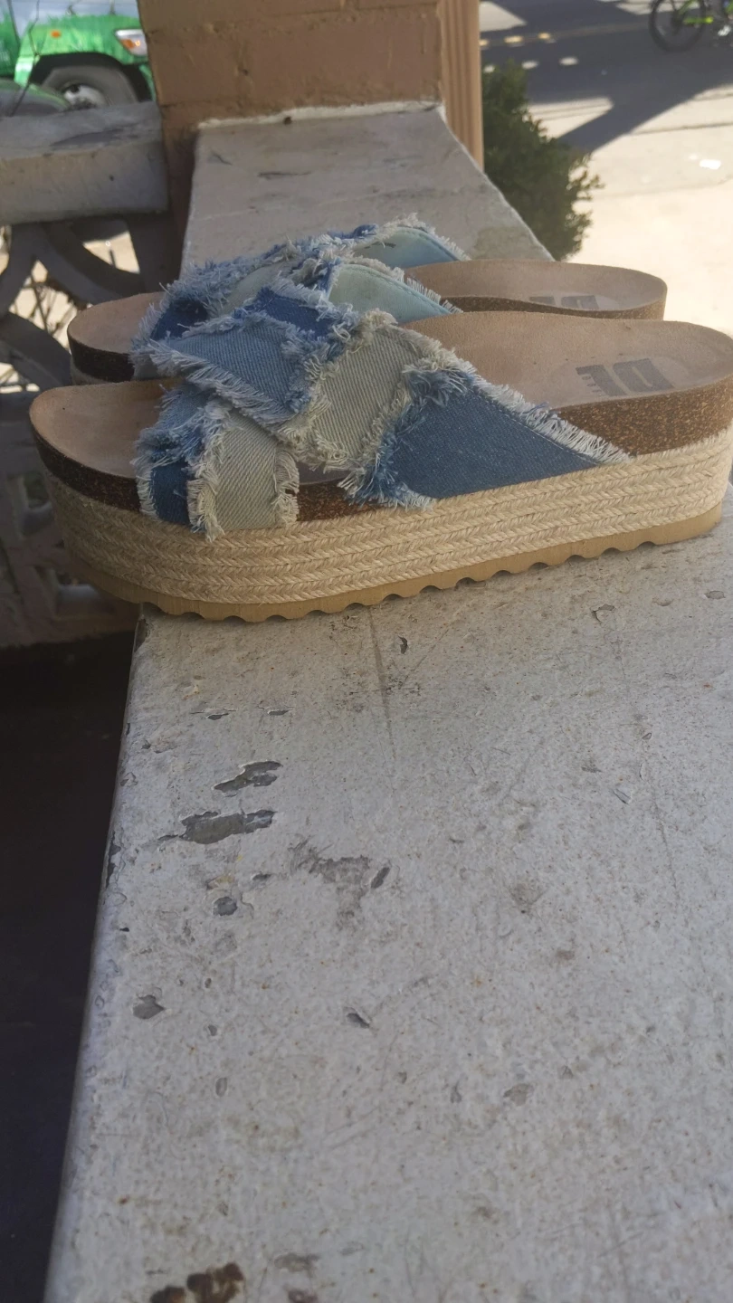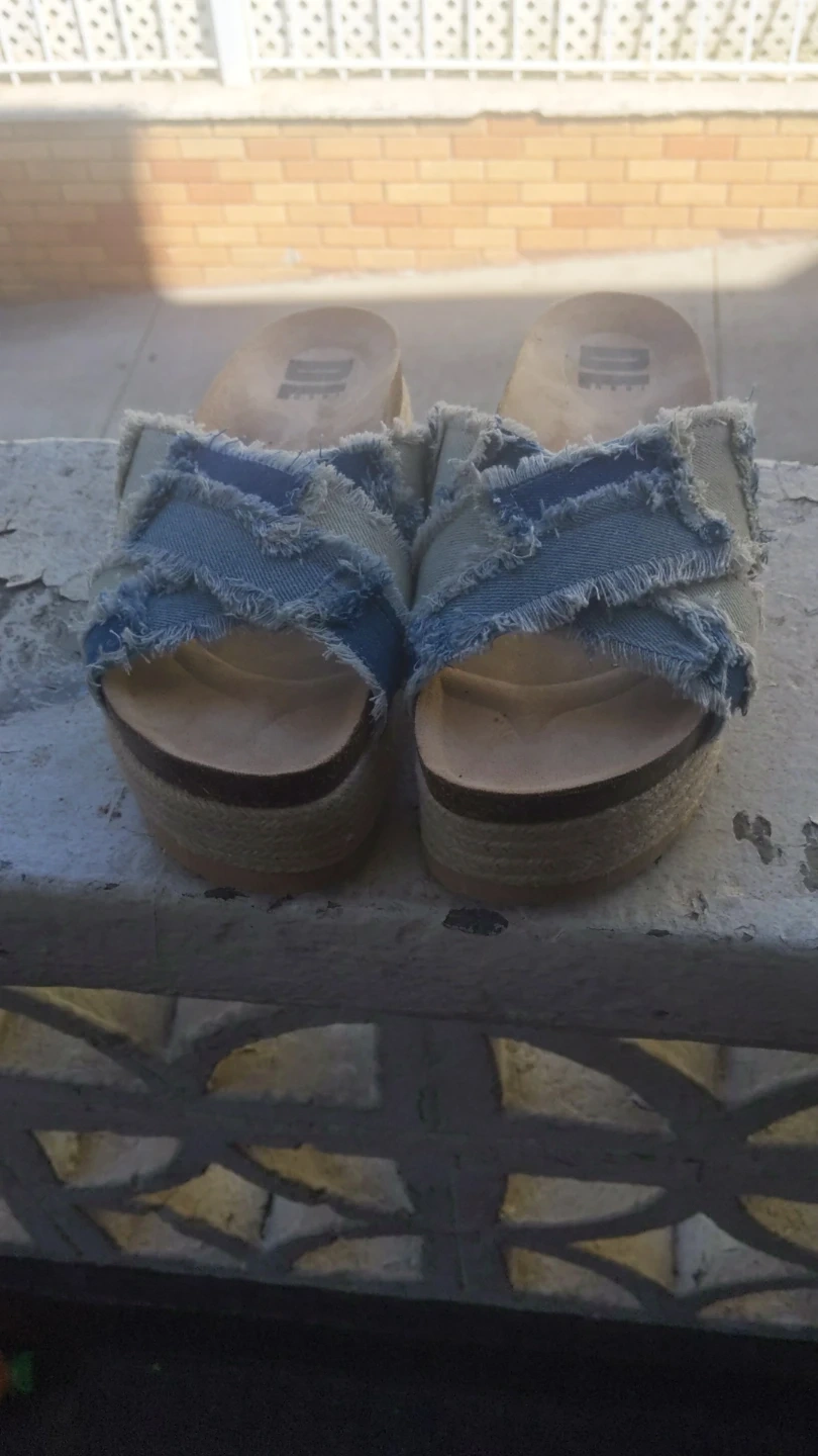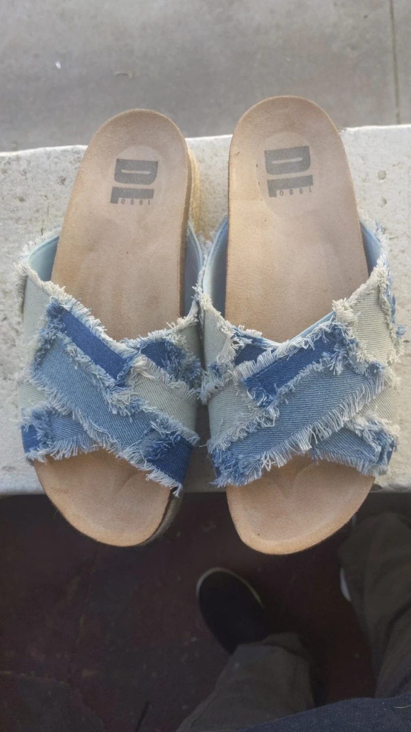 These DL Sport slide sandals feature a denim criss-cross strap design with frayed edges. They have a comfortable cork footbed and a jute-wrapped platform sole. A stylish choice for warm weather!