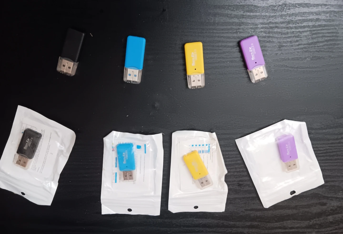 USB 2.0 Micro SD card readers in various colors. Each reader is individually packaged. Supports Micro SD and SDHC cards.