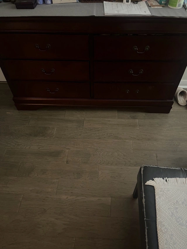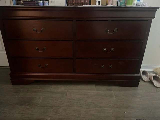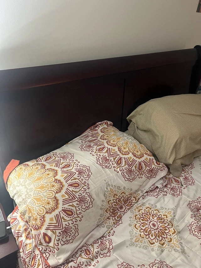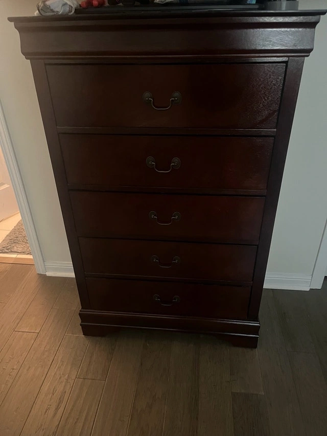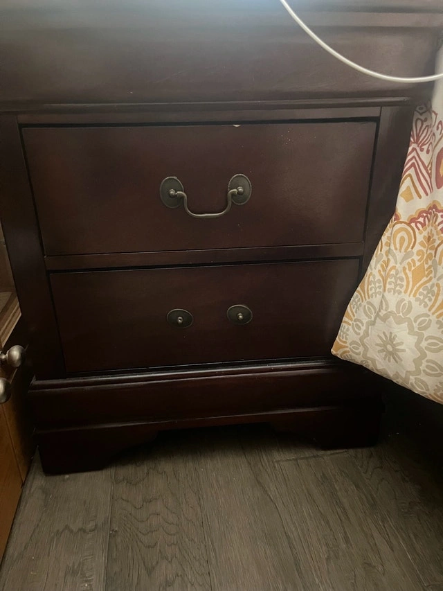 Moving sale. Oak wood bedroom set. Queen bed. Comes with a chest, dressing table, nightstand, box spring, mattress, and bed frame. Needs to be disassembled. Used for about 7 years. Pickup in Bowmanville. Cash only.