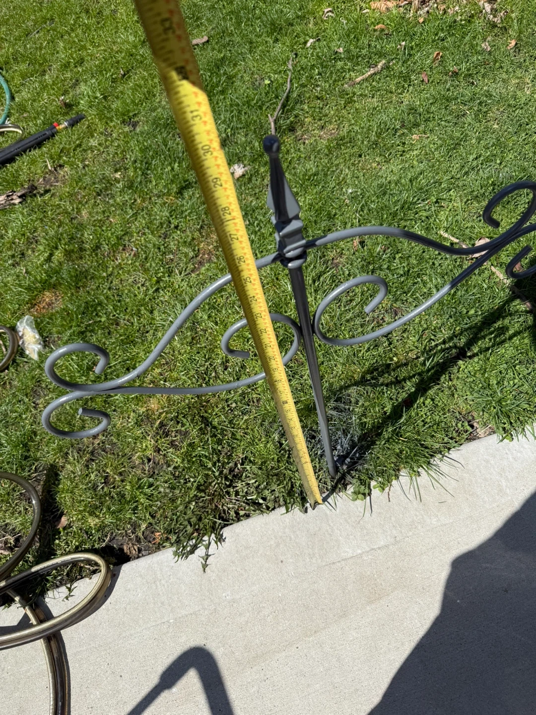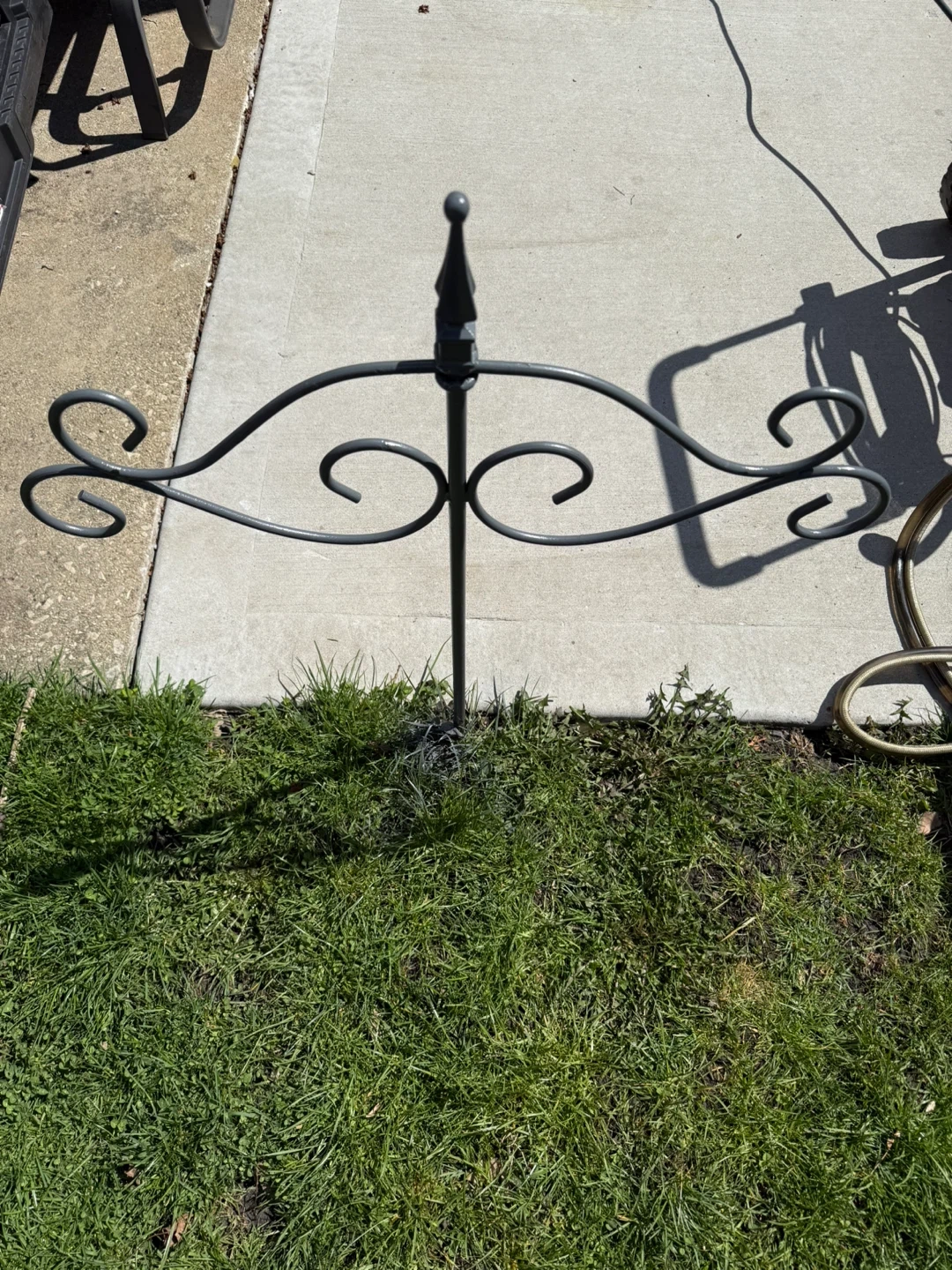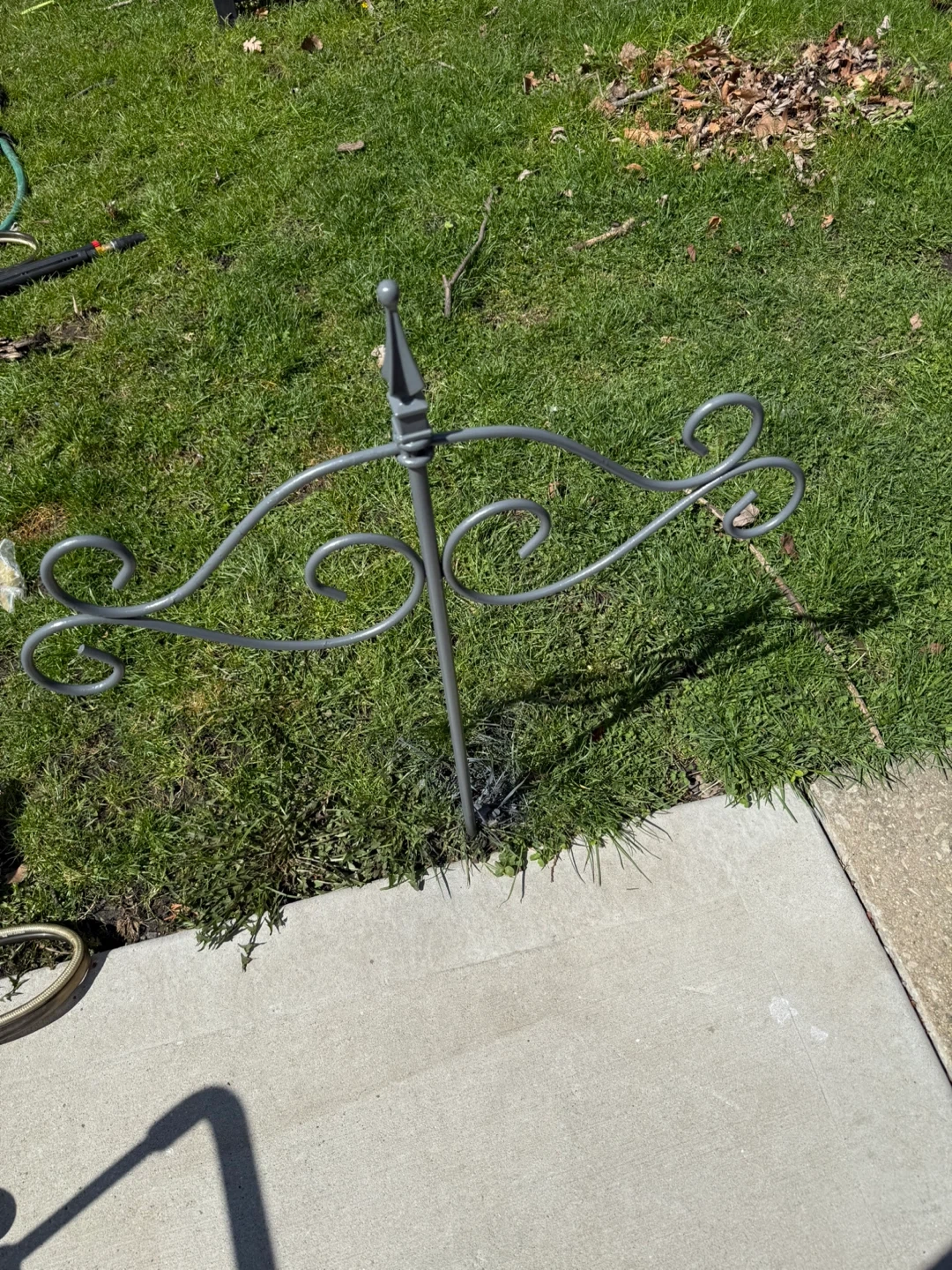 This decorative metal plant stand holder is made of sturdy metal with a gray finish. It features ornate scrollwork for a stylish look. The stake design allows for easy placement in your garden or yard.