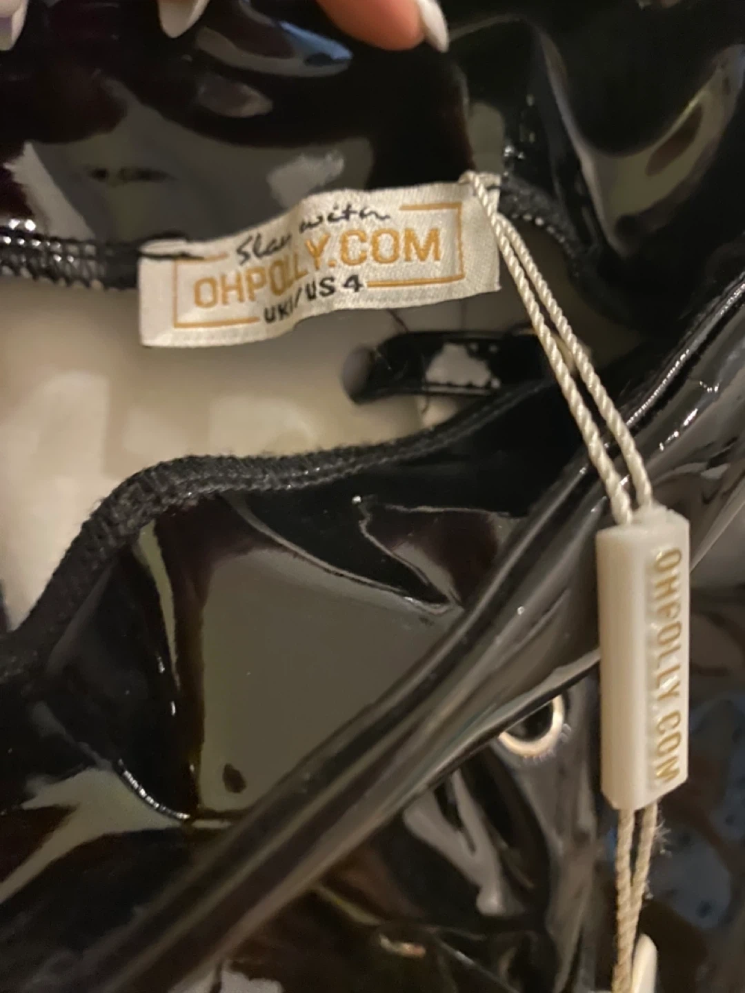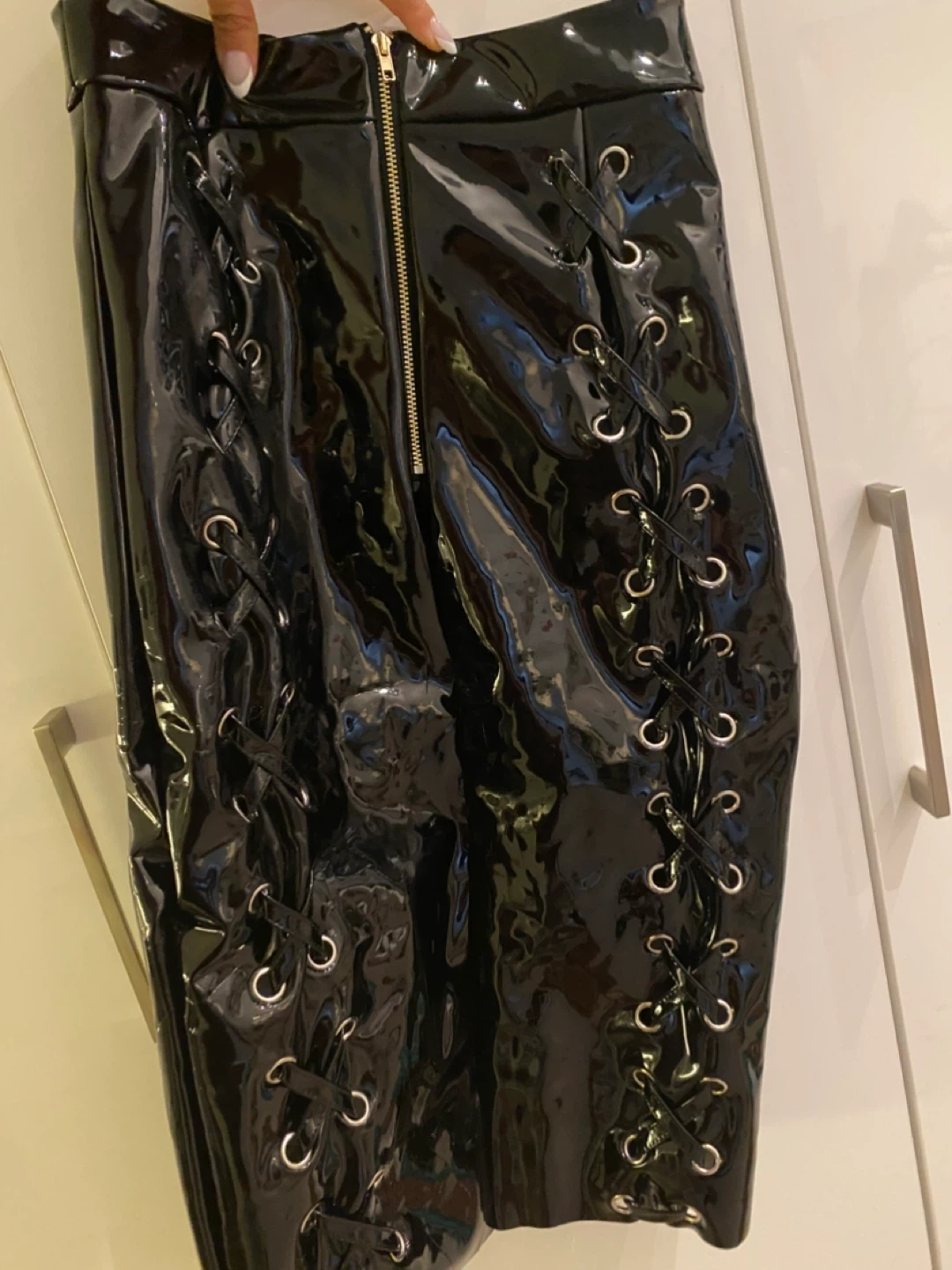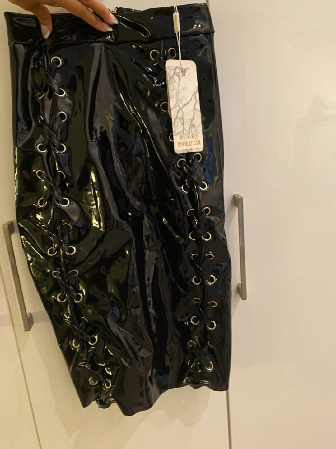 Selling a super stylish Oh Polly skirt! It's a black patent skirt with a lace-up design on the sides. The size is US 4.