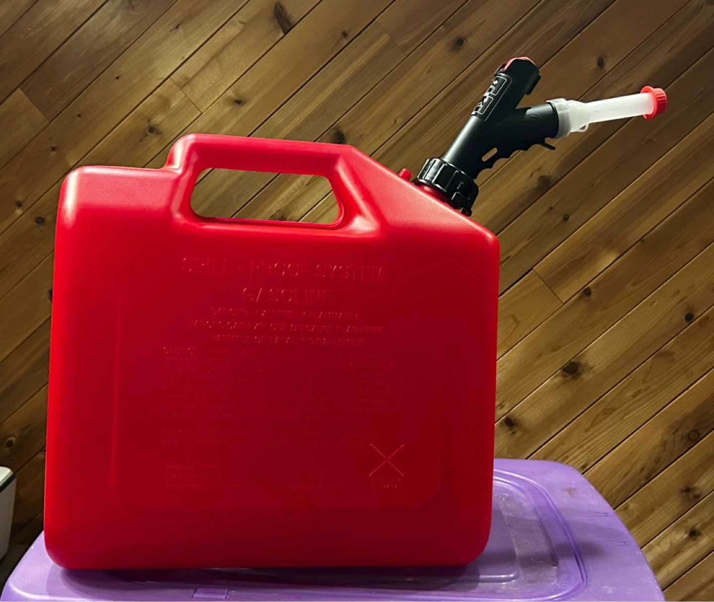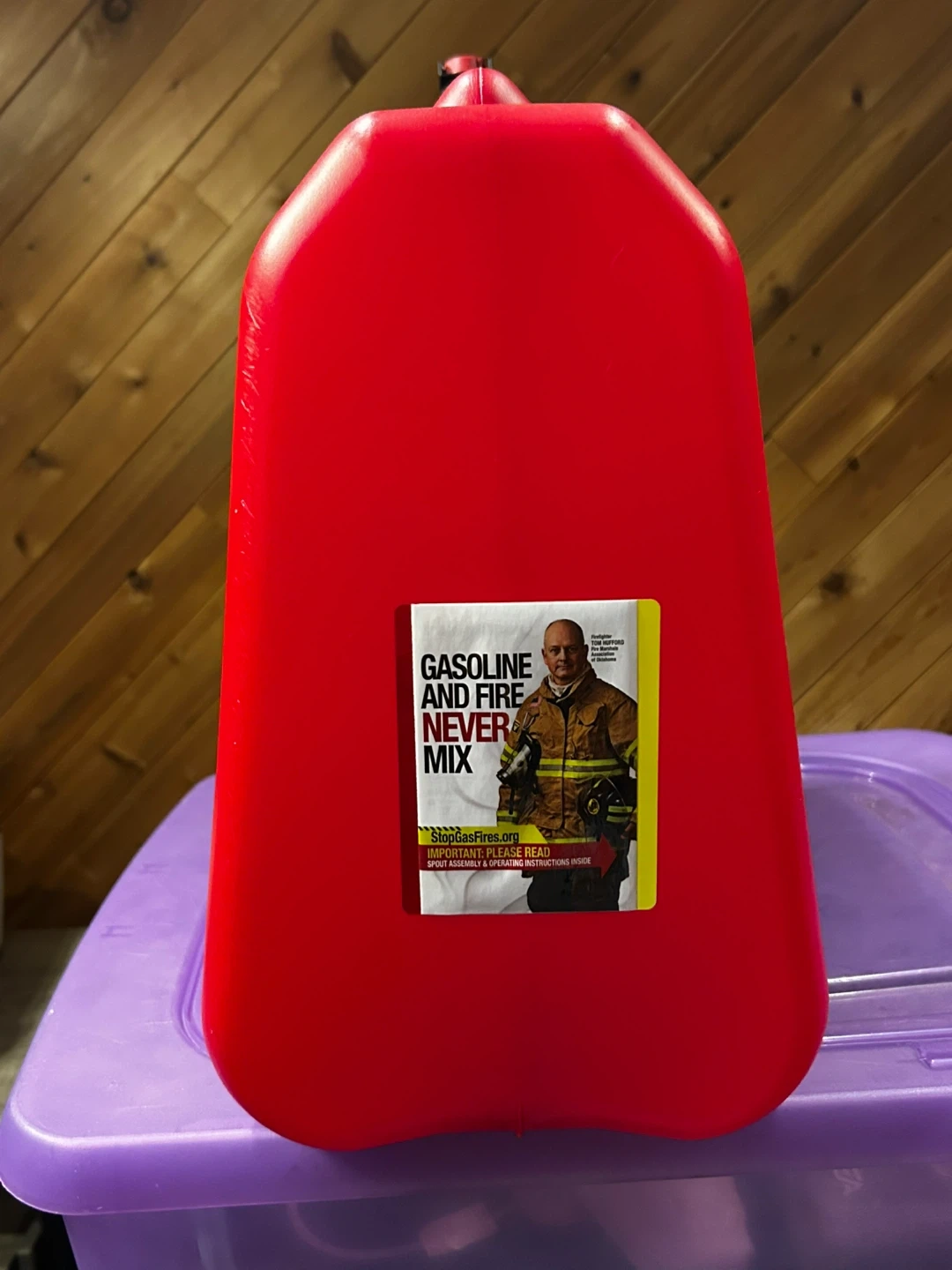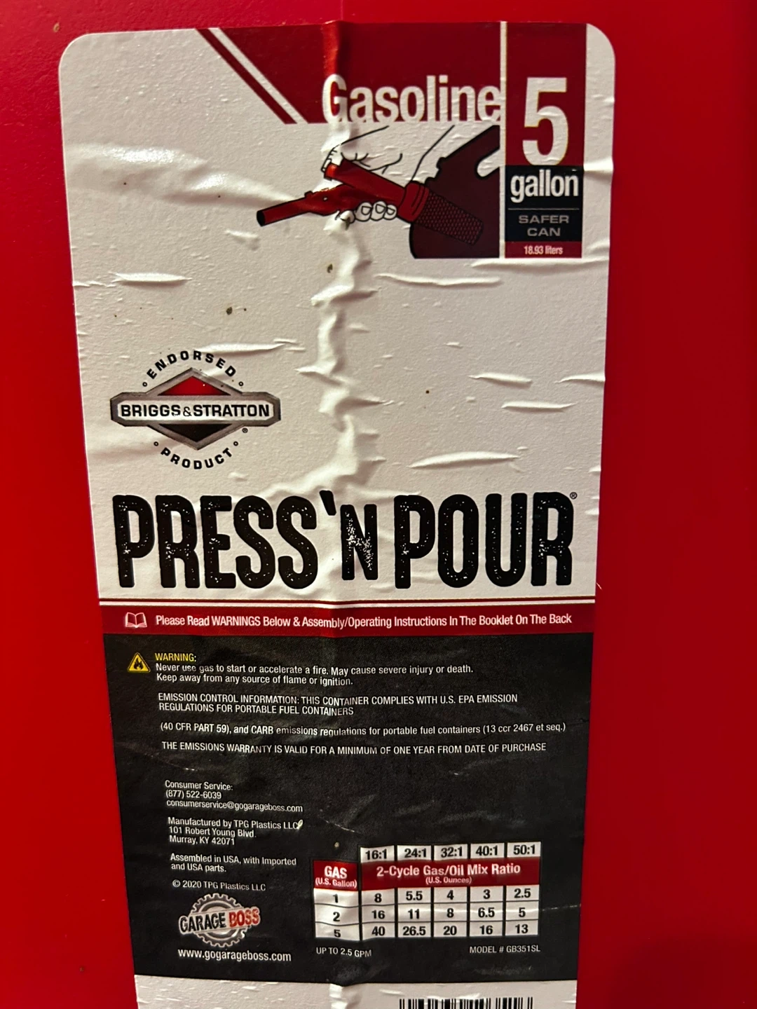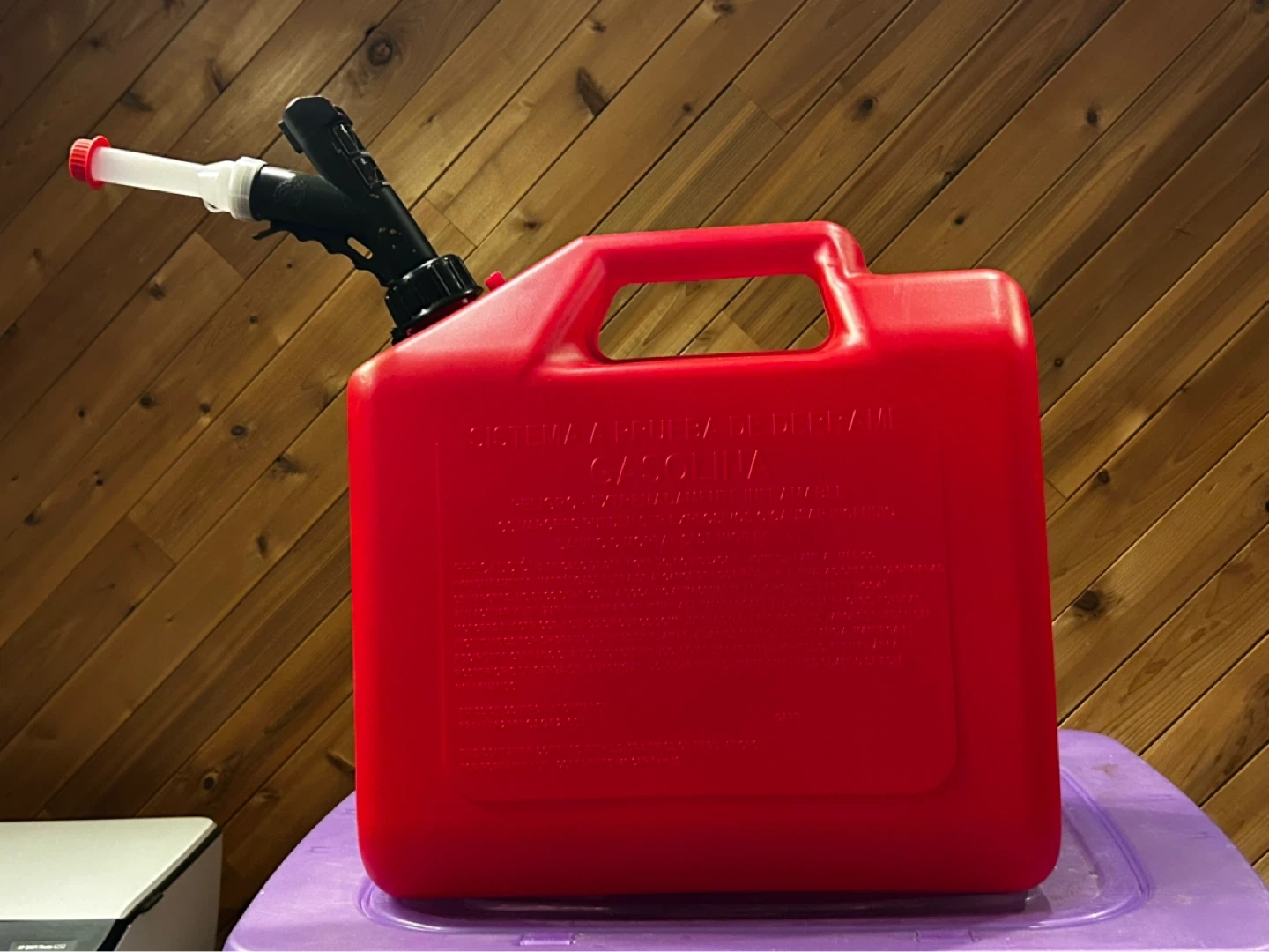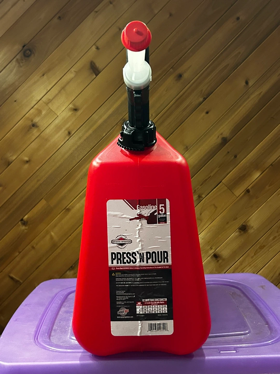 Brand new 5-gallon gasoline container with press ‘n pour spout system for controlled, spill-resistant pouring.