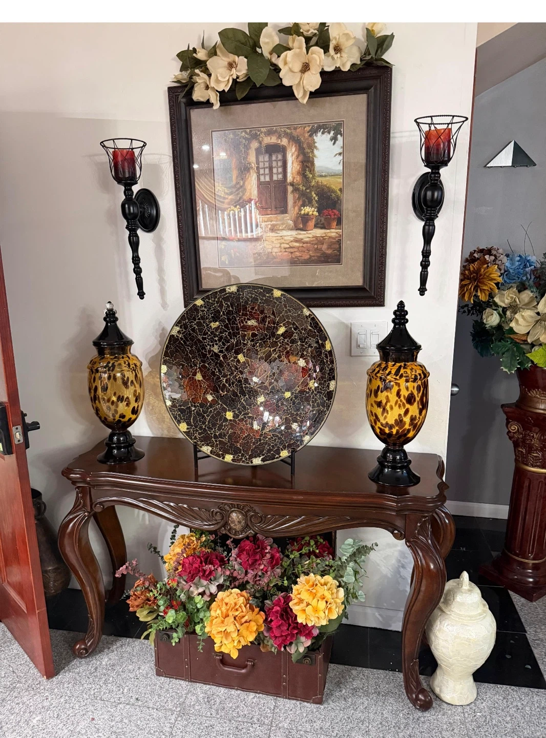 This decorative bowl features a mosaic pattern with brown and gold tones. It's designed to be a centerpiece or accent piece for your home decor. The bowl is made of glass and metal.