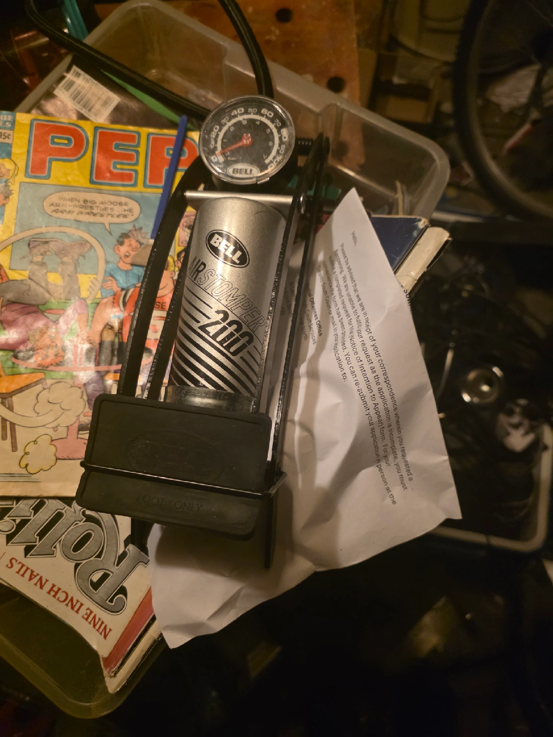 Selling a Bell Airstomper 200 foot pump! It's in good condition and ready to help you inflate your tires or other inflatables. The gauge shows pressure in bar, so you can easily monitor the inflation level. Perfect for keeping in your garage or taking on the go