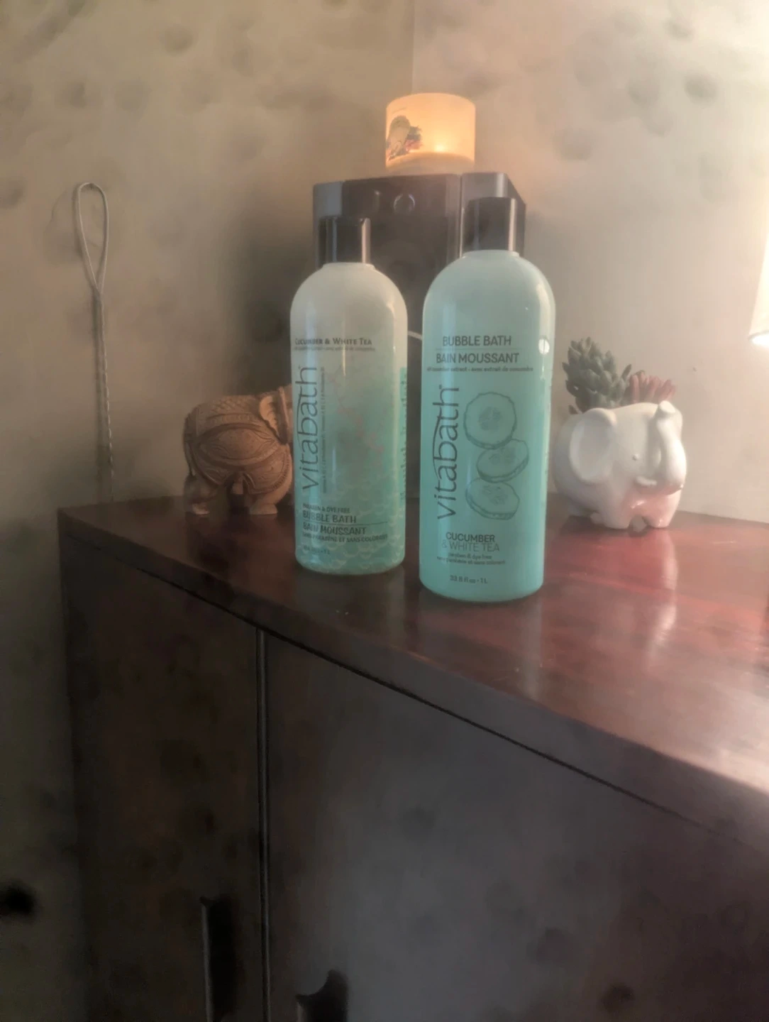 Two bottles of Vitabath bubble bath in Cucumber & White Tea scent. Paraben & dye-free formula. Each bottle contains 1L (33.8 fl oz).