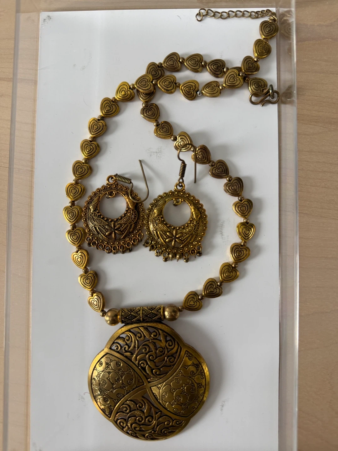This set includes a necklace with a large pendant and matching earrings. The necklace is strung with gold tone beads in a heart shape. It's a lovely statement piece.