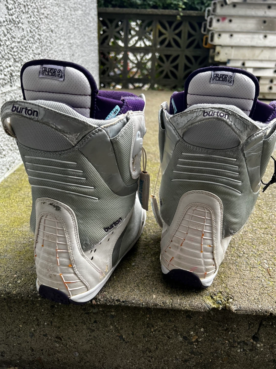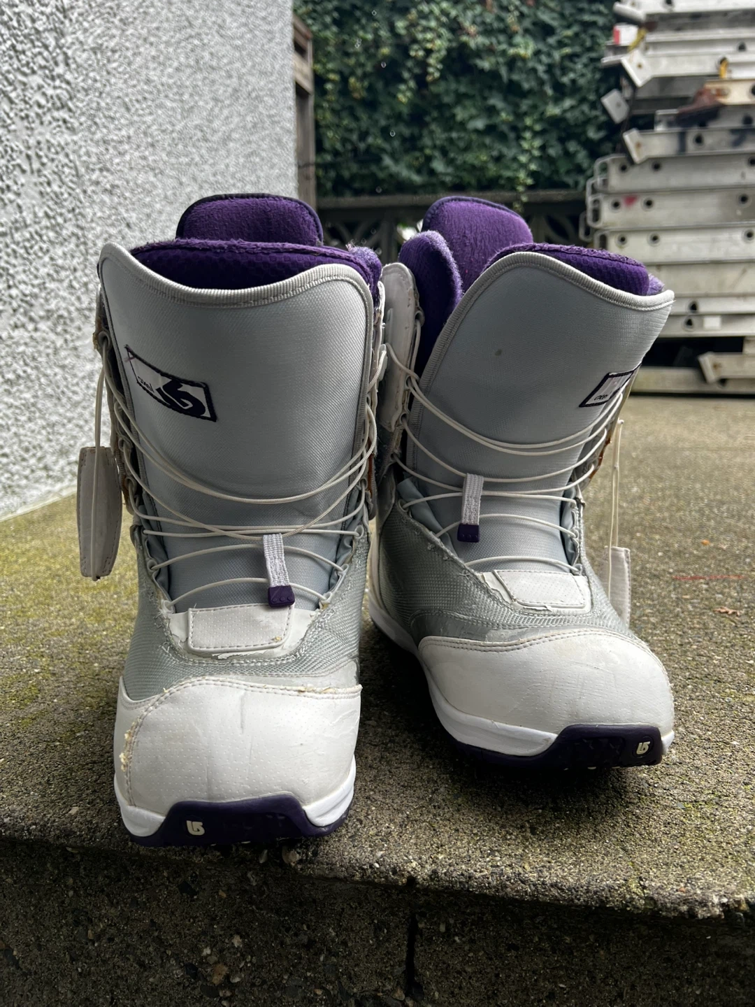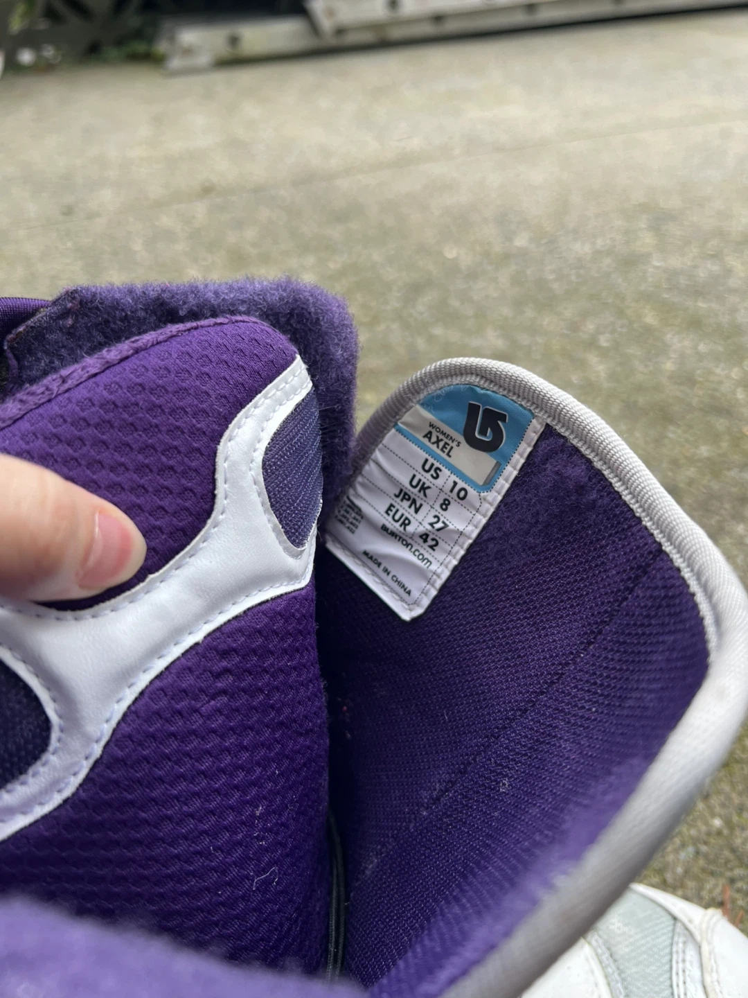 Burton Axel women's snowboard boots. Lace-up closure system. Women's US size 10, UK 8, EUR 42, JPN 27. Colour is grey with purple accents.