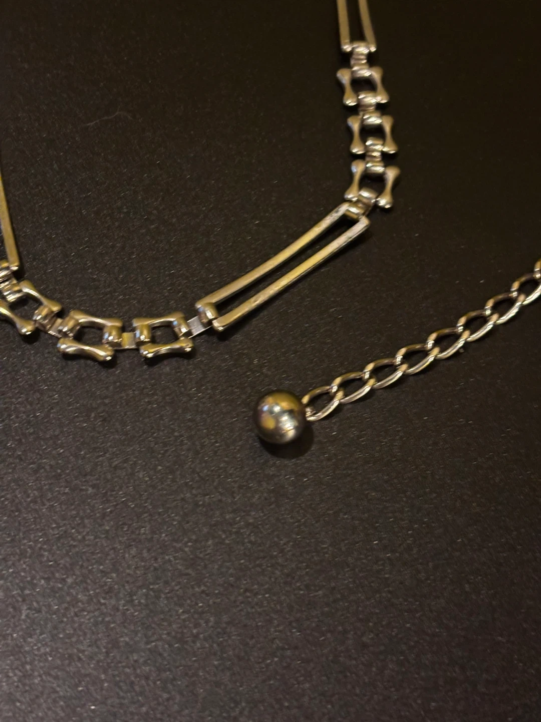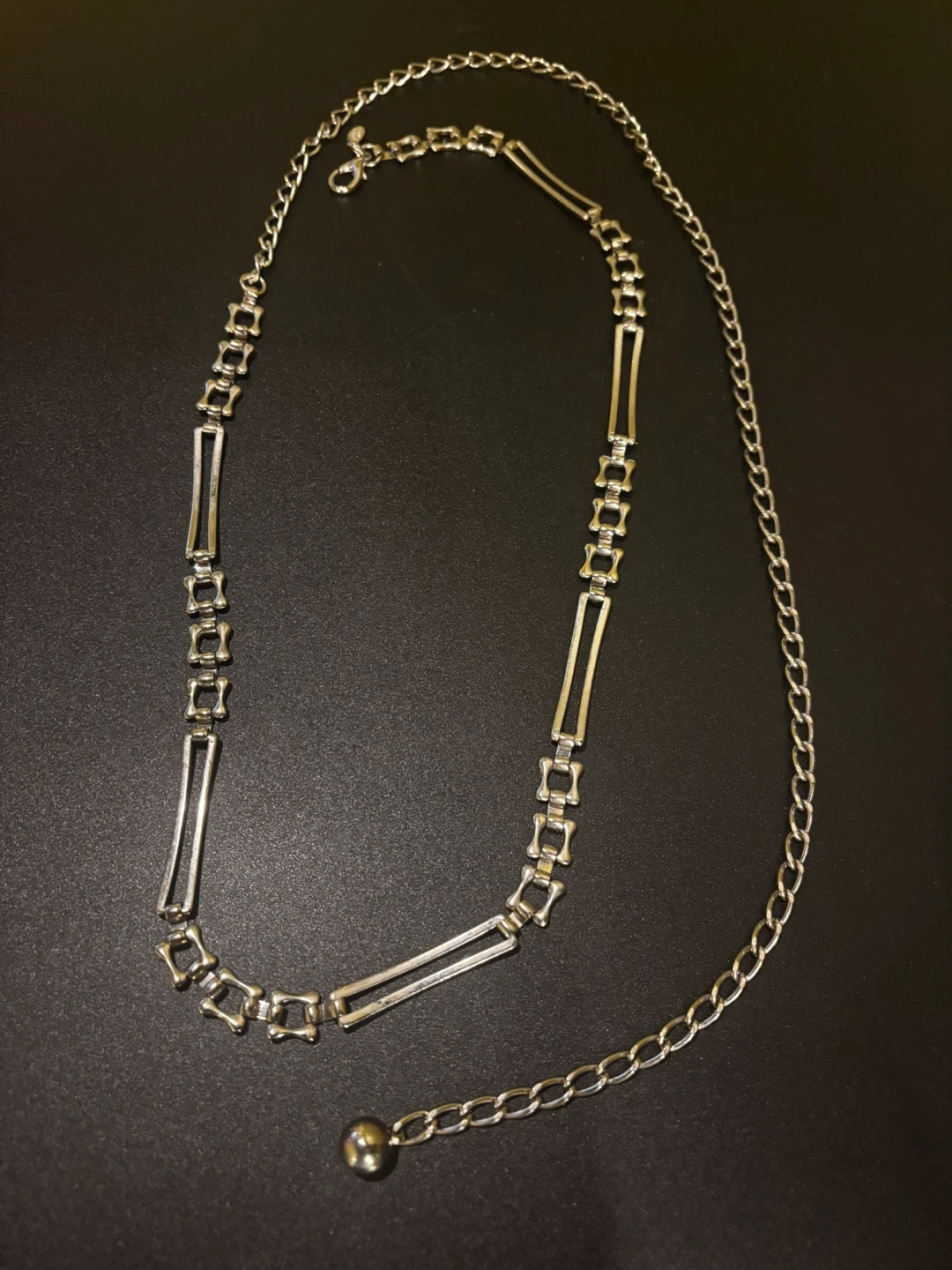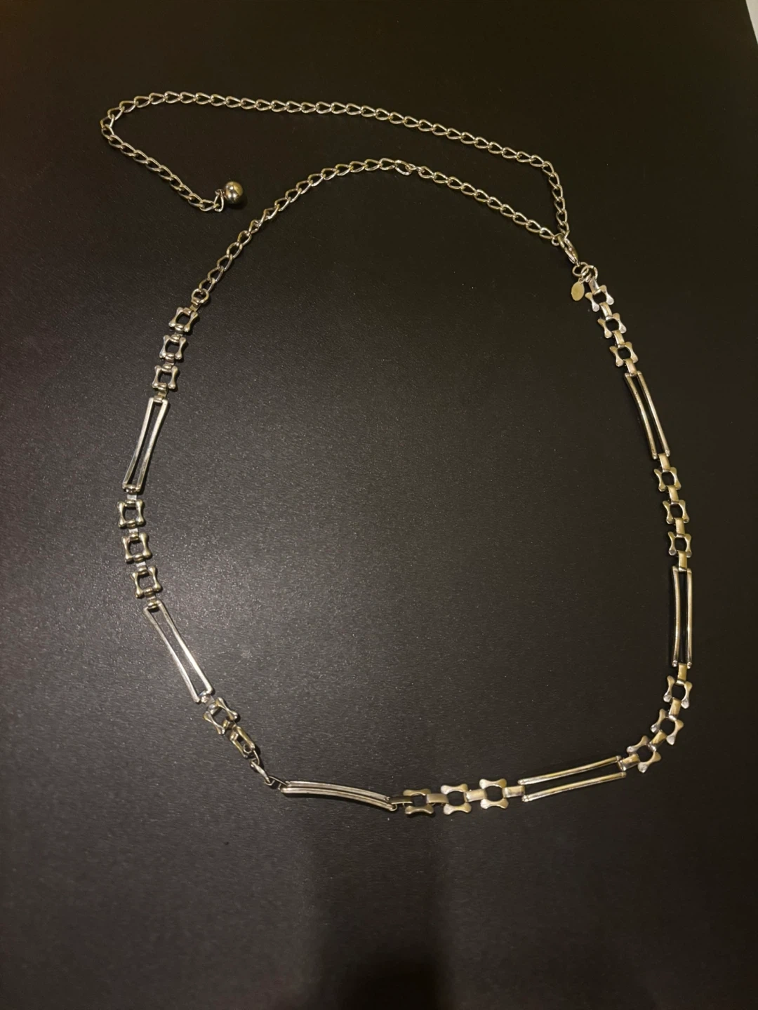 This silver tone chain belt features a unique geometric link design with elongated rectangular accents. It includes a clasp closure and a dangling ball accent. It's a stylish accessory for dresses or tunics. 45” long.