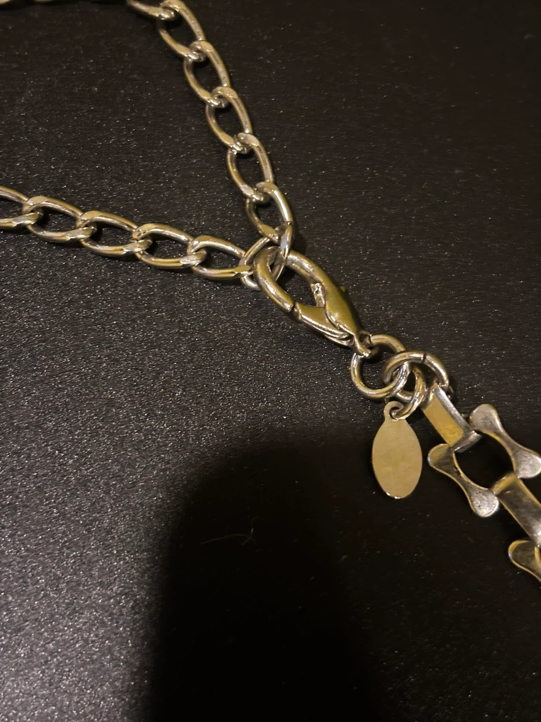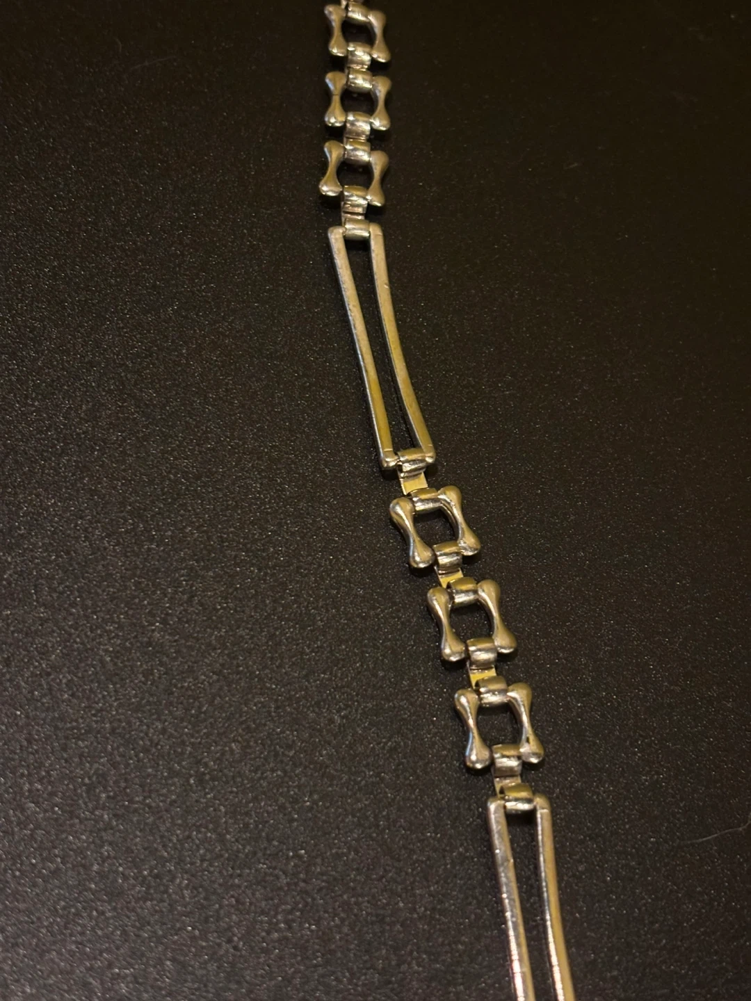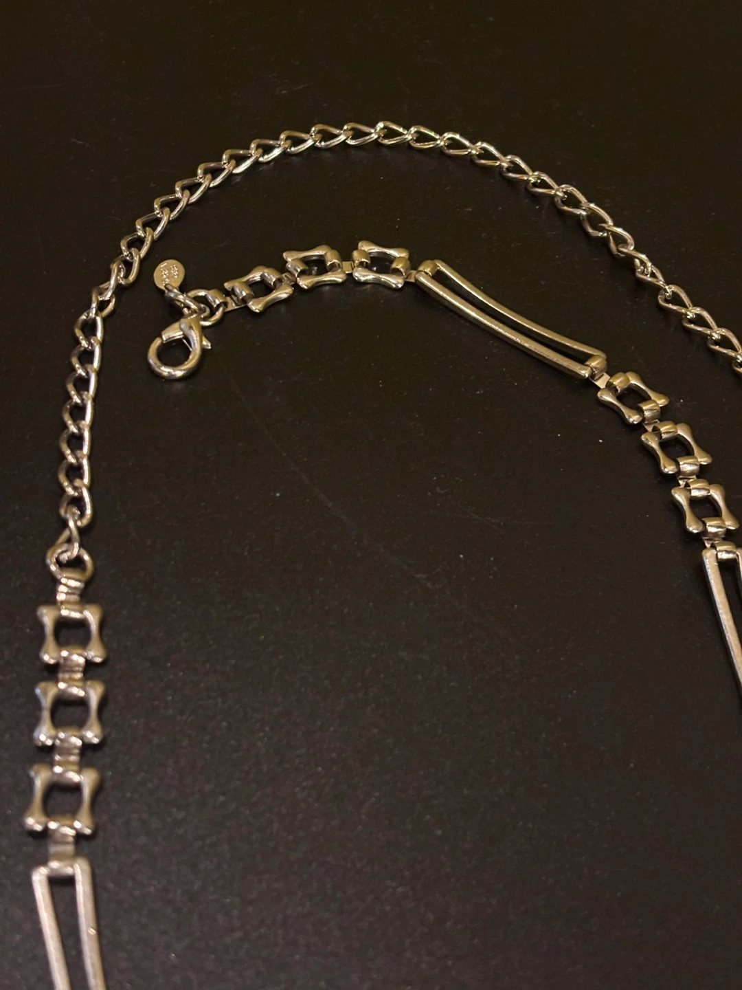 This silver tone chain belt features a unique geometric link design with elongated rectangular accents. It includes a clasp closure and a dangling ball accent. It's a stylish accessory for dresses or tunics. 45” long.