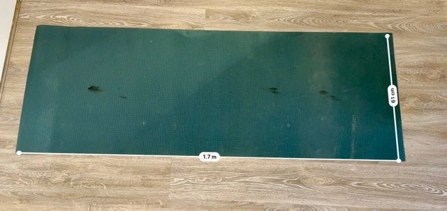 Green yoga mat, 1.7 meters long and 61 cm wide. The mat has some dark marks on its surface which should be cleaned. Collect from St Clair - Yonge.