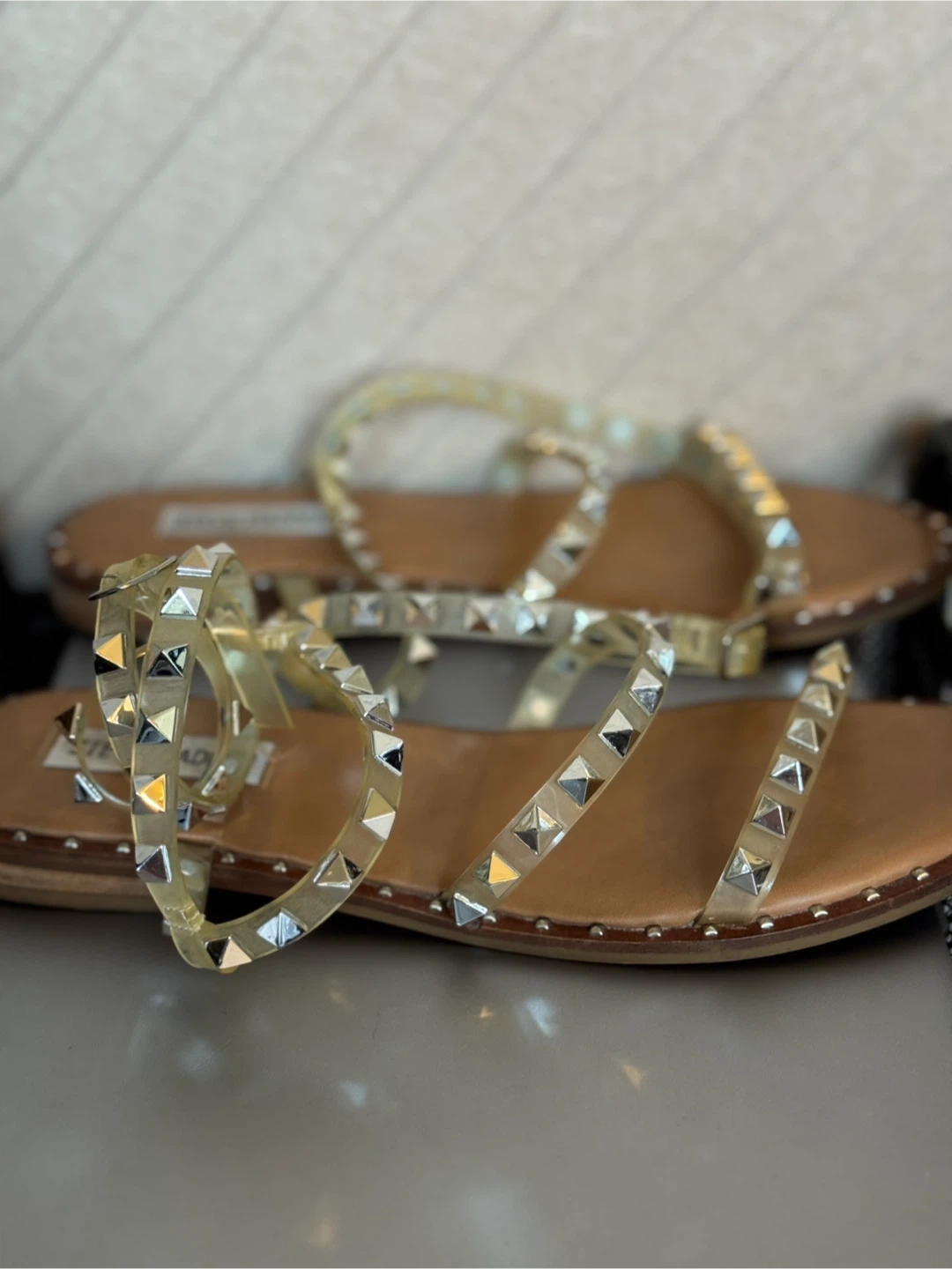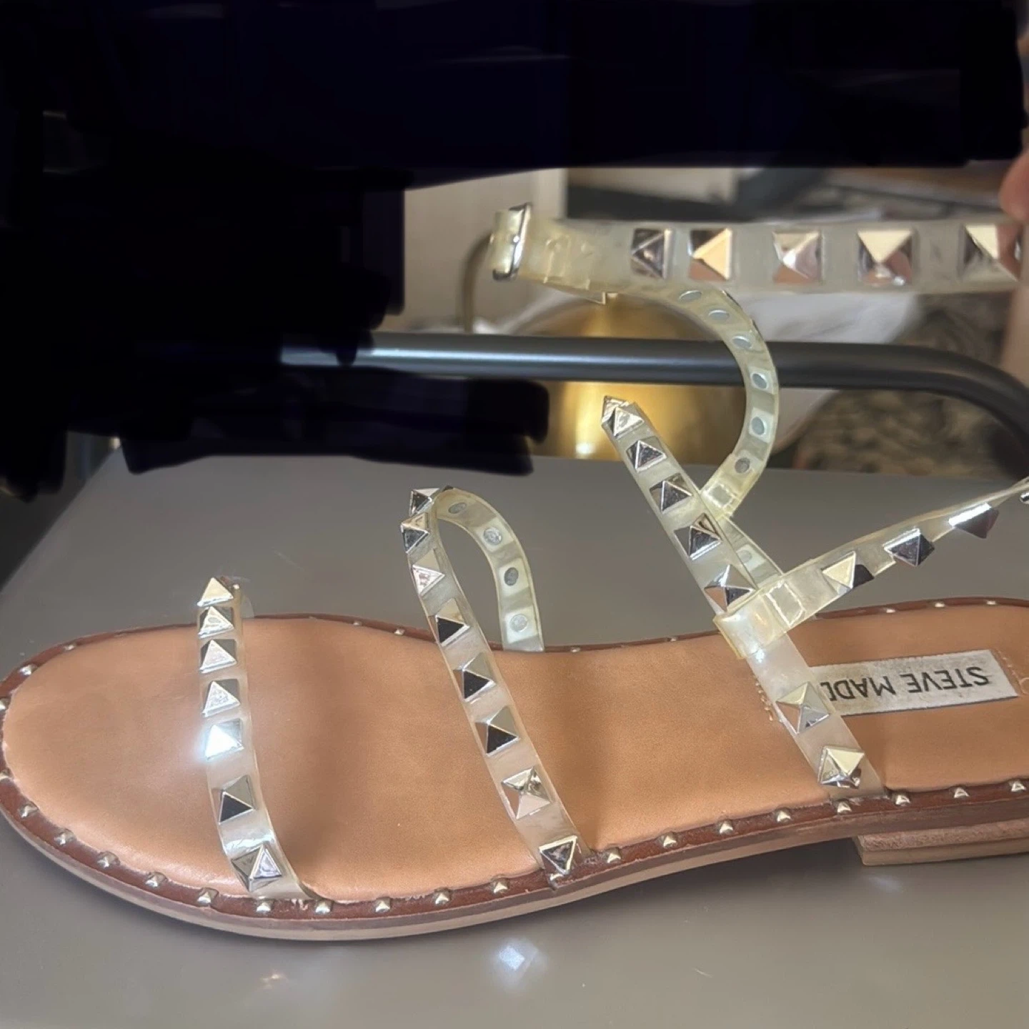 Steve Madden studded clear strap flat sandals. Features multiple clear straps with silver-tone stud details. Buckle closure for adjustable fit.