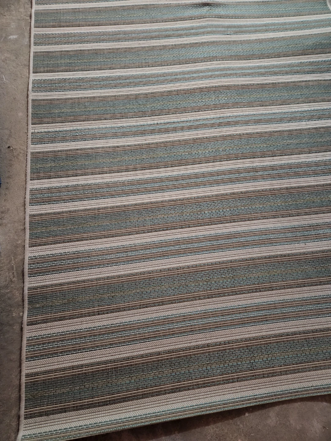 This durable rug features a classic striped pattern in neutral tones. It's suitable for both indoor and outdoor spaces. Woven material for lasting use.cash only