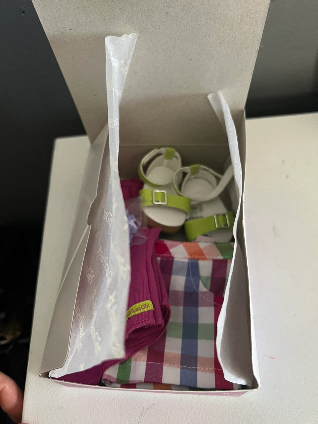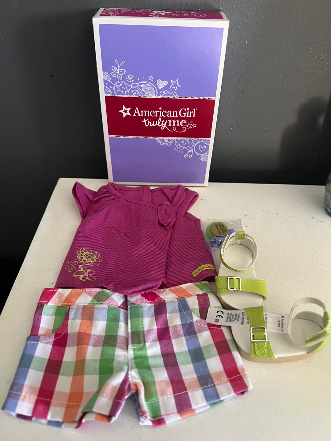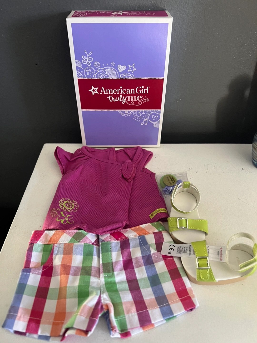 This is a Truly Me doll outfit with a pink top, plaid shorts, and white sandals with lime green straps. It comes in its original American Girl box. The outfit includes a hanger accessory.