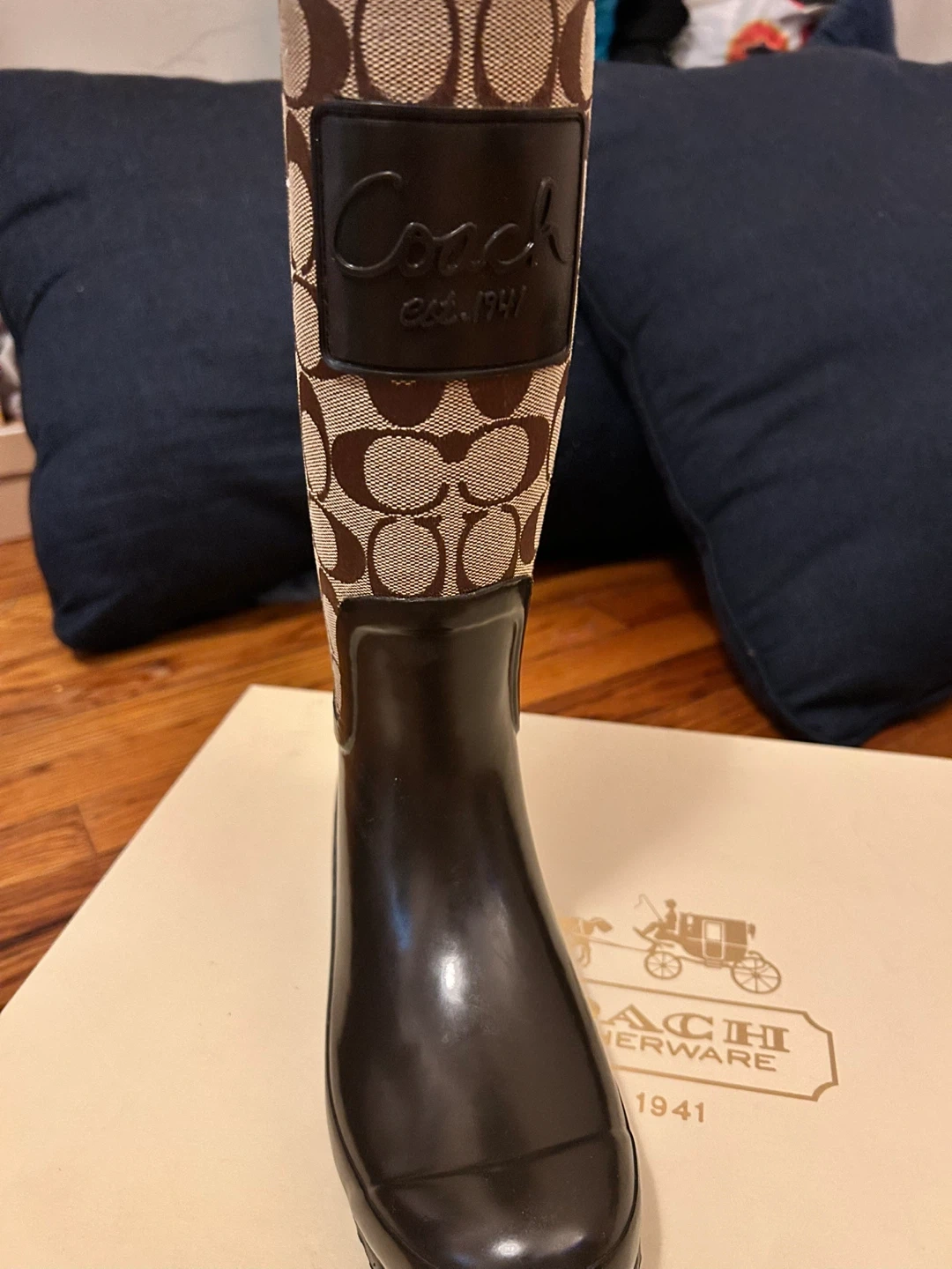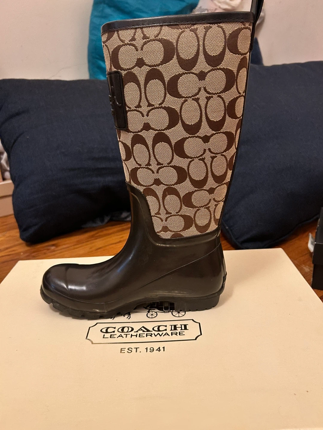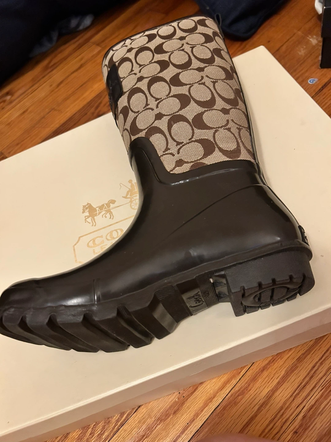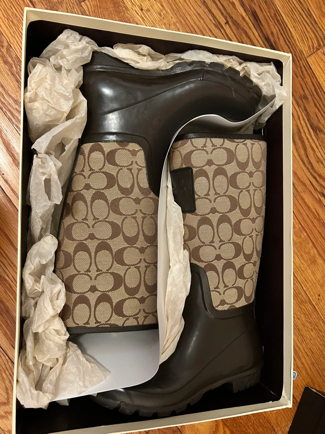 These Coach rain boots feature the signature C logo print and a dark brown rubber lower. They come in their original box. Perfect for keeping feet dry and stylish in wet weather! Fresh condition & never worn.