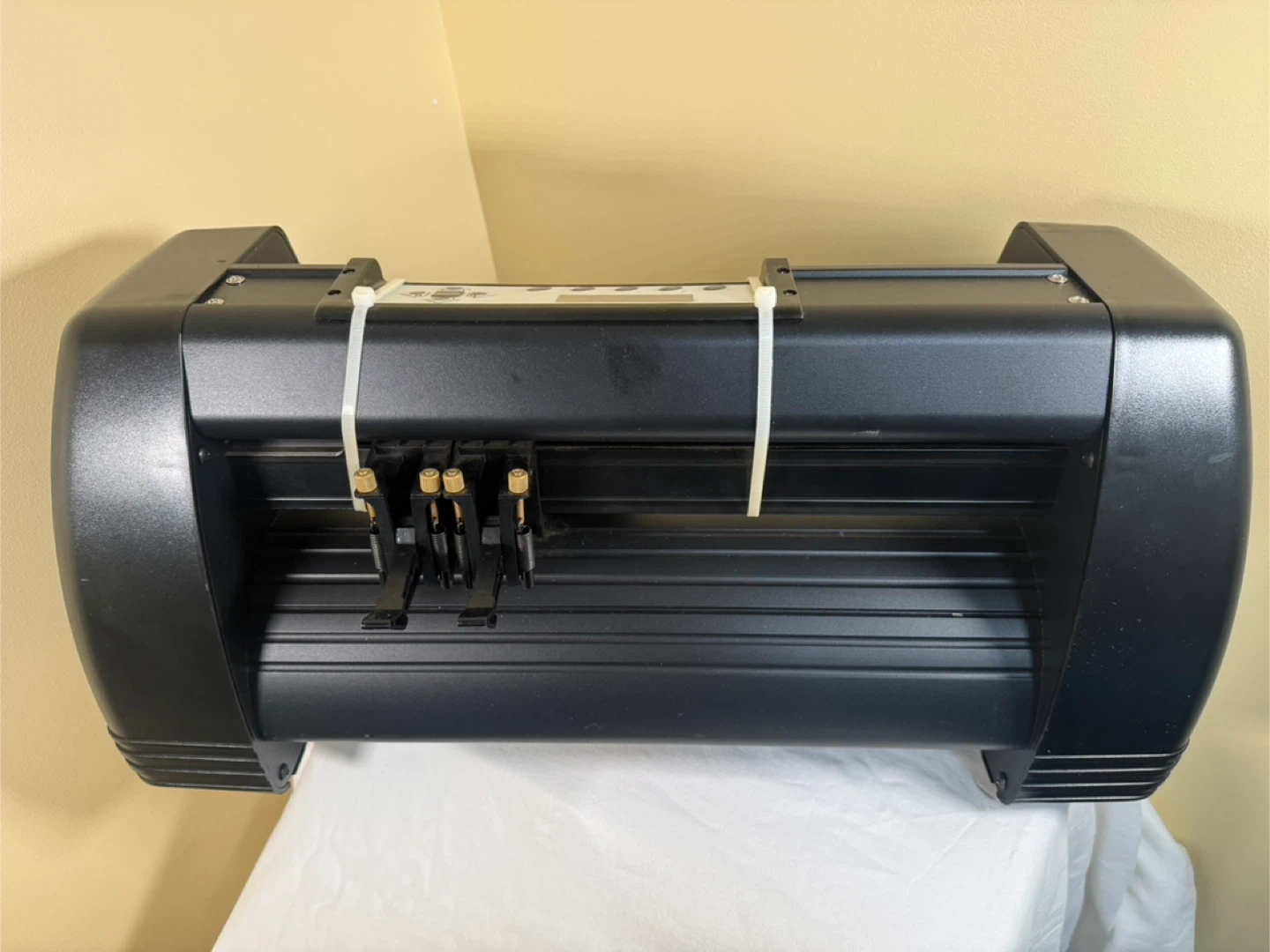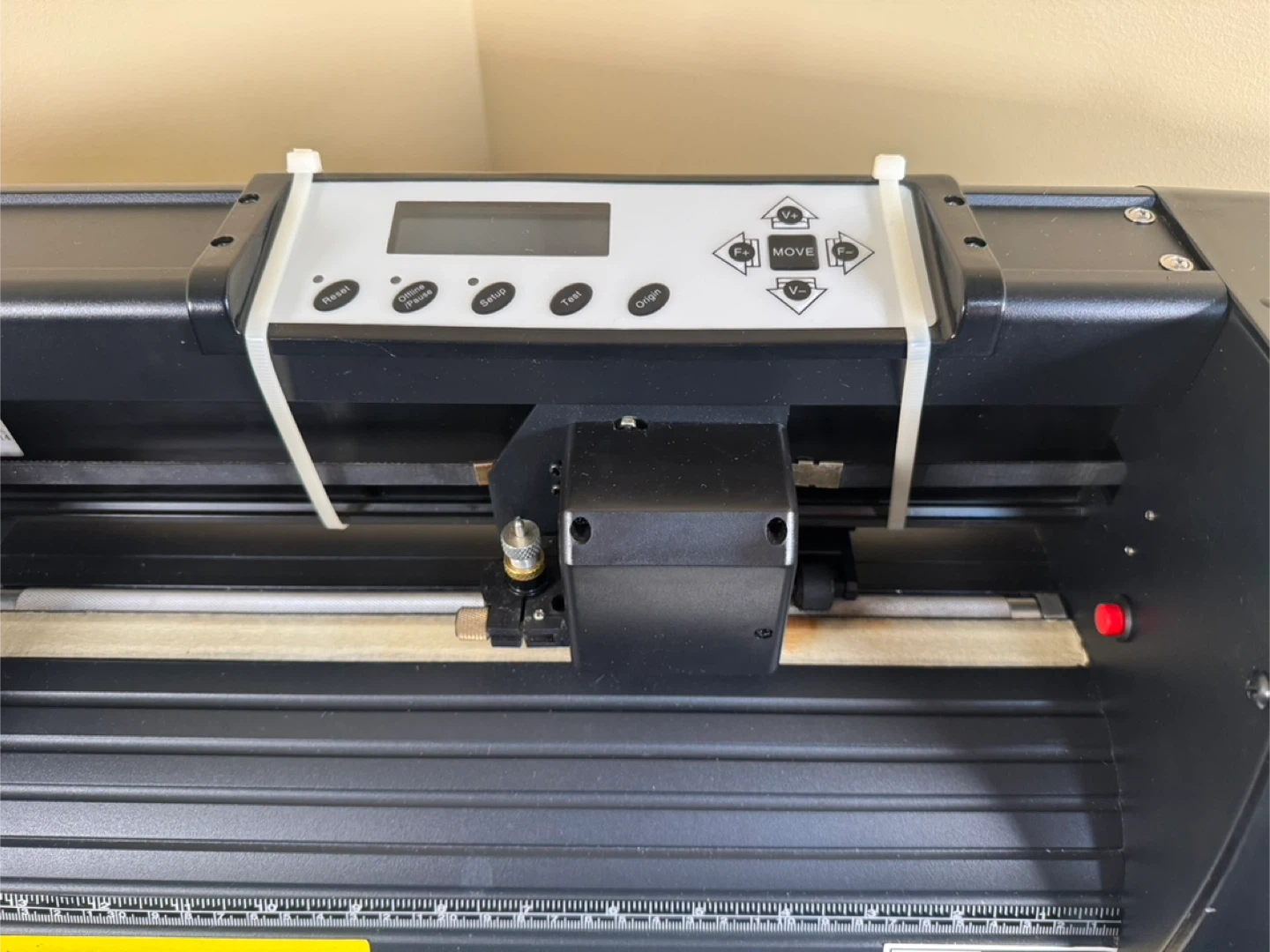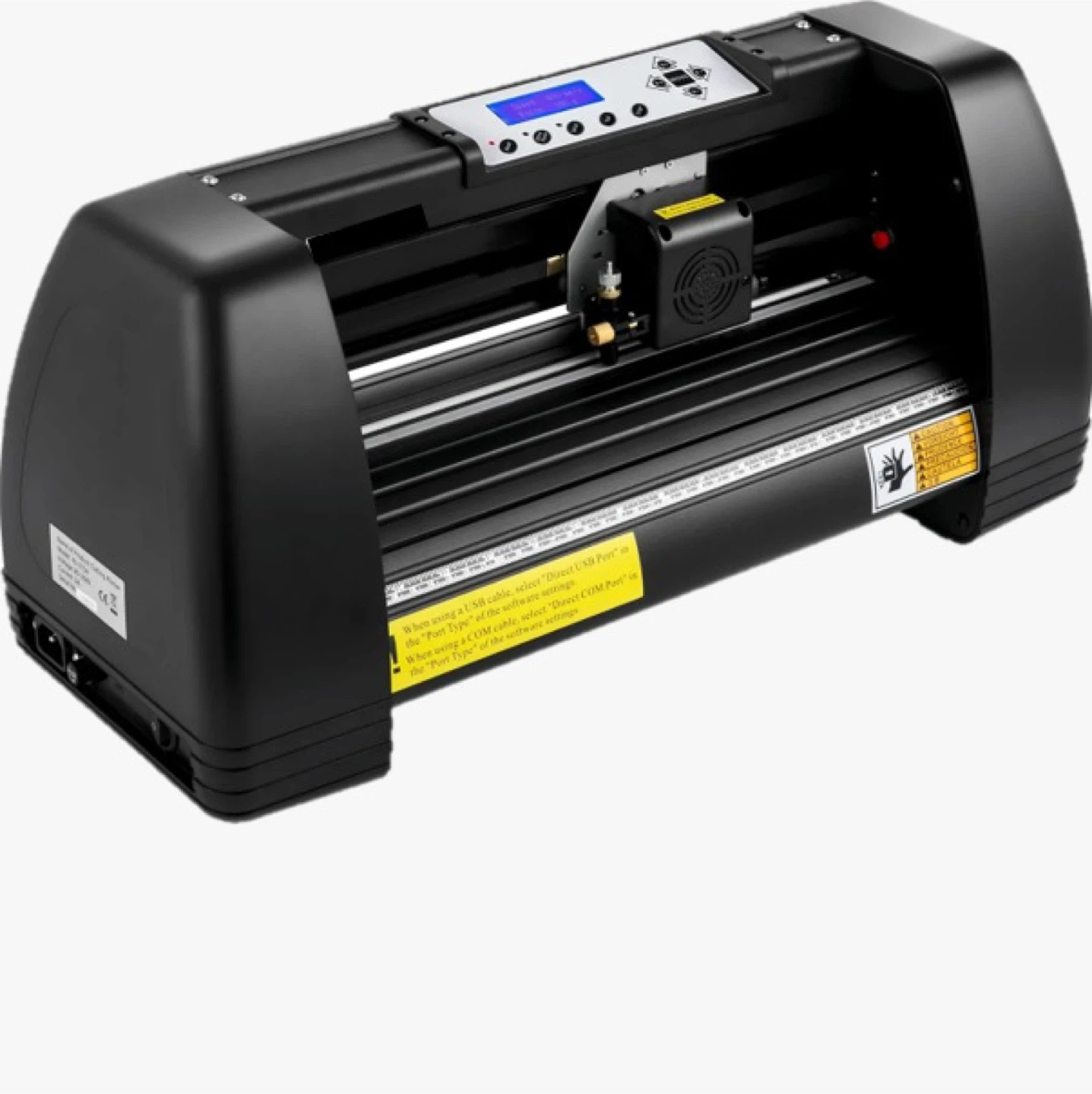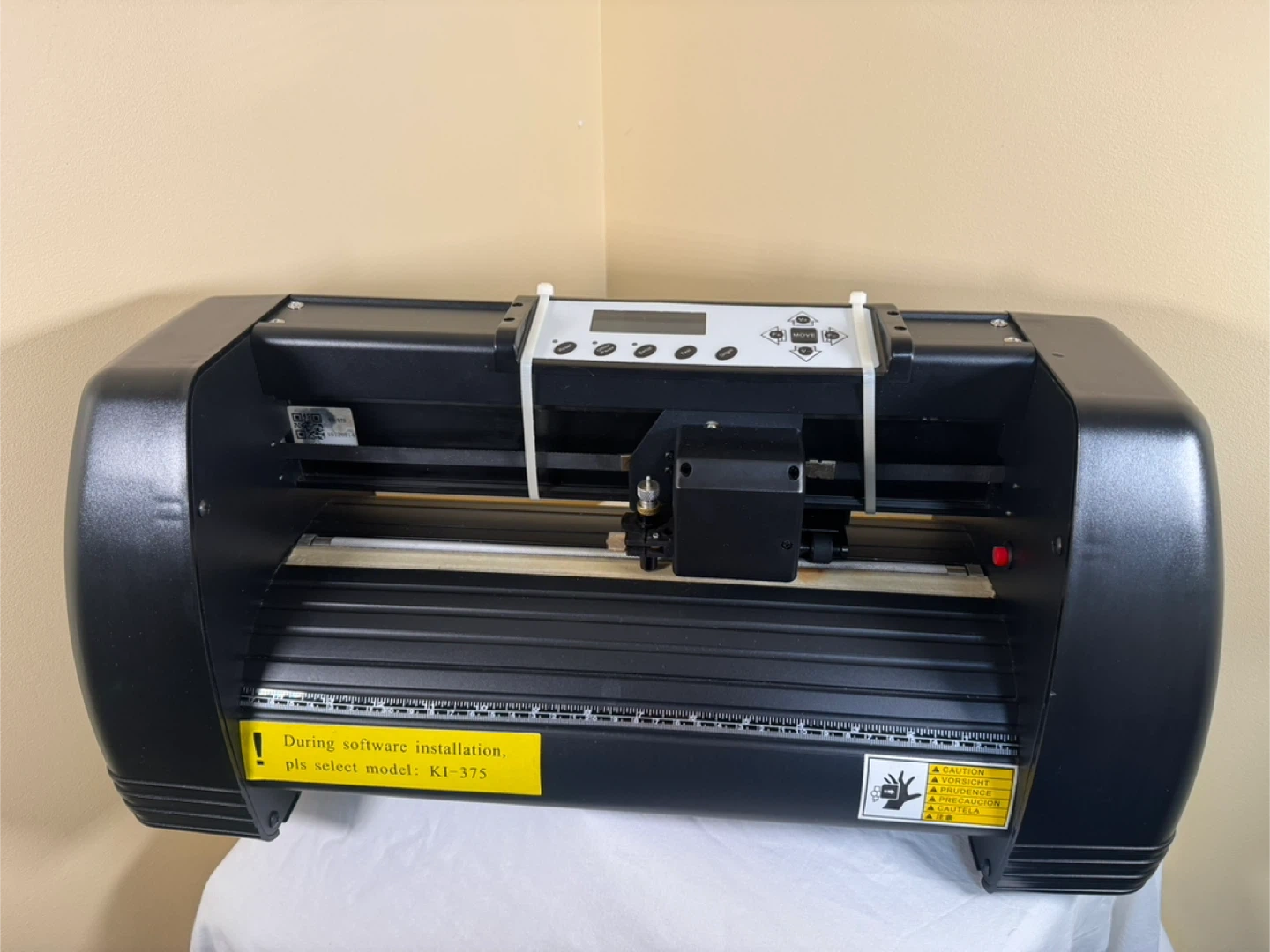 Máquina cortadora de vinilo modelo KI 375. vinyl cutter plotter machine. Features LCD display and adjustable pinch rollers. Max cutting width is 11.2" and max feed width is 14.8". Cutting speed up to 31.5ips with a cutting force of 1.1lbs.