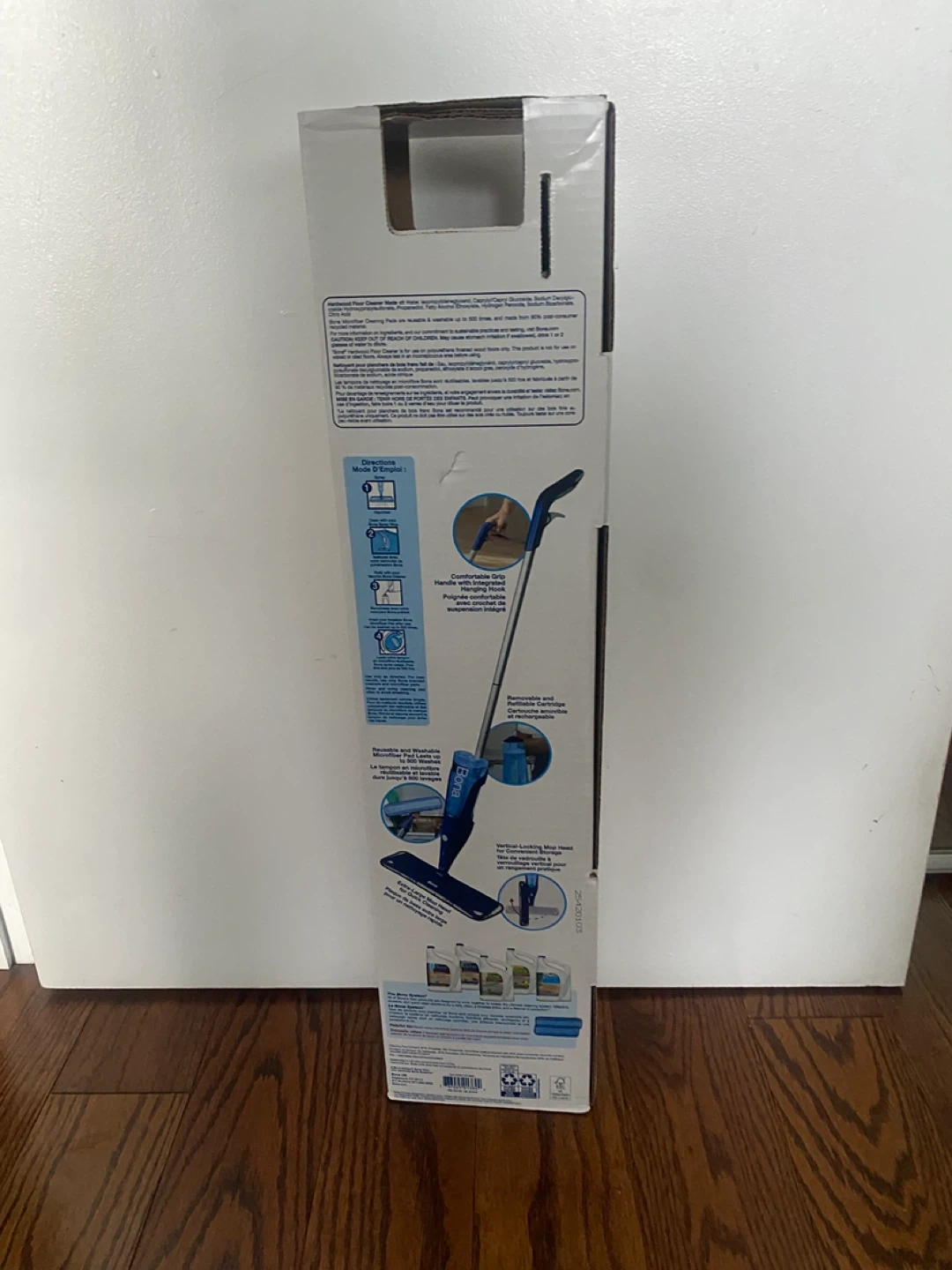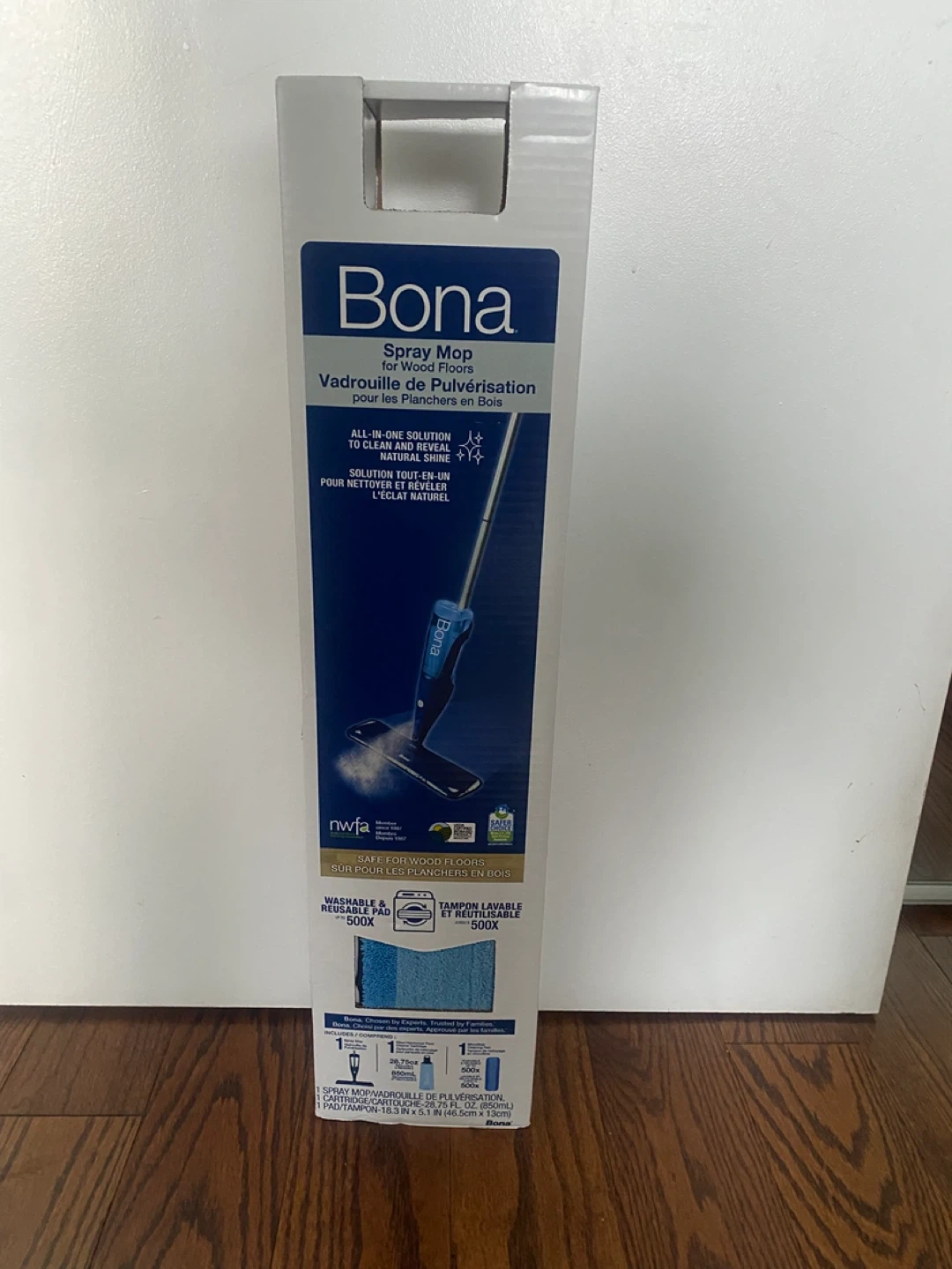 This Bona spray mop is designed for hardwood and engineered hardwood floors. It's an all-in-one solution for cleaning and revealing natural shine. The mop includes a washable cleaning pad. New in box