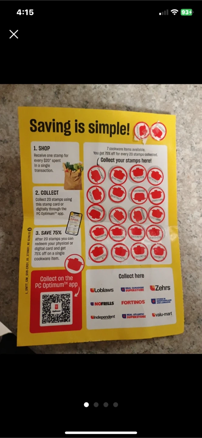 This is a stamp card sheet for PC Optimum, offering 75% off on cookware items with 20 stamps. Collect stamps with every $20 spent. It can be redeemed physically or digitally via the PC Optimum app. Available at Loblaws, Zehrs, No Frills, Fortinos, and other participating stores.