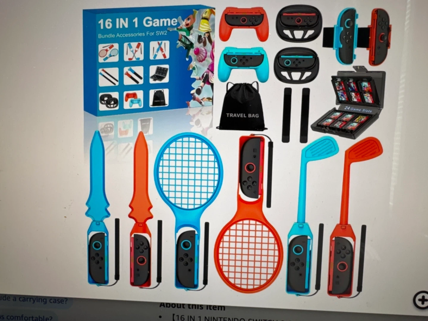 This 16-in-1 accessory bundle includes various grips, controllers, and cases for Nintendo Switch games. It comes with a travel bag for storage and a case with 24 game slots. Accessories are designed for sports and action games.