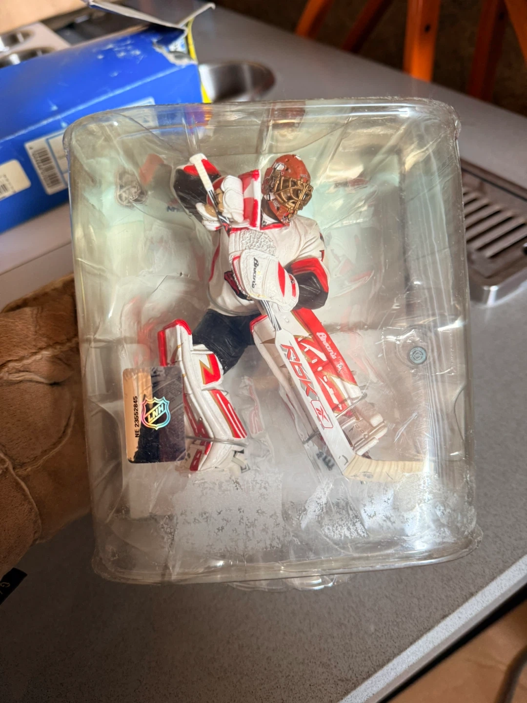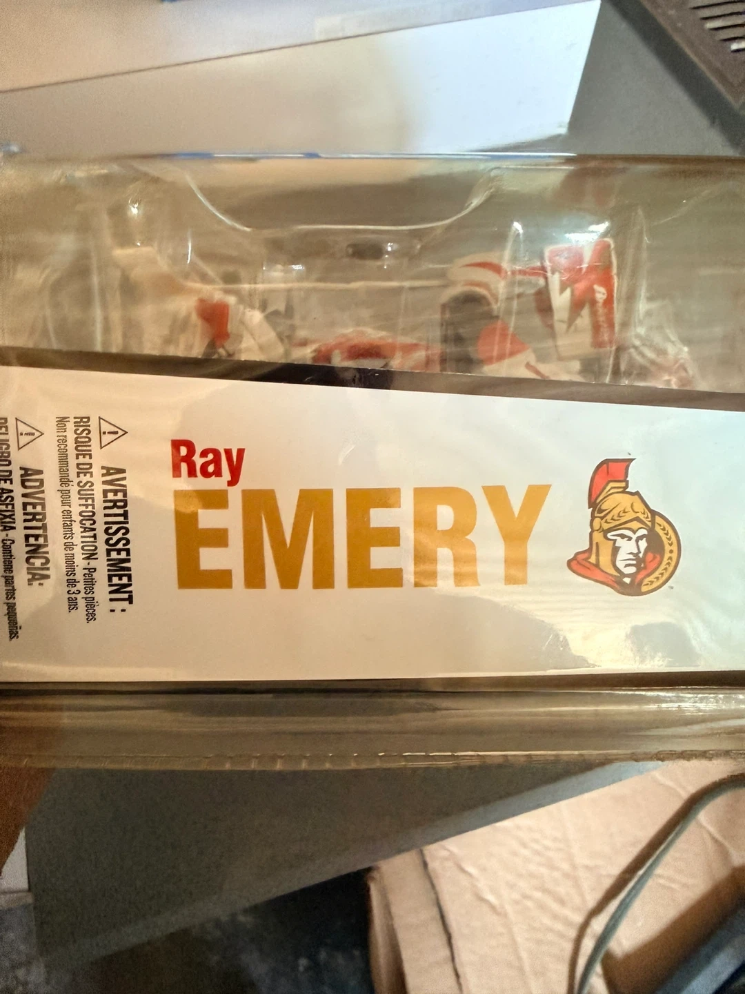 This is an action figure of NHL player Ray Emery. It depicts him in his Ottawa Senators goalie gear. The figure comes in its original packaging.