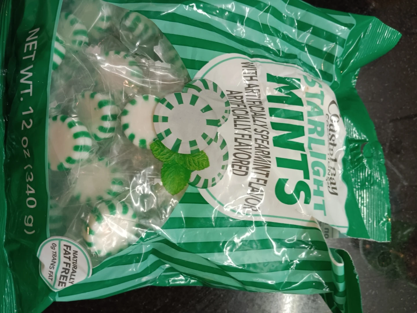 Coastal Bay Starlight Mints with artificially spearmint flavor. Bag contains 12 oz (340 g) of mints. Naturally fat-free with 0g trans fat.