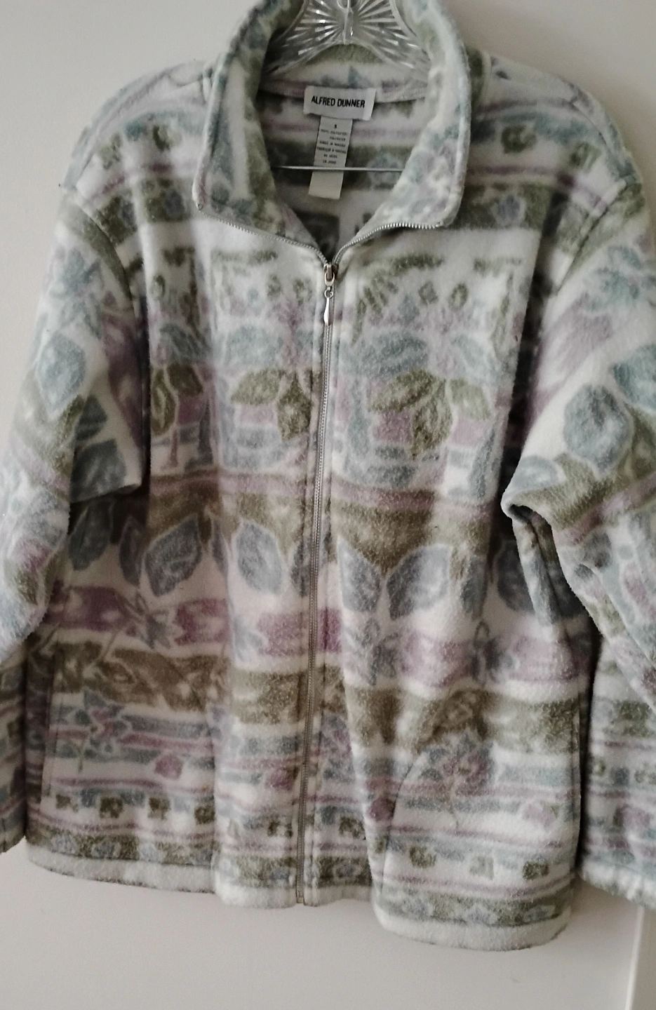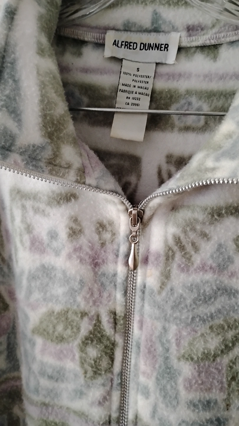 Women's size small zip-up fleece jacket. Soft, warm, and cozy. Features an abstract patterned design in muted greens, purples, and whites. Excellent for layering or wearing on its own.